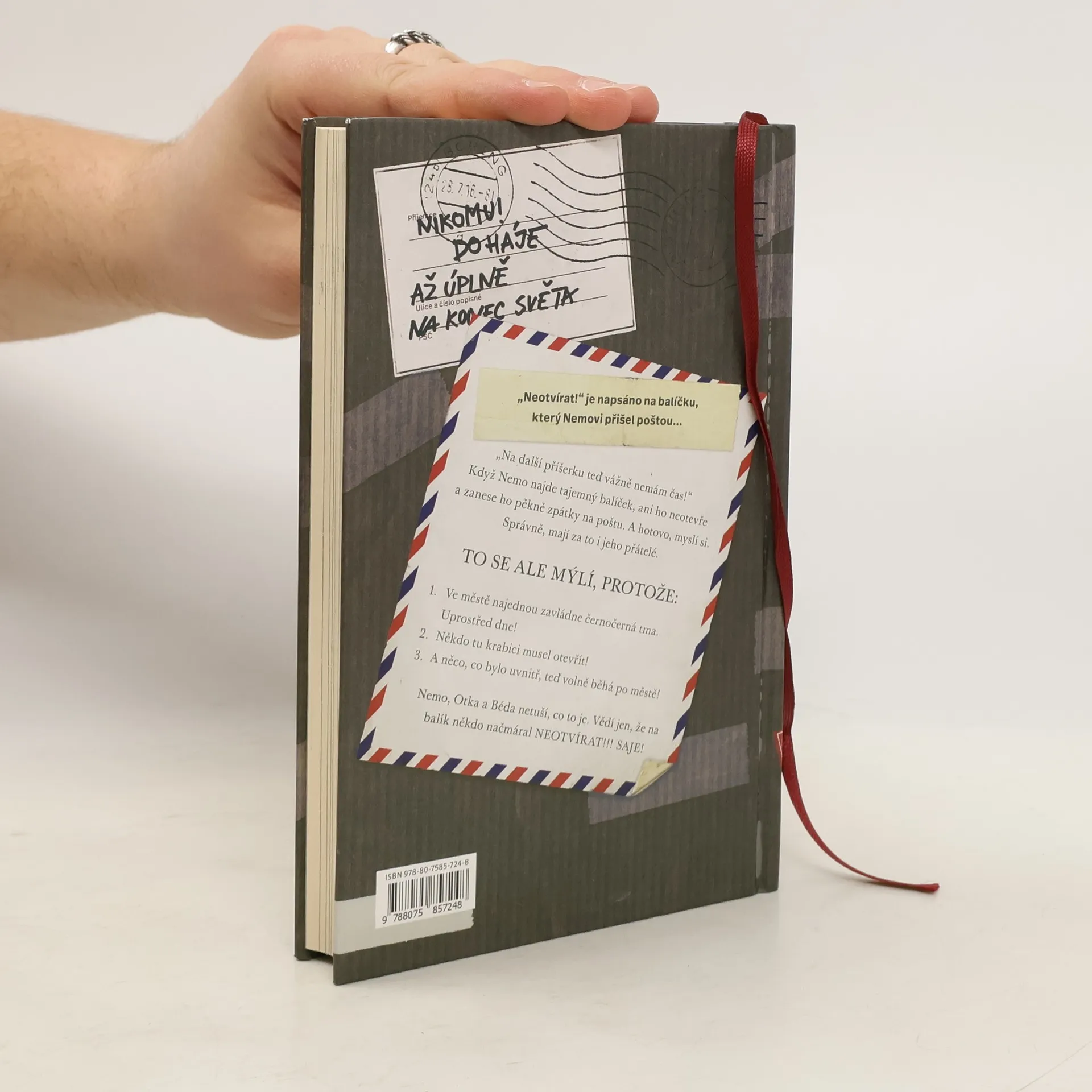 Nemo už toho má dost! Zrovna teď, když se musí učit na písemku z matematiky! Na další příšerku teď vážně nemá čas! Když zase u dveří najde balíček, ani ho neotevře a odnese ho zpátky na poštu. Správně, myslí si on i jeho kamarádi. Ve městě se přesto začnou dít neuvěřitelné věci. Horní Suchopár najednou pohltí černočerná tma. A nejen to. Někdo ten balíček musel otevřít! A to, co bylo uvnitř, teď běhá po městě! Nemo, Otka a Béda vůbec netuší, co to je. Vědí jen, že na balík někdo načmáral: „Neotvírat! Saje!“ Všichni dostanou strach. Co teď? První dva díly z řady Neotvírat! měly u dětských čtenářů úspěch. Teď je tu třetí díl. Tajemné, možná i trochu strašidelné dobrodružství tří přátel - Nema, Otky a Bédy, kteří se ze všech sil snaží zachránit město. Příběh o kamarádství a o věcech, které jsou opravdu důležité, potěší nejen dětské čtenáře. Svým vtipem a nezaměnitelnými ilustracemi Fréderica Bertranda kniha pobaví i rodiče, kteří při čtení na dobrou noc určitě neusnou...