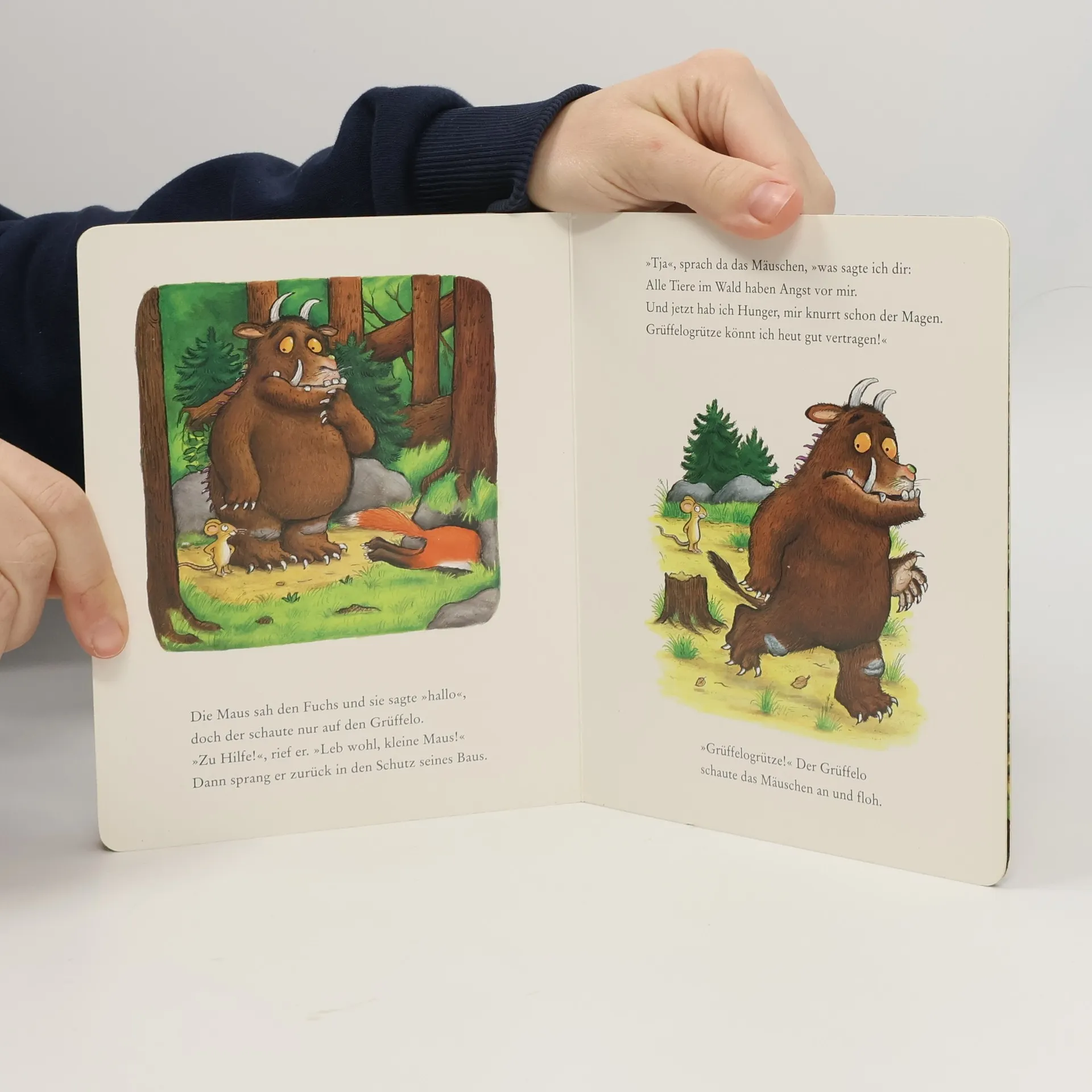 Das erfolgreiche Bilderbuch von Axel Scheffler & Julia Donaldson, in dem die kleine Maus den großen Grüffelo überlistet, endlich als Papp-Bilderbuch. Der große Wald ist voller Gefahren. Da ist es gut, wenn man einen starken Freund hat. Und wenn man keinen hat, muss man einen erfinden. Die kleine Maus droht jedem, der sie fressen will, mit dem schrecklichen Grüffelo. Dabei gibt's Grüffelos gar nicht. Doch dann taucht er plötzlich wirklich auf, und sein Lieblingsschmaus ist Butterbrot mit kleiner Maus. Aber was eine clevere Maus ist, die lehrt auch einen Grüffelo das Fürchten.
