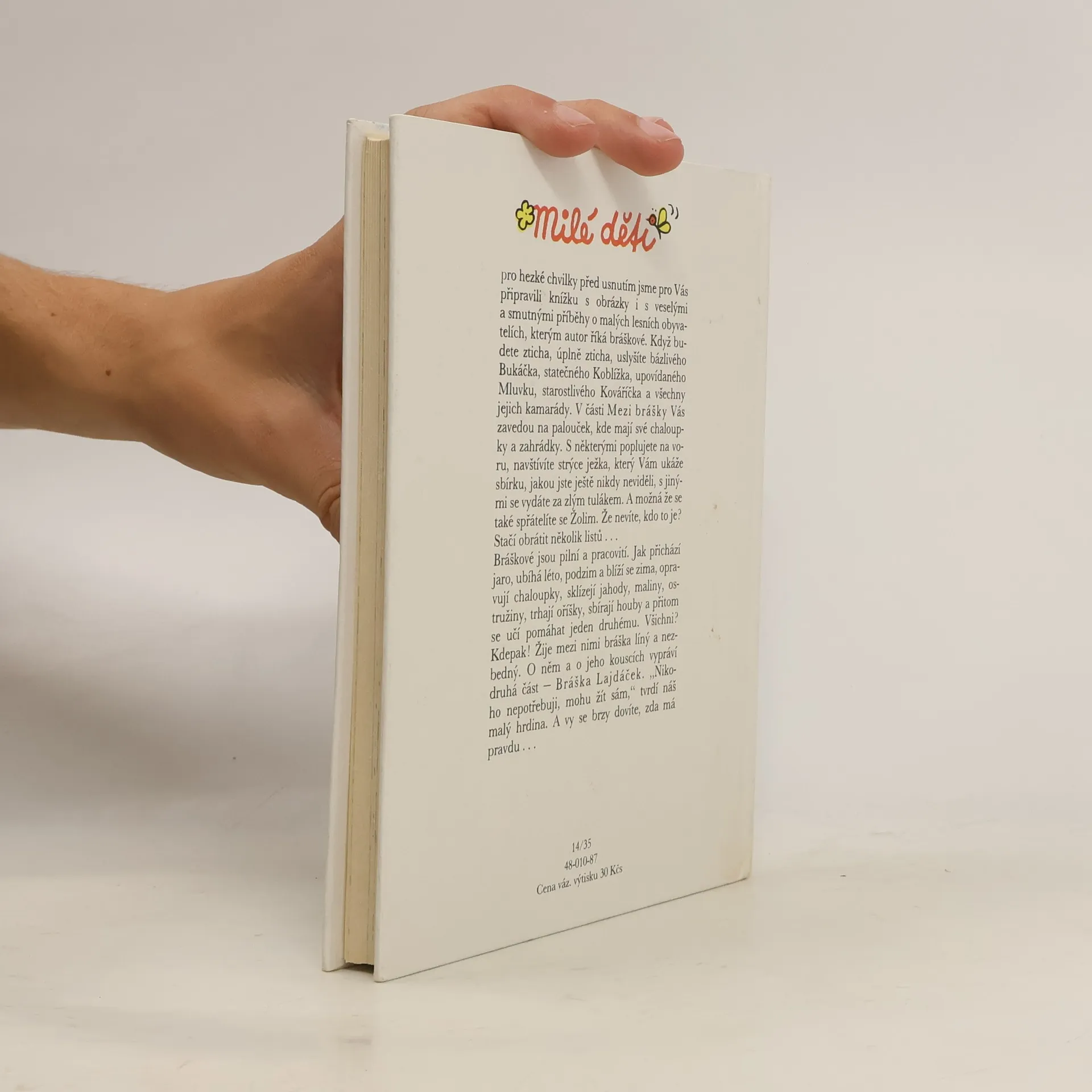 Pohádkové vyprávění pro nejmenší děti, založené na imaginárním světě malých človíčků - brášků, kteří žíjí mírumilovně mezi obyvateli lesa. Oba světy se prolínají, bráškové i zvířátka prožívají nejrůznější příhody a vzájemně si pomáhají. Kniha obsahuje 2 knížky:Mezi brášky - Bráška Lajdáček.