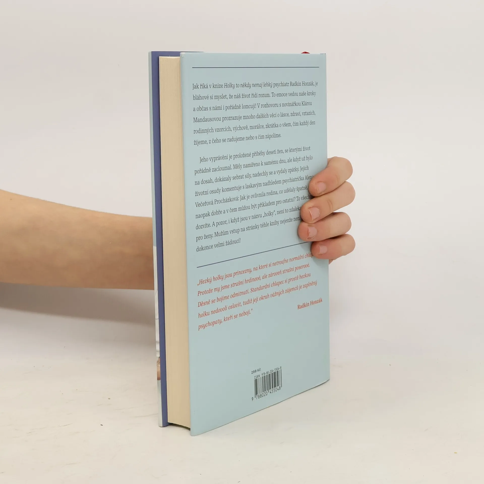 Říká se, že žena vydrží víc než kůň. A kolik toho vlastně vydrží kůň? Hodně, i když se někdy splaší, začne vyvádět a občas jde dokonce hlavou proti zdi. Ať to stojí, co to stojí. Jak říká v knize Holky to někdy nemaj lehký psychiatr Radkin Honzák, je bláhové si myslet, že náš život řídí rozum. Jsou to emoce, co vedou naše kroky a občas s námi i pořádně lomcují! V rozhovoru s novinářkou Klárou Mandausovou prozrazuje mnoho dalších věcí o lásce, zdraví, vztazích, rodinných vzorcích, výchově, morálce, zkrátka o všem, čím každý den žijeme, z čeho se radujeme nebo s čím zápolíme. Jeho vyprávění je proložené příběhy deseti žen, se kterými život pořádně zacloumal. Měly namířeno k samému dnu, ale když už bylo na dosah, dokázaly sebrat síly, nadechly se a vydaly zpátky. Jejich životní osudy komentuje s laskavým nadhledem psychiatrička Alena Večeřová Procházková: Jak je ovlivnila rodina, co udělaly špatně, co naopak dobře a v čem můžou být příkladem pro ostatní? To všechno se dozvíte. A pozor, i když jsou v názvu holky, není to zdaleka čtení pouze pro ženy. Mužům vstup na stránky téhle knihy nejenže není zakázán, je dokonce velmi žádoucí! Je vám, pánové, přece jasné, že rčení o koni a výdrži, platí i pro vás?