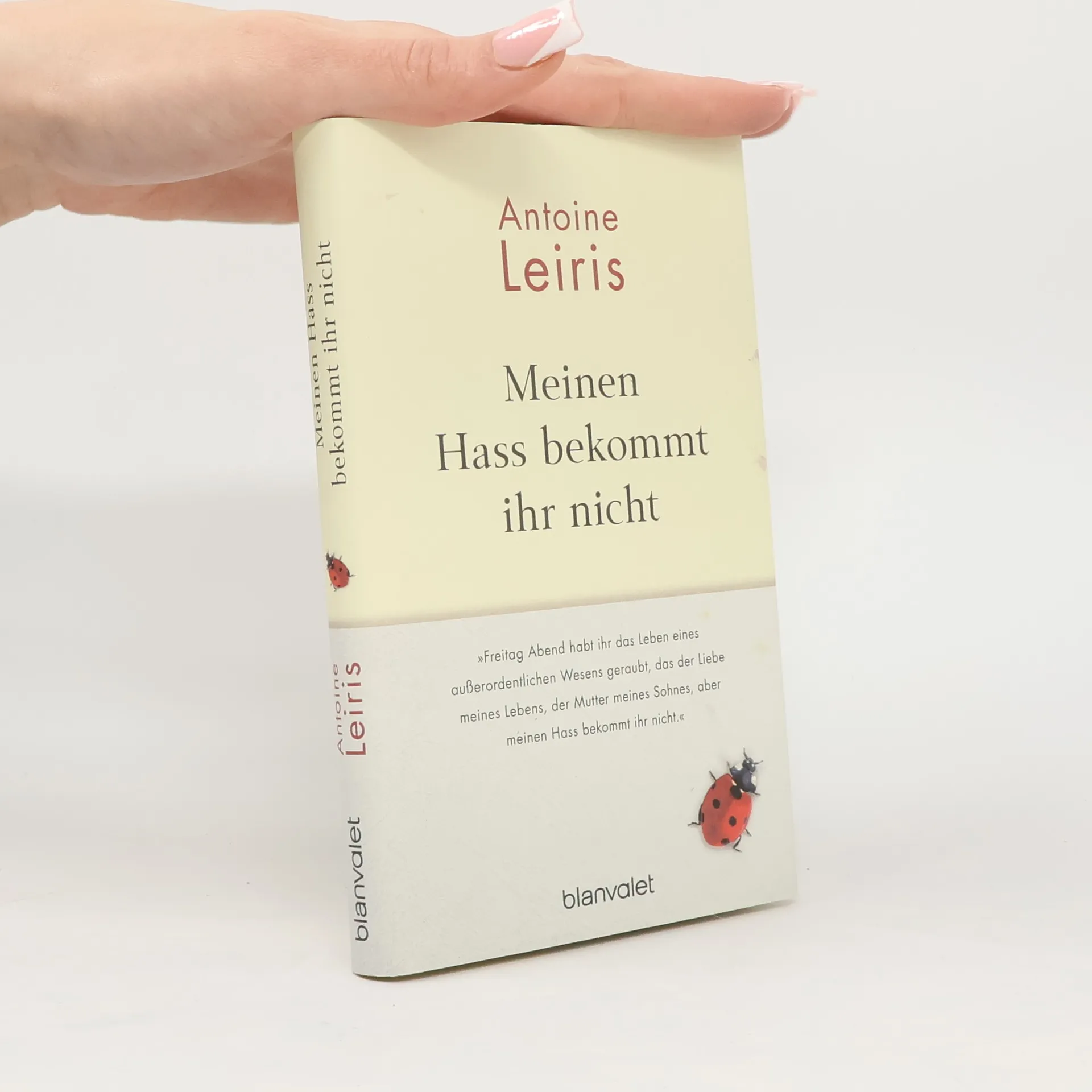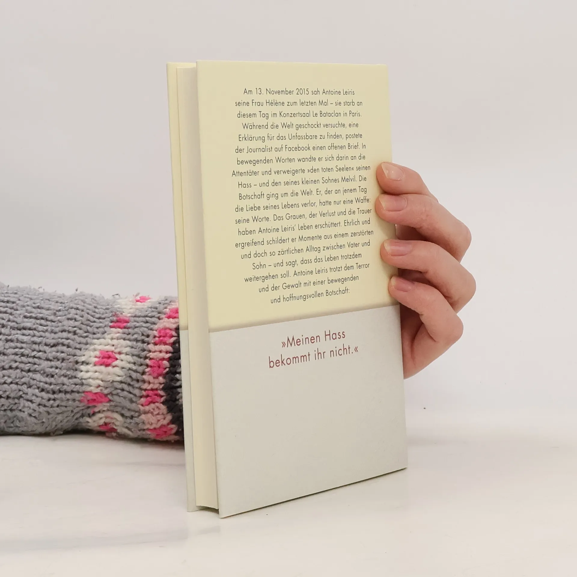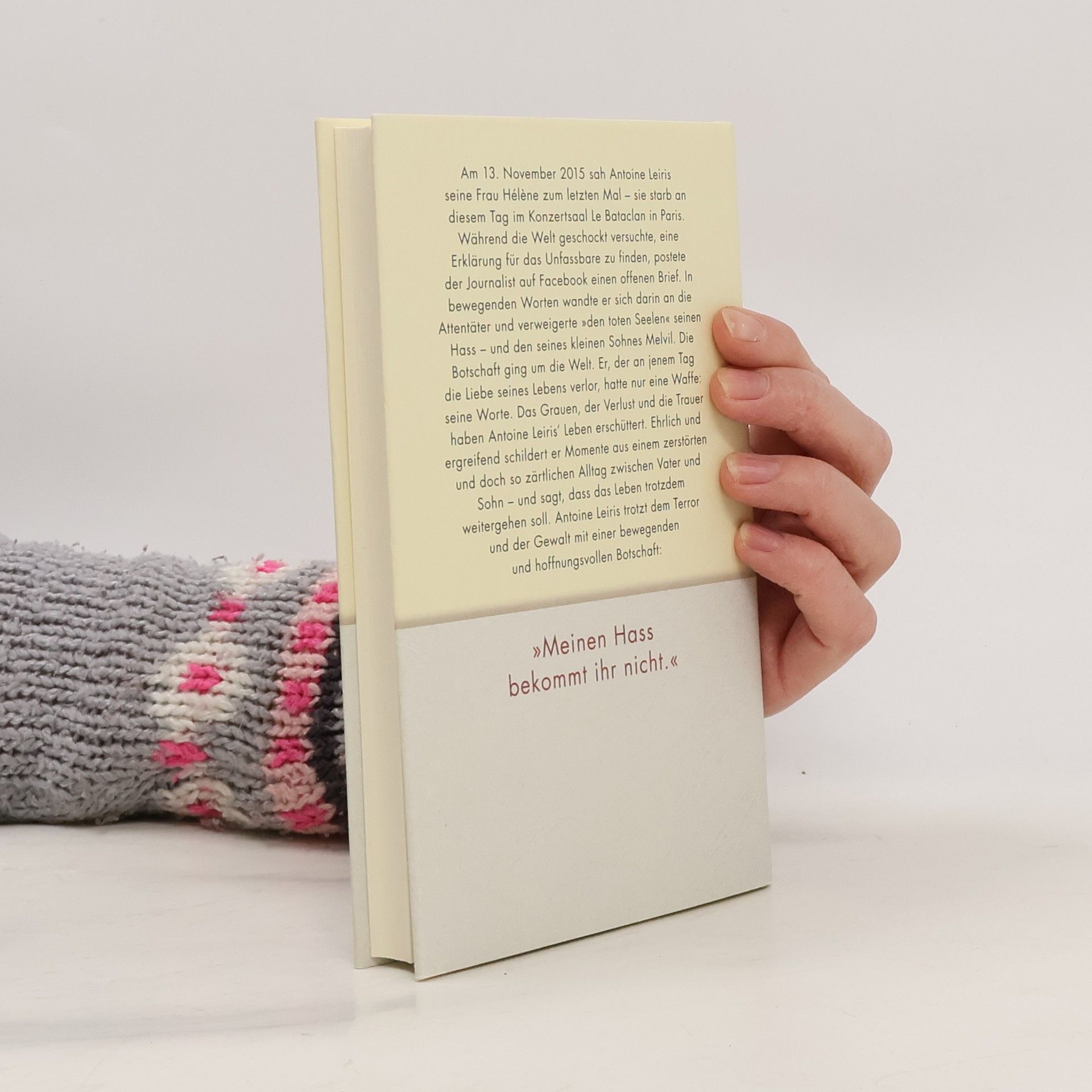 Der bewegende Bericht eines Mannes, der am 13. November 2015 während der Terroranschläge in Paris die Liebe seines Lebens verlor und mit einem einzigen Post die ganze Welt bewegte. Am 13. November 2015 sah Antoine Leiris seine Frau Hélène zum letzten Mal – sie wurde an diesem Tag mit neunundachtzig weiteren Personen im Konzertsaal Le Bataclan Opfer der Terroranschläge in Paris. Während die Welt geschockt und in tiefer Trauer versuchte, eine Erklärung für das Unfassbare zu finden, postete der Journalist auf Facebook einen offenen Brief. In bewegenden Worten wandte er sich darin an die Attentäter und verweigerte „den toten Seelen“ seinen Hass – und den seines damals siebzehn Monate alten Sohnes Melvil. Die Botschaft ging um die Welt. Er, der an jenem Tag die Liebe seines Lebens verlor, hatte nur eine Waffe: seine Worte. Das Grauen, der Verlust und die Trauer haben Antoine Leiris‘ Leben erschüttert. Ehrlich und ergreifend schildert er Momente aus einem zerstörten und doch so zärtlichen Alltag zwischen Vater und Sohn – und sagt damals wie heute, dass das Leben trotzdem weitergehen soll. Antoine Leiris trotzt dem Terror und der Gewalt mit einer bewegenden und hoffnungsvollen Botschaft: „Meinen Hass bekommt ihr nicht“.