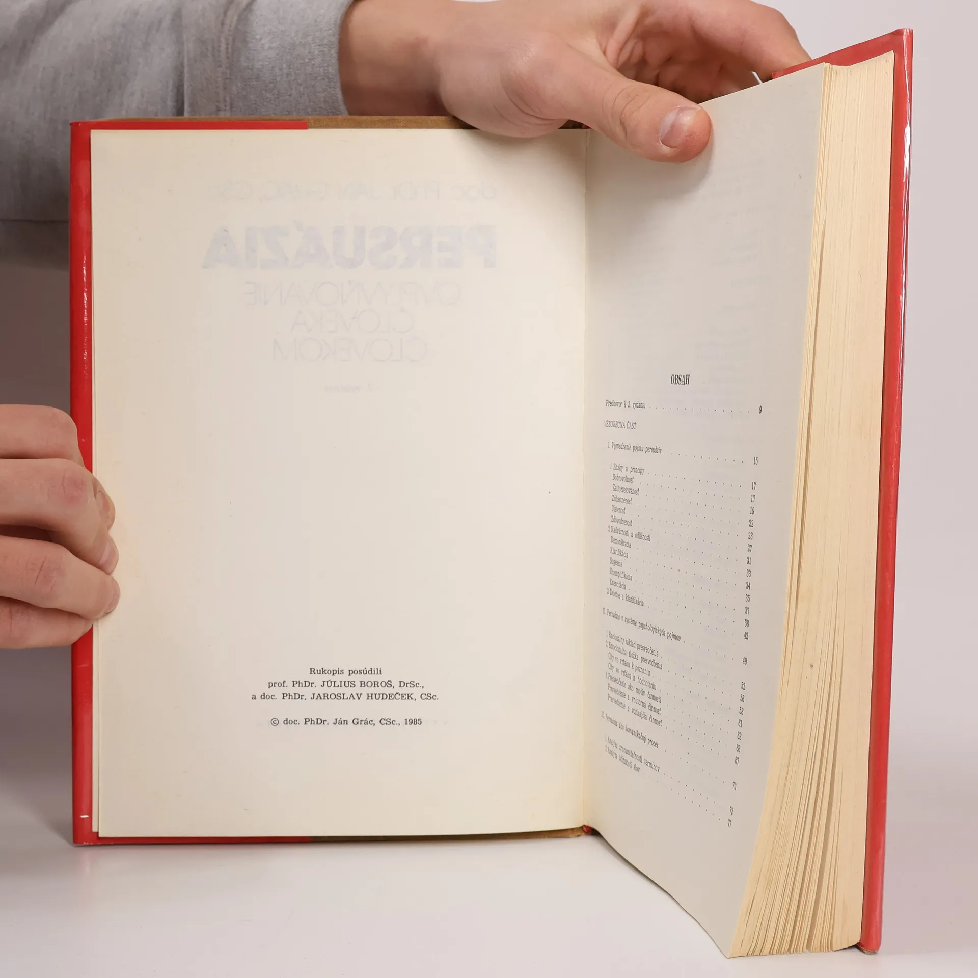 Dostupné údaje týkajúce sa problematiky ovplyvňovania a presvedčovania sa pokúsil syntetizovať náš popredný psychológ doc. PhDr. Ján Grác, CSc., a to nielen z hľadiska psychológie, ale aj z hľadiska iných vedných disciplín o človeku. „Ťažiskovým problémom, ktorý sa v monografii rieši,je presvedčovanie. Presvedčovanie sa tu právompokladá za jednu z najvýznamnejších metód vnútorného utvárania osobnosti, regulácie i sebaregulácie, pedagogickej i propagandistickej činnosti, a to najmä v súvislosti so sociálnym učením, racionálnymi, emocionálnymi a konaktívnymi aspektmi mravného, svetonázorového, estetického a pracovného profilu osobnosti. Autor s veľkou znalosťou filozofických, etických, pedagogických, logických, lingvistických, sociálnopsychologických a ďalších východísk a dialektických súvislostí analyzuje a systematicky osvetľuje presvedčovanie predovšetkým z aspektu pôsobiacich psychických mechanizmov, vnútorných a vonkajších vplyvov, fungujúcich v procese tohto zložitého javu. Kniha je určená najmä psychológom, vedúcim pracovníkom, pedagógom, ale aj všetkým tým, ktorí majú o túto problematiku záujem.