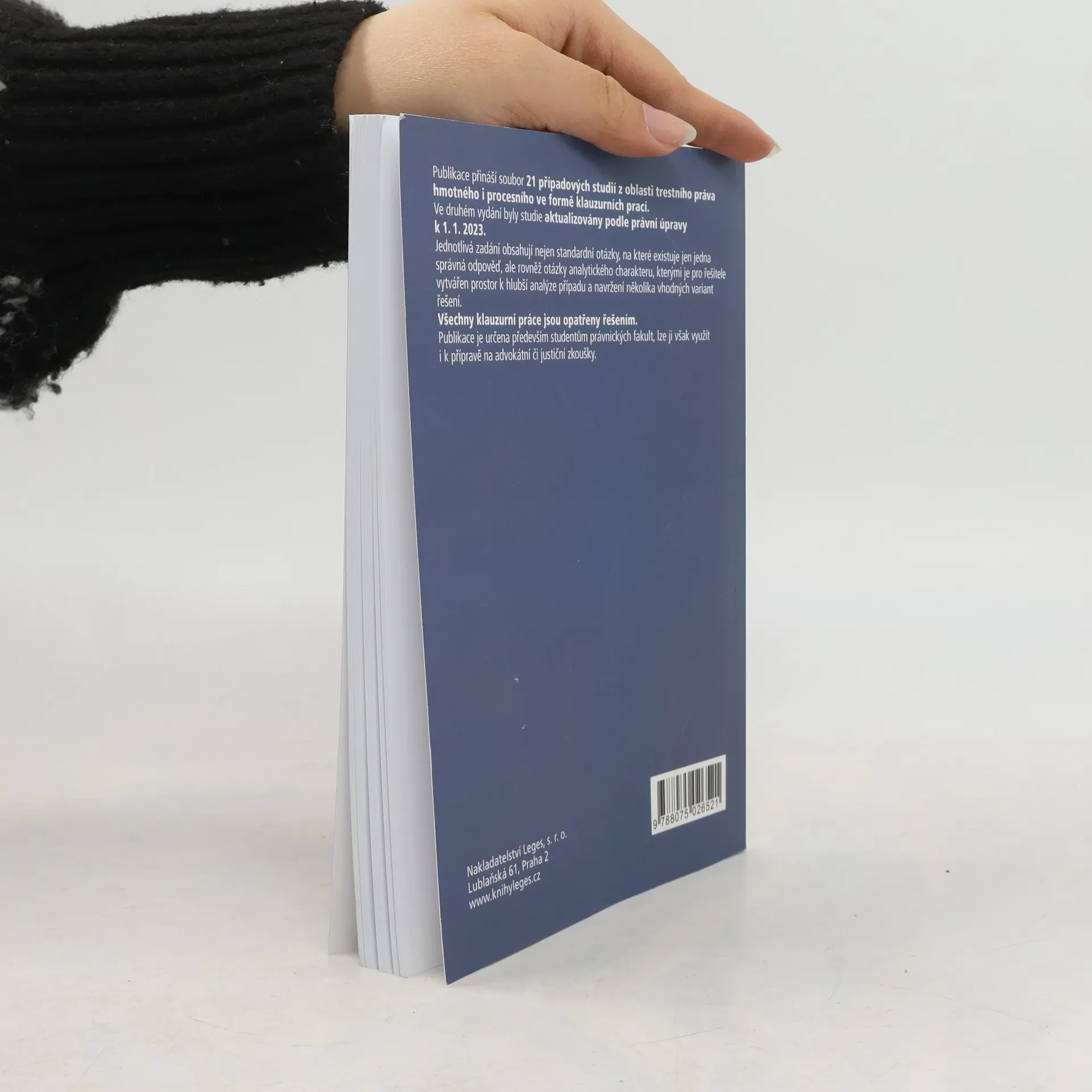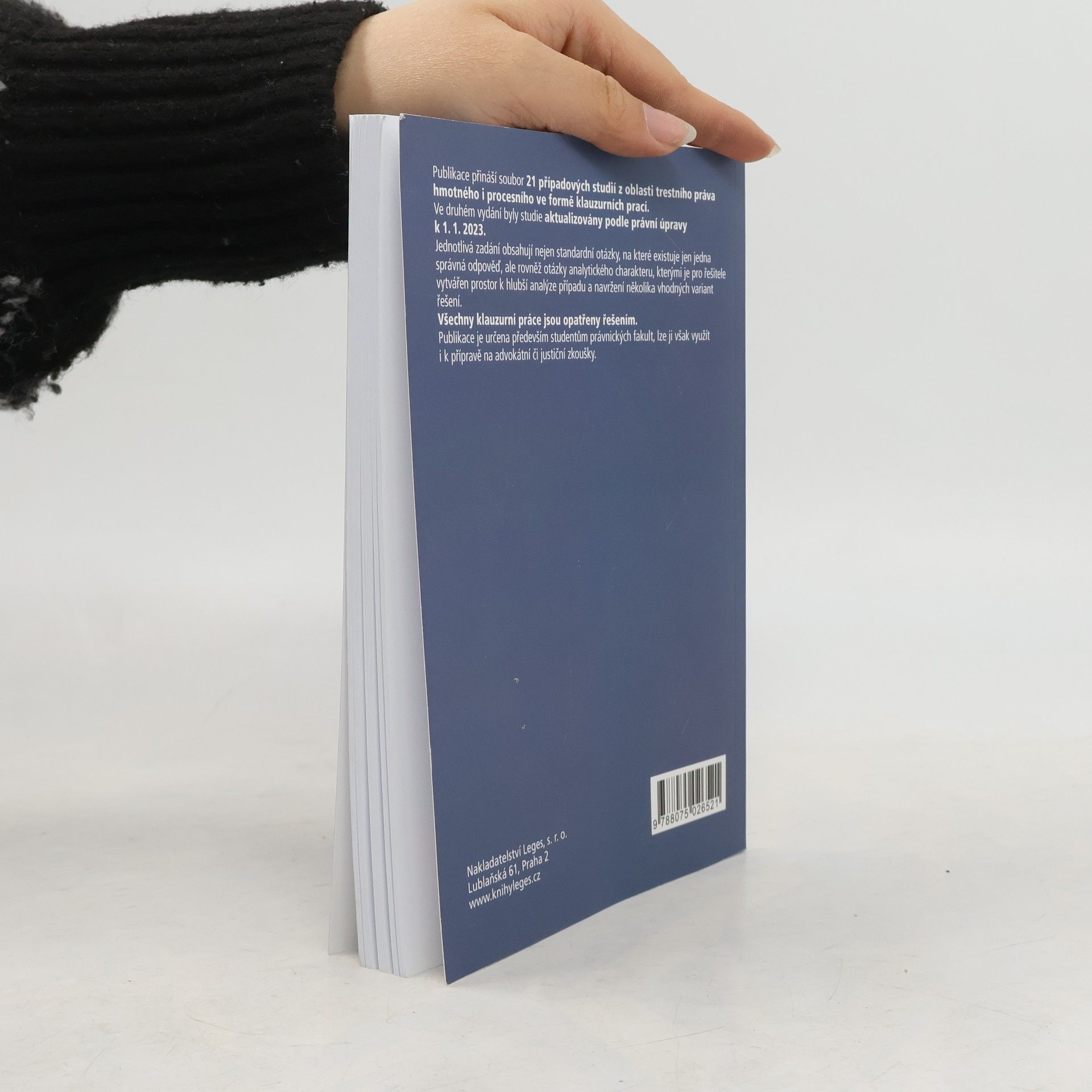 Publikace přináší soubor 21 případových studií z oblasti trestního práva hmotného i procesního ve formě klauzurních prací. Ve druhém vydání byly studie aktualizovány podle právní úpravy k 1. 1. 2023. Jednotlivá zadání obsahují nejen standardní otázky, na které existuje jen jedna správná odpověď, ale rovněž otázky analytického charakteru, kterými je pro řešitele vytvářen prostor k hlubší analýze případu a navržení několika vhodných variant řešení. Všechny klauzurní práce jsou opatřeny řešením. Publikace je určena především studentům právnických fakult, lze ji však využít i k přípravě na advokátní či justiční zkoušky.