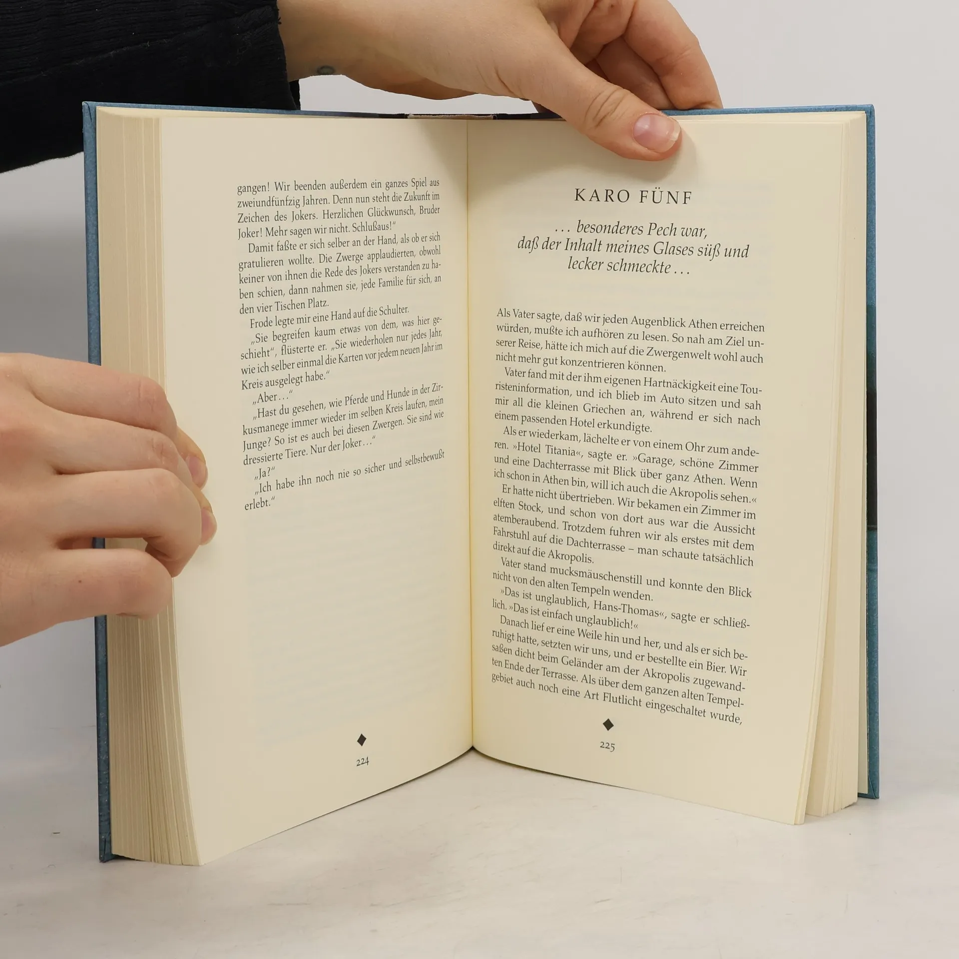 Hans-Thomas ist mit seinem Vater unterwegs von Norwegen nach Griechenland. Dort wollen sie versuchen, seine Mutter wiederzufinden, die sie vor Jahren verlassen hat – um sich selbst zu finden, wie sie sagte. An einer Tankstelle in den Schweizer Bergen werden sie von einem seltsamen Zwerg bedient, der ihnen vorschlägt, in einem bestimmten Dorf zu übernachten. Von dem Bäcker im Dorf kauft Hans-Thomas am nächsten Tag drei Brötchen. Als er das dritte Brötchen anbeißt, stoßen seine Zähne auf etwas Hartes: ein in winziger Schrift geschriebenes Büchlein. Mit der Lupe, die ihm der Tankstellenzwerg (und deren Glas erstaunlicherweise genau in die fehlende Ecke des Goldfischglases im Schaufenster der Bäckerei paßt), kann er die ersten Buchstaben lesen: Die Purpurlimonade und die magische Insel. Auf geheimnisvolle Weise verschlingt sich nun diese Reise, von der das kleine Buch erzählt, mit der wirklichen Reise nach Griechenland, mit der Suche nach der Mutter und der Weisheit der alten Philosophen. Auf einmal bekommt ein Kartenspiel, mit dem man Patiencen legen kann, einen Sinn, so, wie das Orakel von Delphi einmal einen Sinn gehabt hat – denn in einer Welt, von deren Geheimnis wir nur einen Zipfel zu lüften vermögen, sind auch die merkwürdigsten Zufälle denkbar.