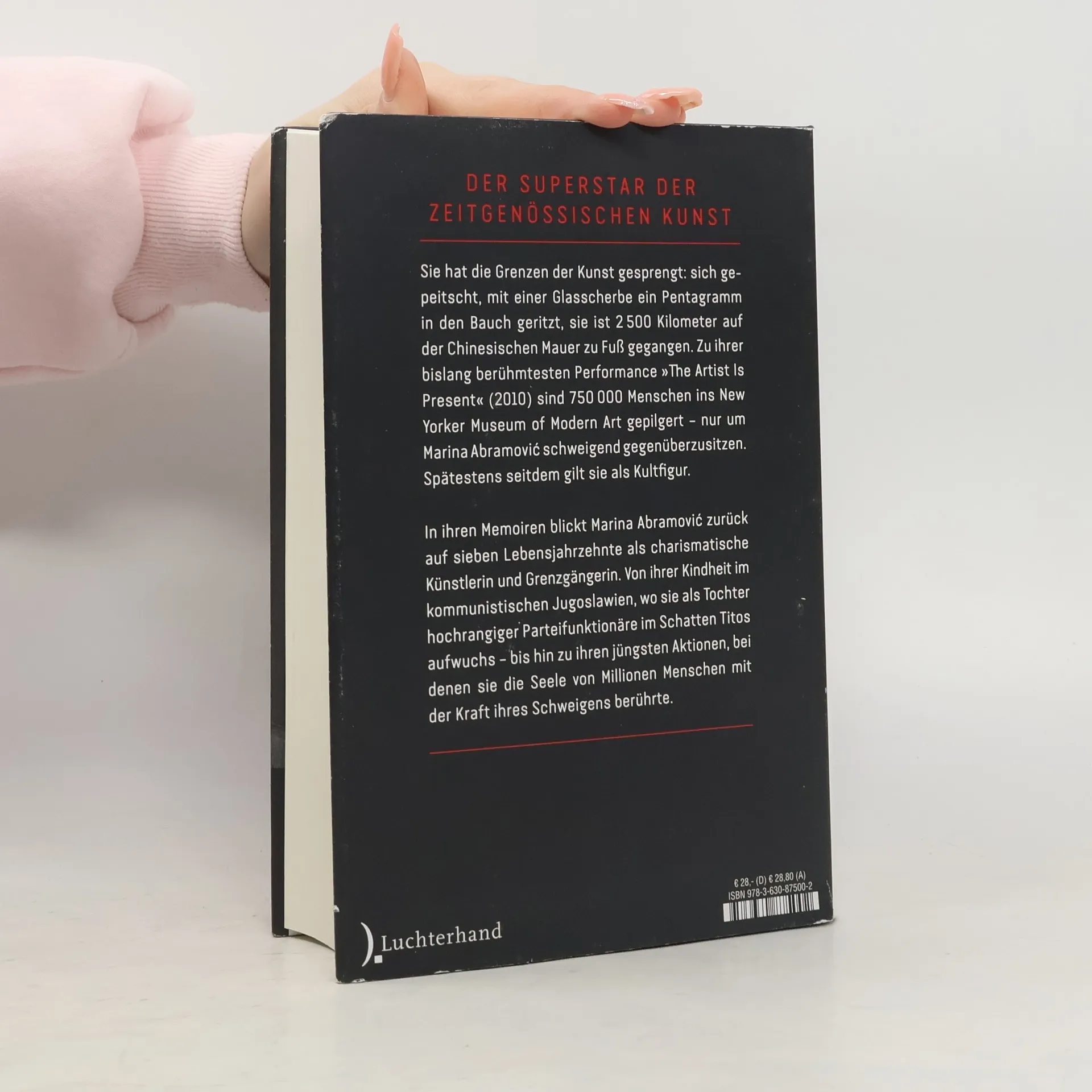 Die Autobiografie – zum 70. Geburtstag am 30. November 2016 Sie hat die Grenzen der Kunst gesprengt: sich gepeitscht, mit einer Glasscherbe ein Pentagramm in den Bauch geritzt, ein Messer in die Finger gerammt. Sie ist 2500 Kilometer auf der Chinesischen Mauer gegangen, zwölf Jahre in einem umgebauten Citroën-Bus durch die Welt gefahren und hat ein Jahr bei den Aborigines in Australien gelebt. Spätestens seit »The Artist is Present« – ihrer berühmten Performance 2010 im New Yorker Museum of Modern Art - gilt Marina Abramović in der ganzen Welt als Kultfigur. Robert Redford schwärmt für sie genauso wie Lady Gaga. Vom »Time Magazine« wurde sie zu den 100 wichtigsten Menschen des Jahres 2014 gewählt. In ihren Memoiren blickt Abramović zurück auf sieben Lebensjahrzehnte als charismatische Künstlerin und Grenzgängerin. Von ihrer strengen Kindheit im kommunistischen Jugoslawien, wo sie bei ihren der politischen Elite nahestehenden Eltern im Schatten Titos aufwuchs – bis hin zu ihren jüngsten Aktionen, bei denen sie die Seele von Millionen von Menschen mit der Kraft ihres Schweigens berührte. Ausstattung: Mit 141 Schwarz-weiß-Fotos und 16 Seiten Farbbildteil