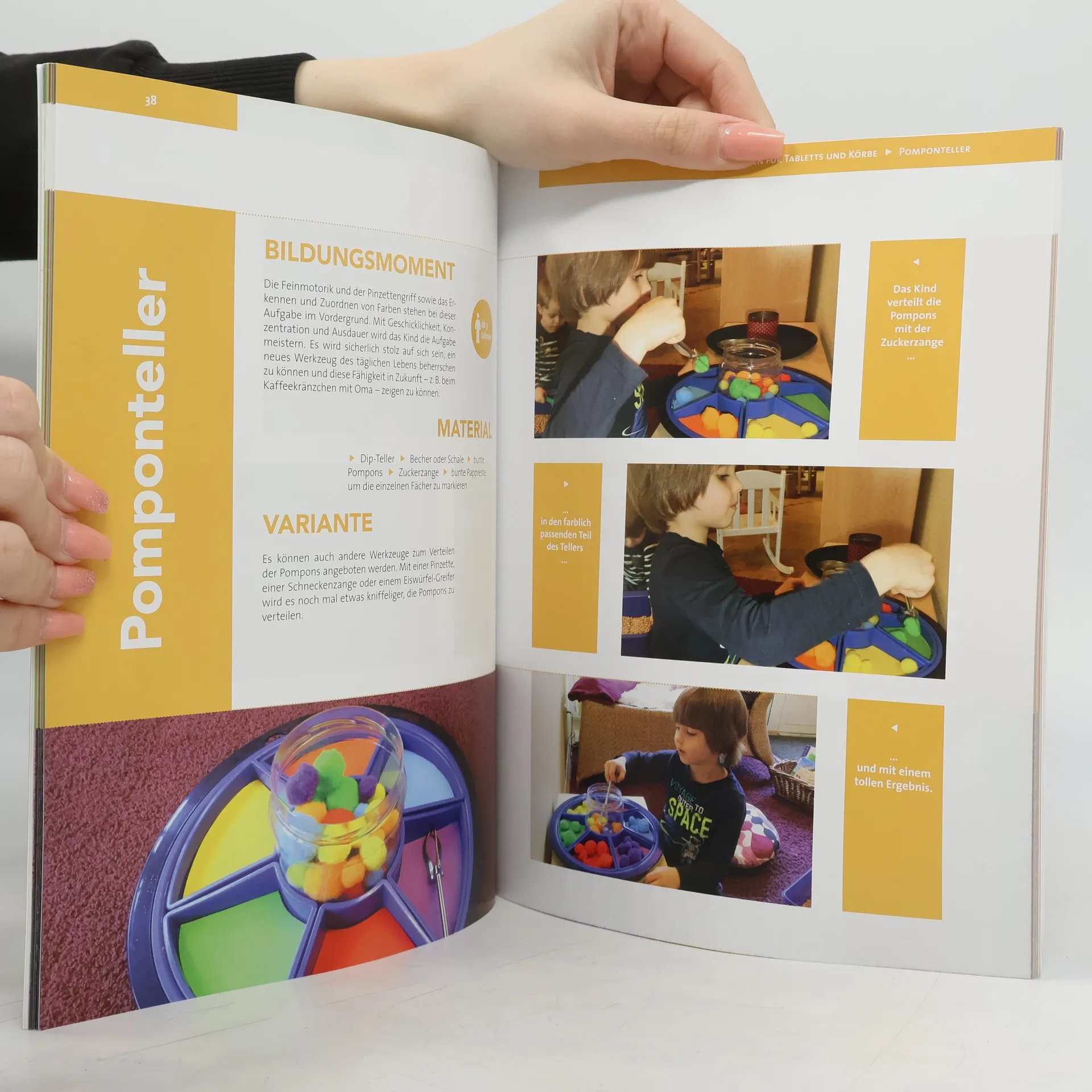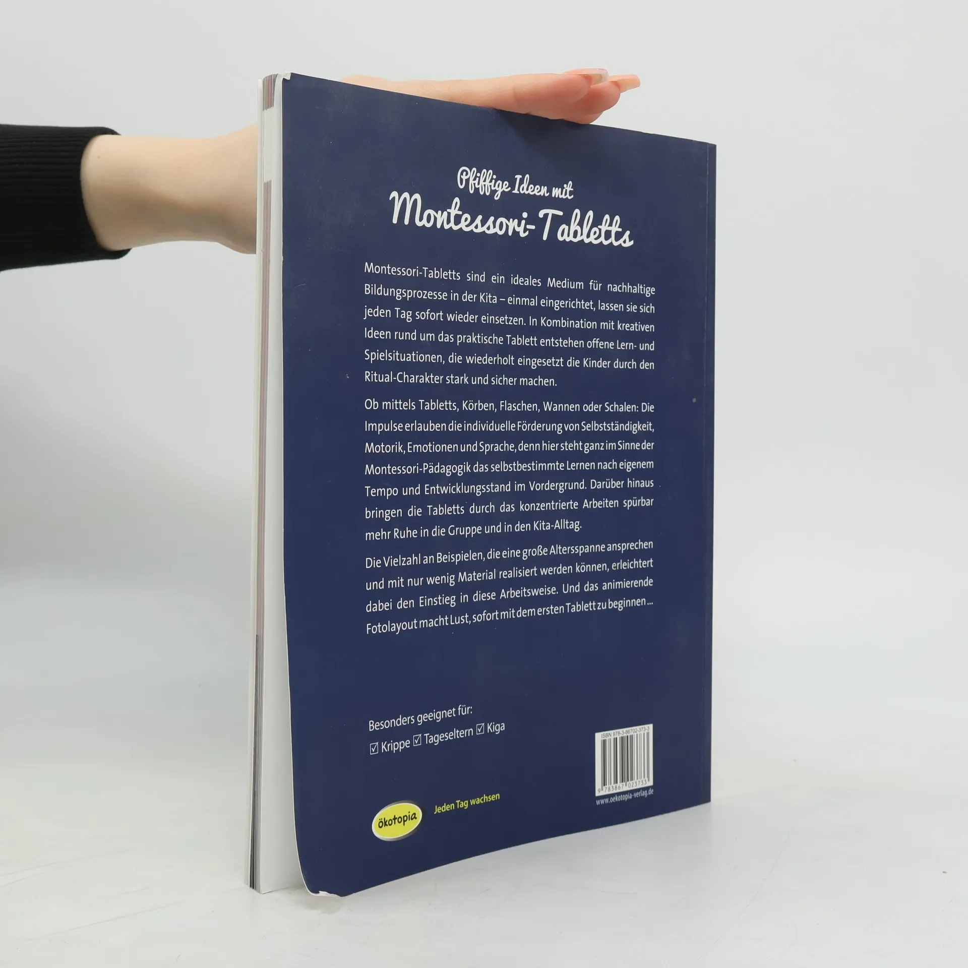 Montessori-Tabletts sind ein ideales Medium für nachhaltige Bildungsprozesse in der Kita – einmal eingerichtet, lassen sie sich jeden Tag sofort wieder einsetzen. In Kombination mit kreativen Ideen rund um das praktische Tablett entstehen offene Lern- und Spielsituationen, die wiederholt eingesetzt die Kinder durch den Ritual-Charakter stark und sicher machen. Ob mittels Tabletts, Körben, Flaschen, Wannen oder Schalen: Die Impulse erlauben die individuelle Förderung von Selbstständigkeit, Motorik, Emotionen und Sprache, denn hier steht ganz im Sinne der Montessori-Pädagogik das selbstbestimmte Lernen nach eigenem Tempo und Entwicklungsstand im Vordergrund. Darüber hinaus bringen die Tabletts durch das konzentrierte Arbeiten spürbar mehr Ruhe in die Gruppe und in den Kita-Alltag. Die Vielzahl an Beispielen, die eine große Altersspanne ansprechen und mit nur wenig Material realisiert werden können, erleichtert dabei den Einstieg in diese Arbeitsweise. Und das animierende Fotolayout macht Lust, sofort mit dem ersten Tablett zu beginnen ...