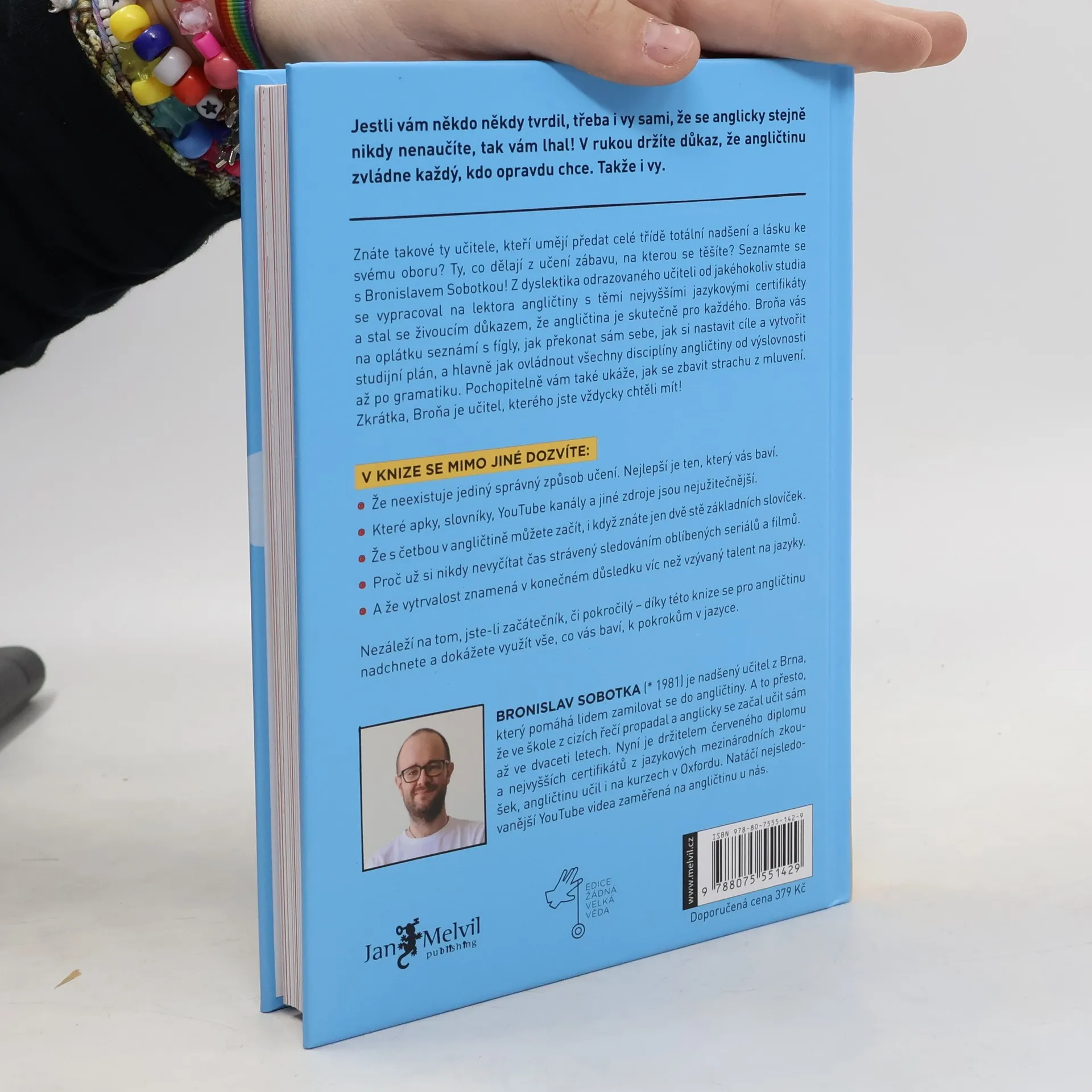 Hello my dear future readers! Jsem Broňa, nadšený učitel angličtiny z Brna, který pomáhá lidem zamilovat se do angličtiny a rád bych vám představil svoji novou knihu. Možná vás to překvapí, ale od malička jsem nesnášel školu. Asi proto, že mi vůbec nešla. Zvláště pak jazyky. Každý diktát za 5. Návrh na přestup do zvláštní školy. Dyslexie. Osm let němčiny a v hlavě prázdno. V 18 nastupuji jako dělník do fabriky a mám radost, že se už nemusím nic učit. End of the story. A víte co? Nakonec jsem vystudoval angličtinu na vysoké, s červeným diplomem, udělal si certifikát CPE a dal ho na Pass A, což je ta nejvyšší úroveň angličtiny, kterou v Cambridge měří. V létě jsem pak několik let po sobě učil angličtinu v Oxfordu a v Londýně jsem získal nejvyšší neuniverzitní globálně uznávanou kvalifikaci pro vyučující anglického jazyka DELTA. Učím jako externista na Masarykově univerzitě, školím učitele a mám největší YouTube kanál v ČR zaměřený na angličtinu, stejně jako nejstudovanější online kurz angličtiny u nás.