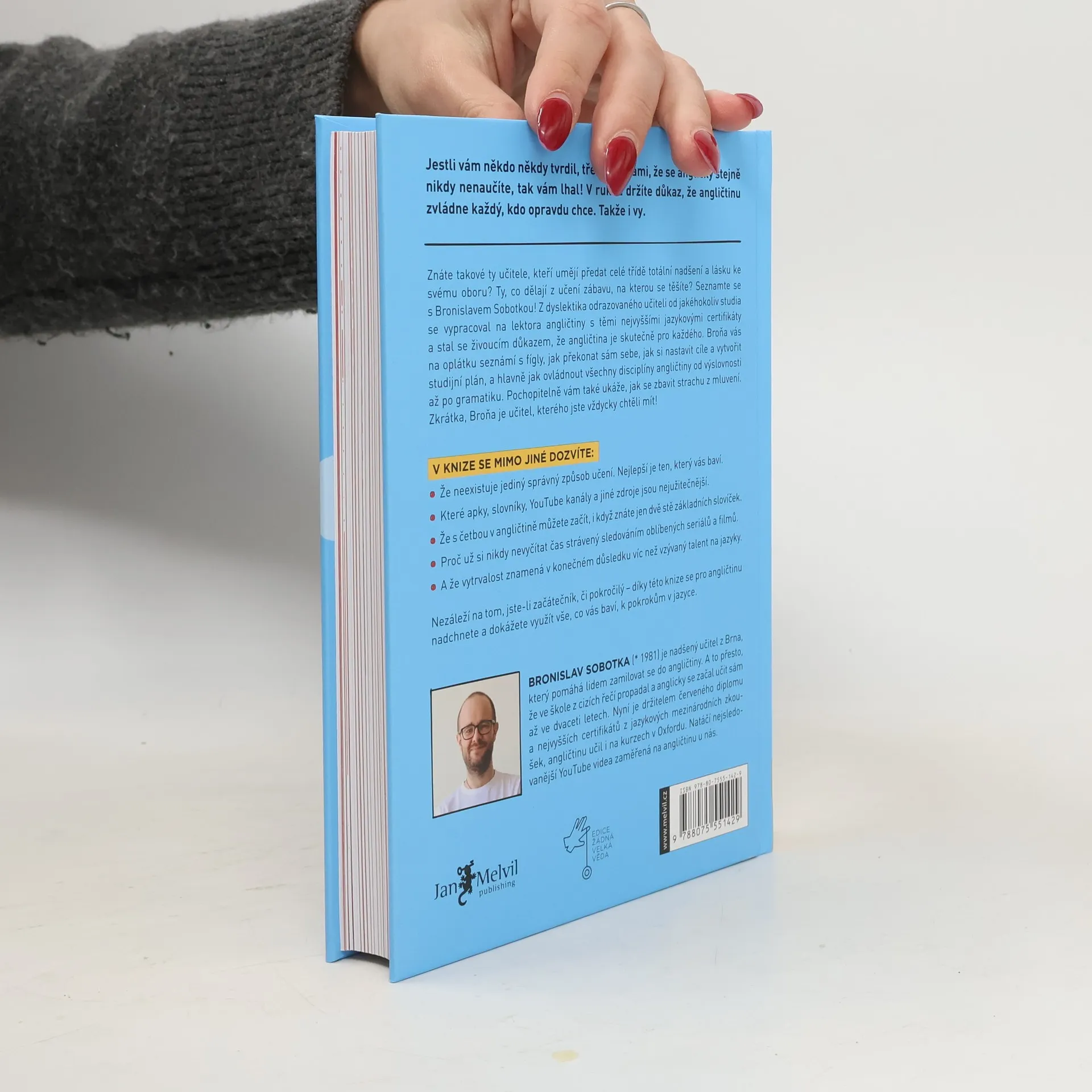 Hello my dear future readers! Jsem Broňa, nadšený učitel angličtiny z Brna, který pomáhá lidem zamilovat se do angličtiny a rád bych vám představil svoji novou knihu. Možná vás to překvapí, ale od malička jsem nesnášel školu. Asi proto, že mi vůbec nešla. Zvláště pak jazyky. Každý diktát za 5. Návrh na přestup do zvláštní školy. Dyslexie. Osm let němčiny a v hlavě prázdno. V 18 nastupuji jako dělník do fabriky a mám radost, že se už nemusím nic učit. End of the story. A víte co? Nakonec jsem vystudoval angličtinu na vysoké, s červeným diplomem, udělal si certifikát CPE a dal ho na Pass A, což je ta nejvyšší úroveň angličtiny, kterou v Cambridge měří. V létě jsem pak několik let po sobě učil angličtinu v Oxfordu a v Londýně jsem získal nejvyšší neuniverzitní globálně uznávanou kvalifikaci pro vyučující anglického jazyka DELTA. Učím jako externista na Masarykově univerzitě, školím učitele a mám největší YouTube kanál v ČR zaměřený na angličtinu, stejně jako nejstudovanější online kurz angličtiny u nás.