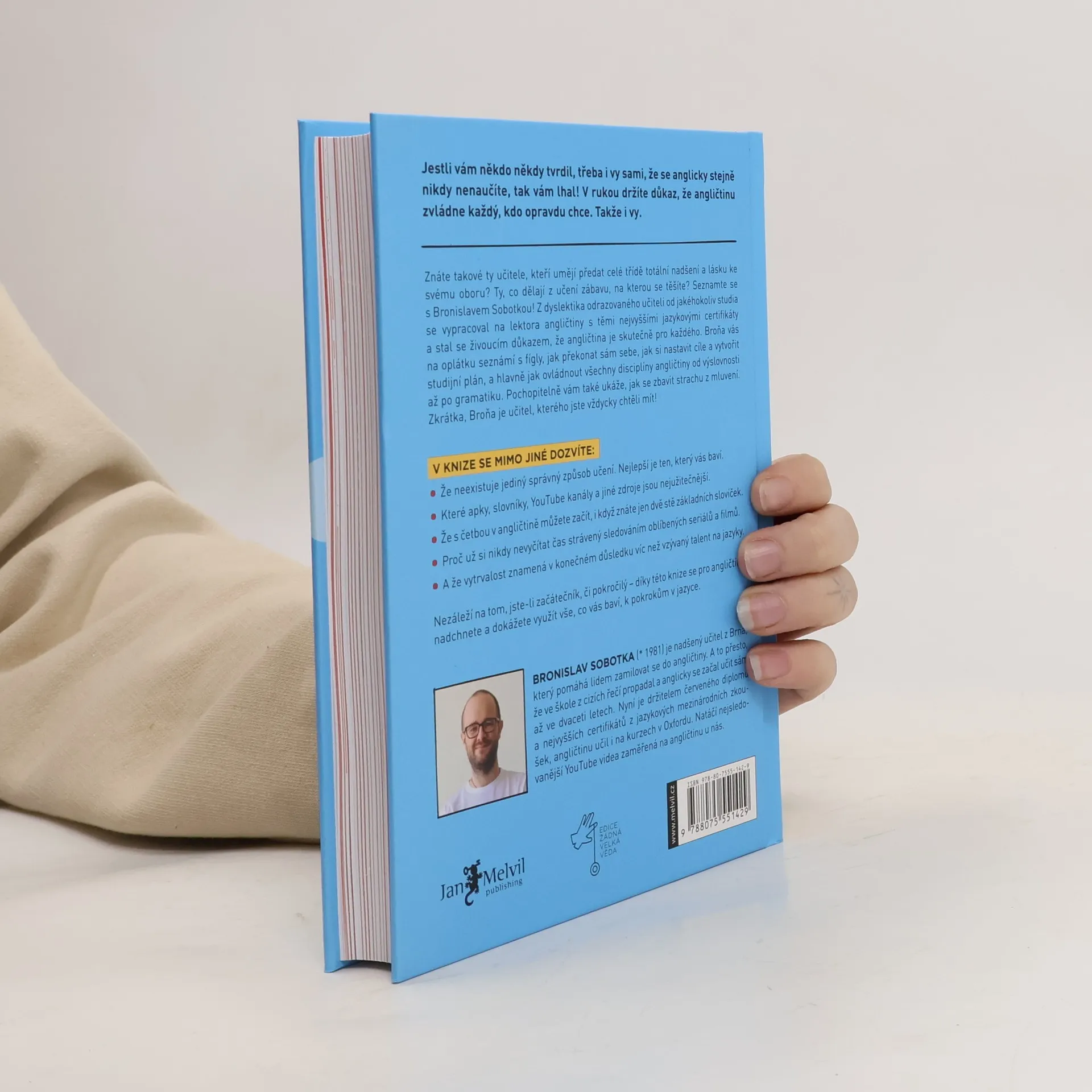 Hello my dear future readers! Jsem Broňa, nadšený učitel angličtiny z Brna, který pomáhá lidem zamilovat se do angličtiny a rád bych vám představil svoji novou knihu. Možná vás to překvapí, ale od malička jsem nesnášel školu. Asi proto, že mi vůbec nešla. Zvláště pak jazyky. Každý diktát za 5. Návrh na přestup do zvláštní školy. Dyslexie. Osm let němčiny a v hlavě prázdno. V 18 nastupuji jako dělník do fabriky a mám radost, že se už nemusím nic učit. End of the story. A víte co? Nakonec jsem vystudoval angličtinu na vysoké, s červeným diplomem, udělal si certifikát CPE a dal ho na Pass A, což je ta nejvyšší úroveň angličtiny, kterou v Cambridge měří. V létě jsem pak několik let po sobě učil angličtinu v Oxfordu a v Londýně jsem získal nejvyšší neuniverzitní globálně uznávanou kvalifikaci pro vyučující anglického jazyka DELTA. Učím jako externista na Masarykově univerzitě, školím učitele a mám největší YouTube kanál v ČR zaměřený na angličtinu, stejně jako nejstudovanější online kurz angličtiny u nás.