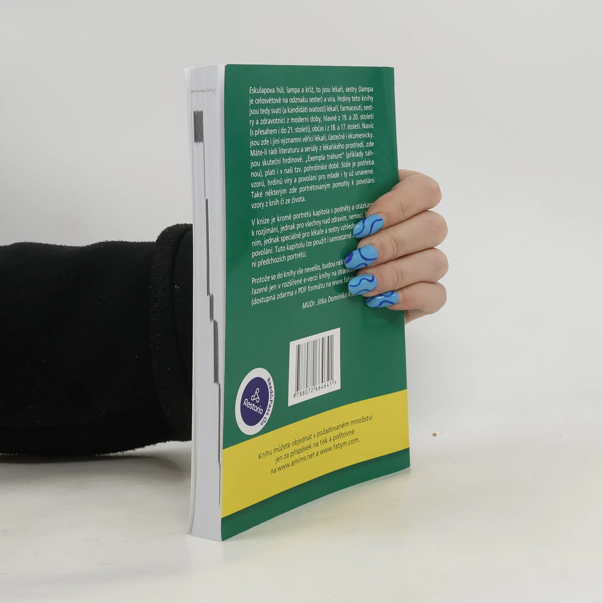 Téměř stovka medailonů představuje svaté (a kandidáty svatosti) lékaře, farmaceuty, sestry a zdravotníky z moderní doby. V knize je kromě portrétů také kapitola s podněty a otázkami k rozjímání – jednak pro všechny nad zdravím, nemocí, léčbou, jednak speciálně pro lékaře a zdravotní sestry vzhledem k jejich povolání.