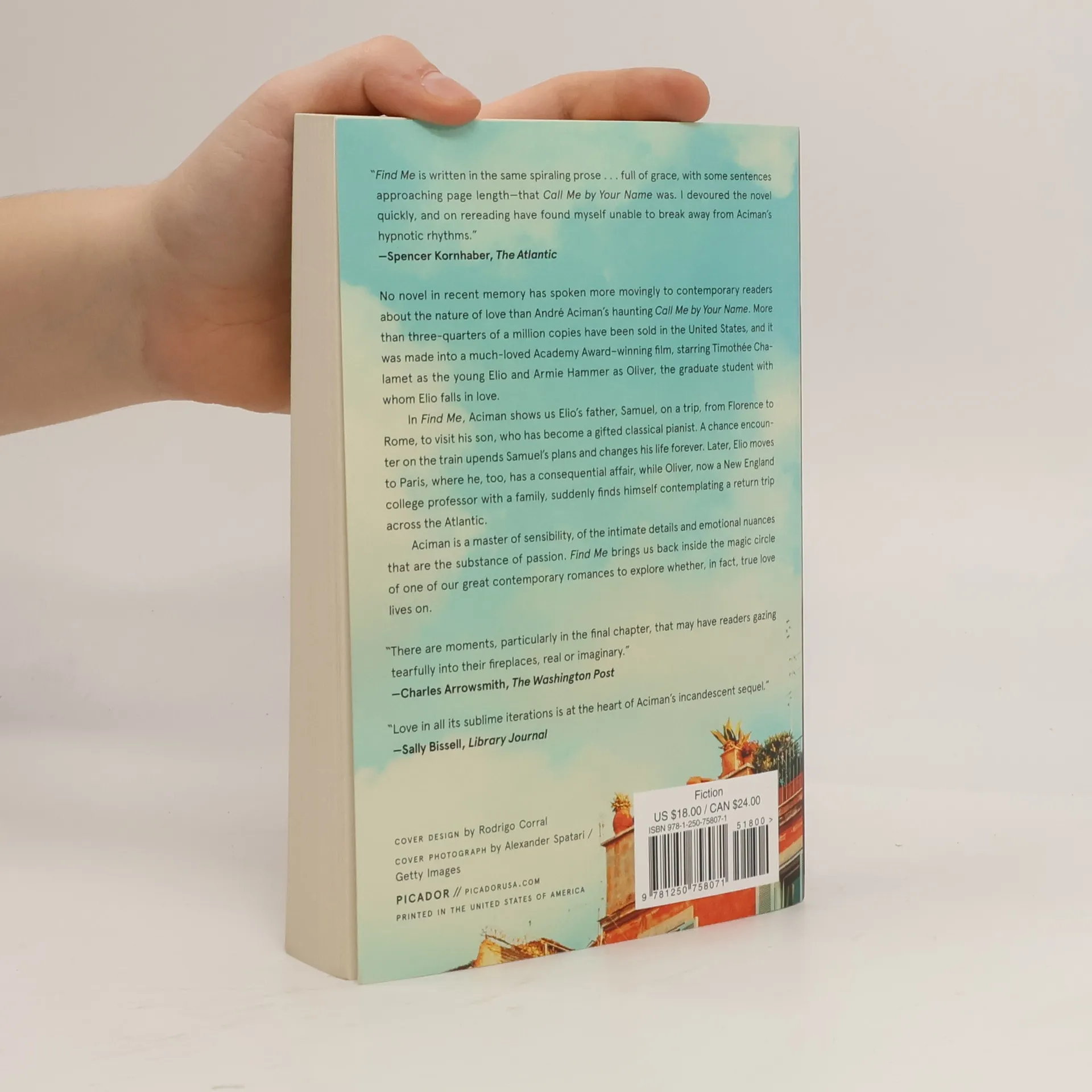 In Find Me, Aciman shows us Elio's father, Samuel, on a trip from Florence to Rome to visit his son, who has become a gifted classical pianist. A chance encounter on the train upends Samuel's plans and changes his life forever. Later, Elio moves to Paris, where he, too, has a consequential affair, while Oliver, now a New England college professor with a family, suddenly finds himself contemplating a return trip across the Atlantic. Aciman is a master of sensibility, of the intimate details and emotional nuances that are the substance of passion. Find Me brings us back inside the magic circle of one of our great contemporary romances to explore whether, in fact, true love lives on