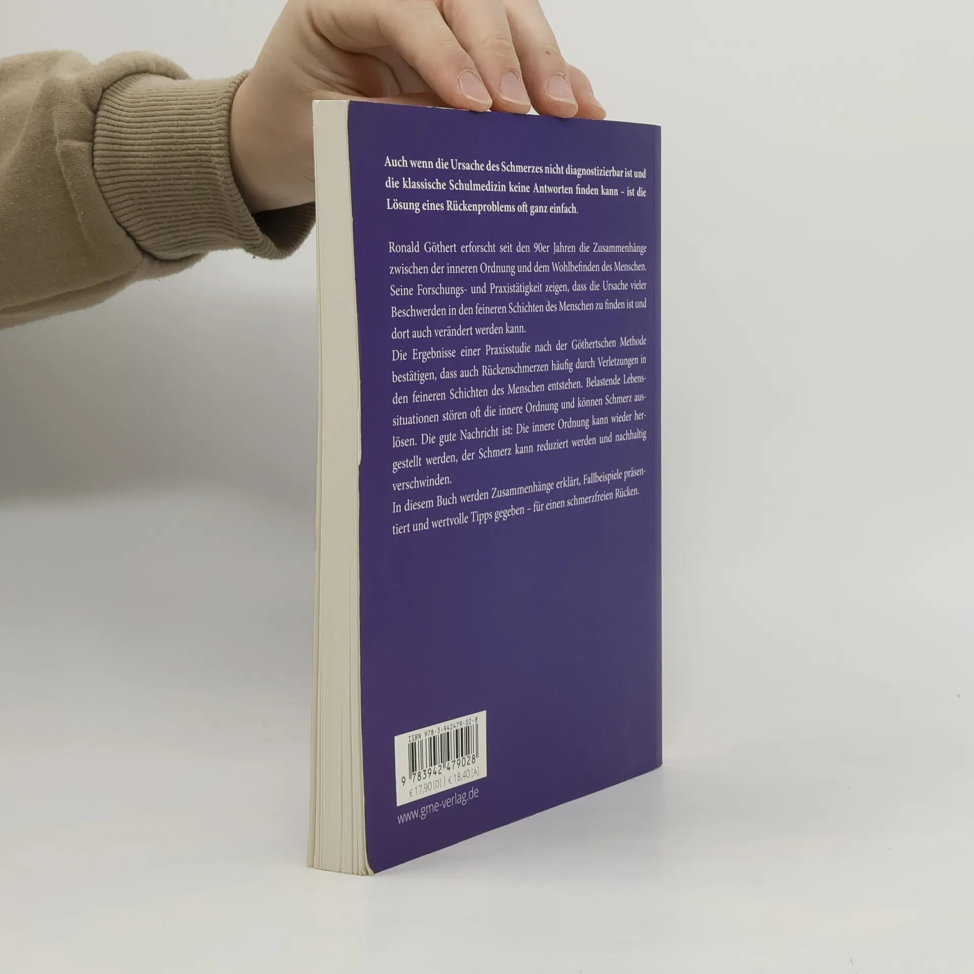 Auch wenn die Ursache des Schmerzes nicht diagnostizierbar ist und die klassische Schulmedizin keine Antworten finden kann – ist die Lösung eines Rückenproblems oft ganz einfach. Ronald Göthert erforscht seit den 90er Jahren die Zusammenhänge zwischen der inneren Ordnung und dem Wohlbefinden des Menschen. Seine Forschungs- und Praxistätigkeit zeigen, dass die Ursache vieler Beschwerden in den feineren Schichten des Menschen zu finden ist und dort auch verändert werden kann. Die Ergebnisse einer Praxisstudie nach der Göthertschen Methode bestätigen, dass auch Rückenschmerzen häufig durch Verletzungen in den feineren Schichten des Menschen entstehen. Belastende Lebenssituationen stören oft die innere Ordnung und können Schmerz auslösen. Die gute Nachricht ist: Die innere Ordnung kann wieder hergestellt werden, der Schmerz kann reduziert werden und nachhaltig verschwinden. In diesem Buch werden Zusammenhänge erklärt, Fallbeispiele präsentiert und wertvolle Tipps gegeben - für einen schmerzfreien Rücken.