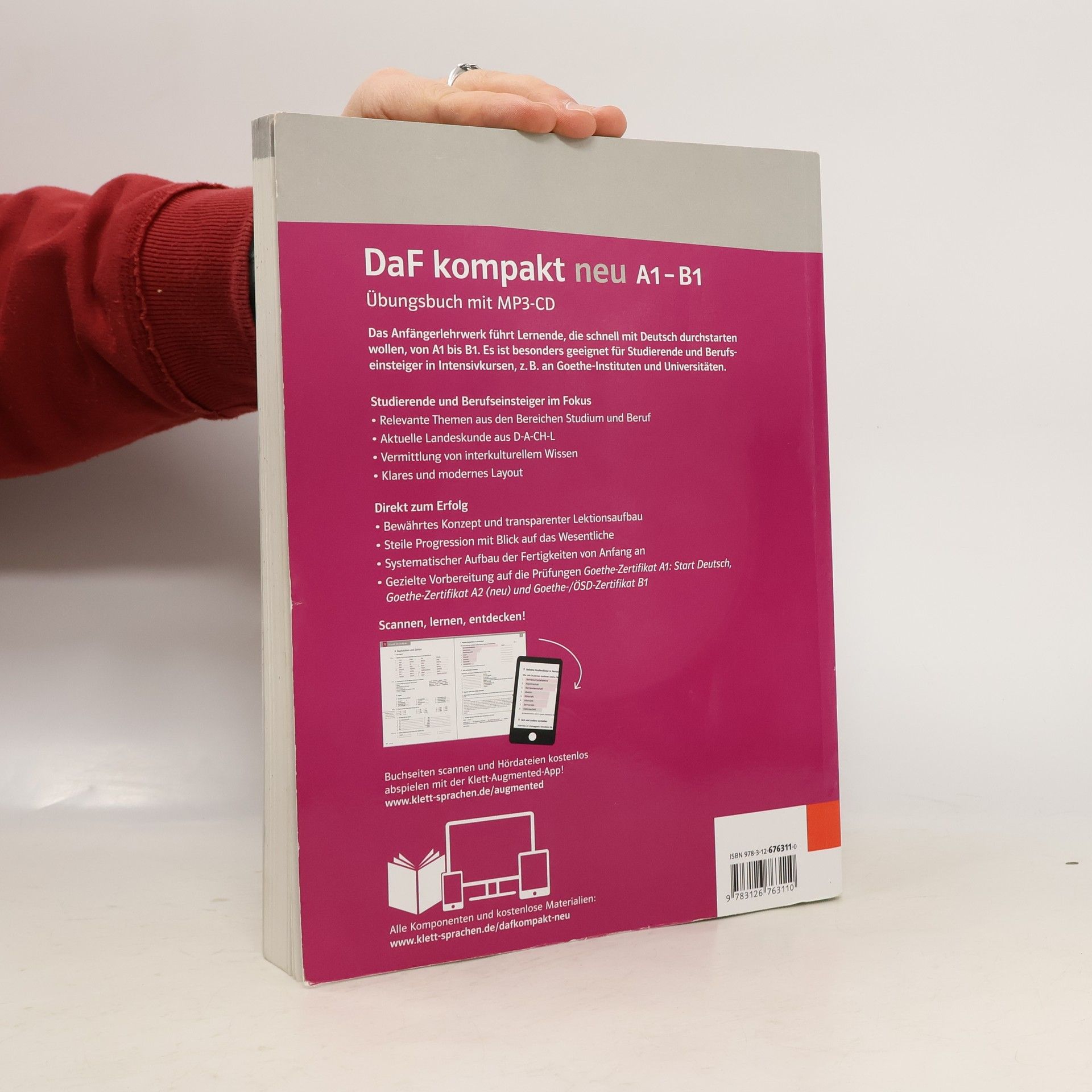 Das Anfängerlehrwerk führt Lernende, die schnell mit Deutsch durchstarten wollen, von A1 bis B1. Es ist besonders geeignet für Studierende und Berufseinsteiger in Intensivkursen, z B an Goethe-Instituten und Universitäten. Studierende und Berufseinsteiger im Fokus : Relevante Themen aus den Bereichen Studium und Beruf ; Aktuelle Landeskunde aus D-A-CH-L ; Vermittlung von interkulturellem Wissen ; Klares und modernes Layout. Direkt zum Erfolg : Bewährtes Konzept und transparenter Lektionsaufbau ; Steile Progression mit Blick auf das Wesentliche ; Systematischer Aufbau der Fertigkeiten von Anfang an ; Gezielte Vorbereitung auf die Prüfungen Goethe-Zertifikat A1 : Start Deutsch, Goethe-Zertifikat A2 (neu) und Goethe-/OSD-Zertifikat B1. Scannen, lernen, entdecken ! Buchseiten scannen und Hördateien kostenlos abspielen mit der Klett-Augmented-App !