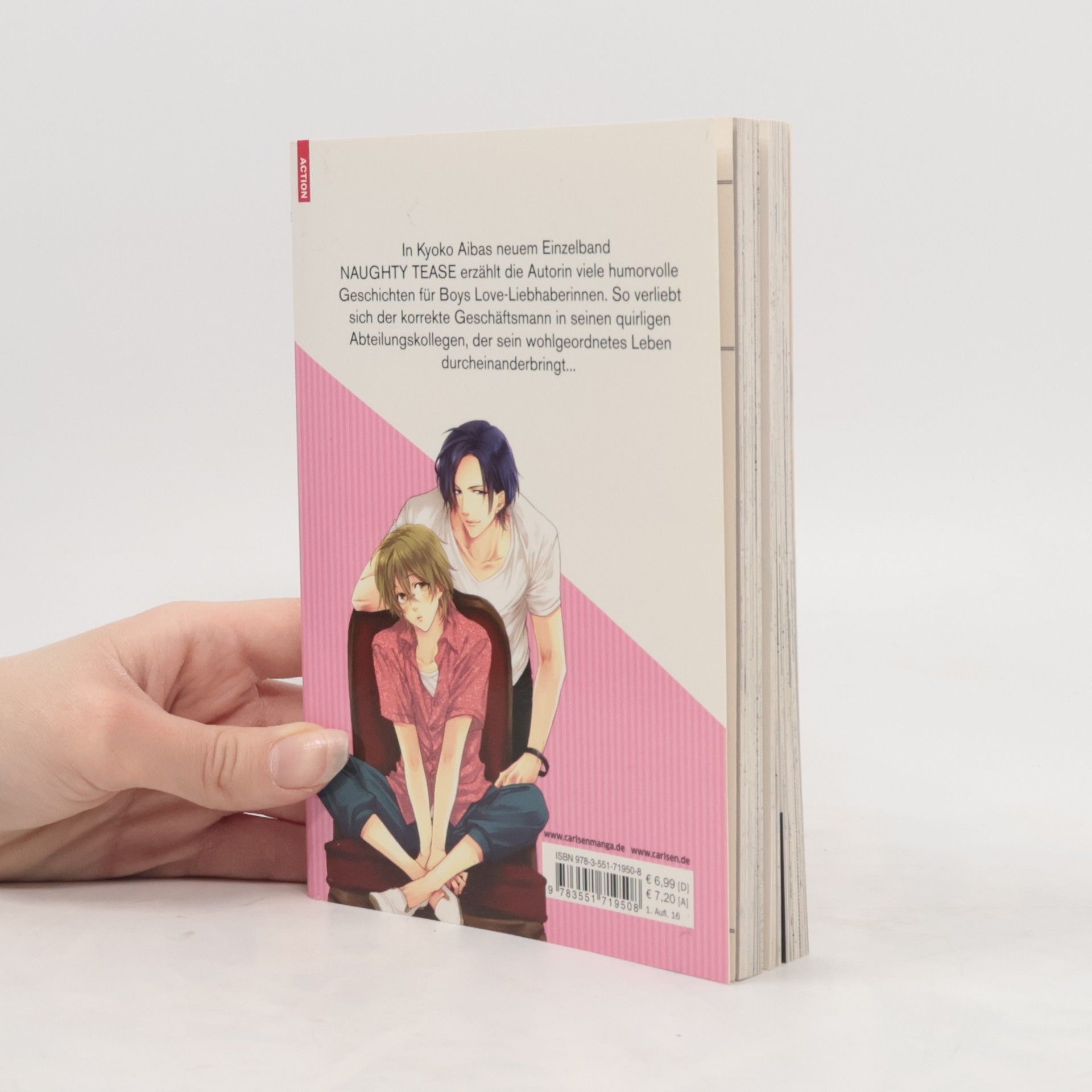 In Kyoko Aibas neuem Einzelband NAUGHTY TEASE erzählt die Autorin viele humorvolle Geschichten für Boys Love-Liebhaberinnen. So verliebt sich der unbedarfte und quirlige Misaya-kun in seinen neuen Nachbarn Hisashi Nikaido. Aber Schreck lass nach – der coole Typ ist ausgerechnet auch noch der neue Vorgesetzte!!