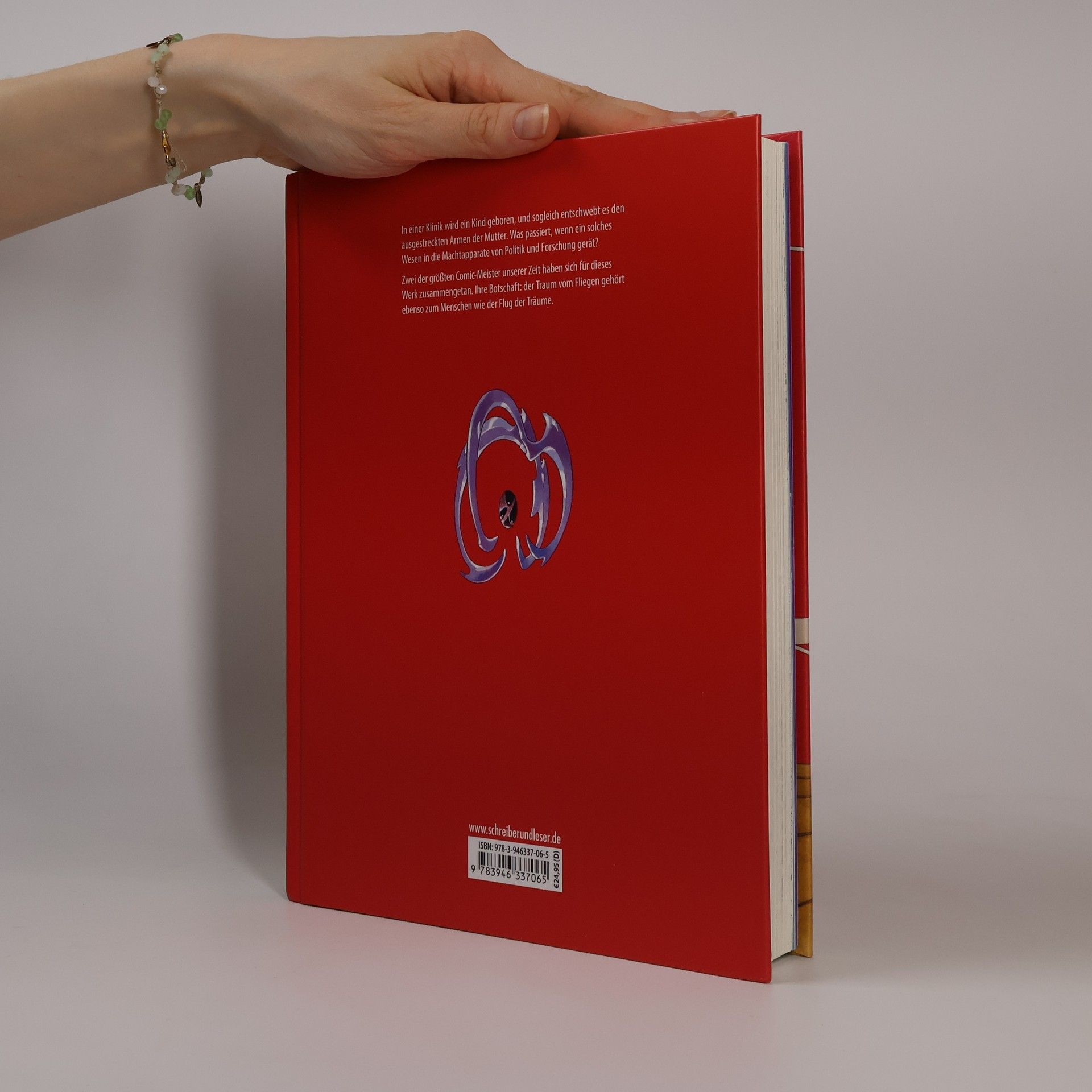 In einer Klinik wird ein Kind geboren, und sogleich entschwebt es den ausgestreckten Armen der Mutter. Was passiert, wenn ein solches Wesen in die Machtapparate von Politik und Forschung gerät? Zwei der größten Comic-Meister unserer Zeit haben sich für dieses Werk zusammengetan. Ihre Botschaft: der Traum vom Fliegen gehört ebenso zum Menschen wie der Flug der Träume.