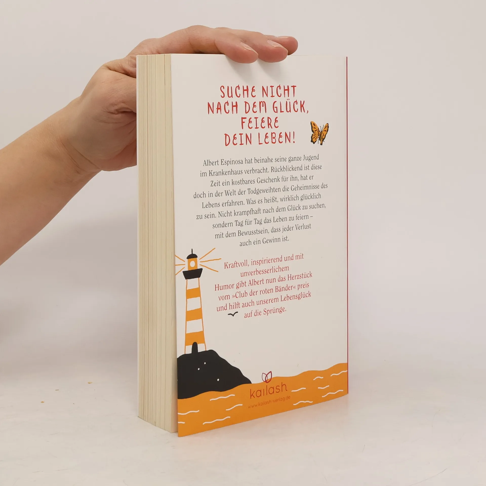 Albert Espinosa hat seinen langen Kampf gegen den Krebs gewonnen. Rückblickend sieht er seine Krankheitsgeschichte auch als Geschenk, hat er doch in dieser Zeit die eigentlichen Geheimnisse des Lebens erfahren: Was es heißt, wirklich glücklich zu sein. Nicht nach dem Glück zu suchen, sondern jeden Tag das Leben zu feiern, mit dem Bewusstsein, dass jeder Verlust auch ein Gewinn ist. In diesem Buch gibt Espinosa das Herzstück vom „Club der roten Bänder“ preis, in Form von kraftvollen Inspirationen, kreativen Übungen und originellen Illustrationen, und hilft damit auch unserem Lebensglück auf die Sprünge. Ausstattung: zahlreiche Abbildungen, zweifarbig