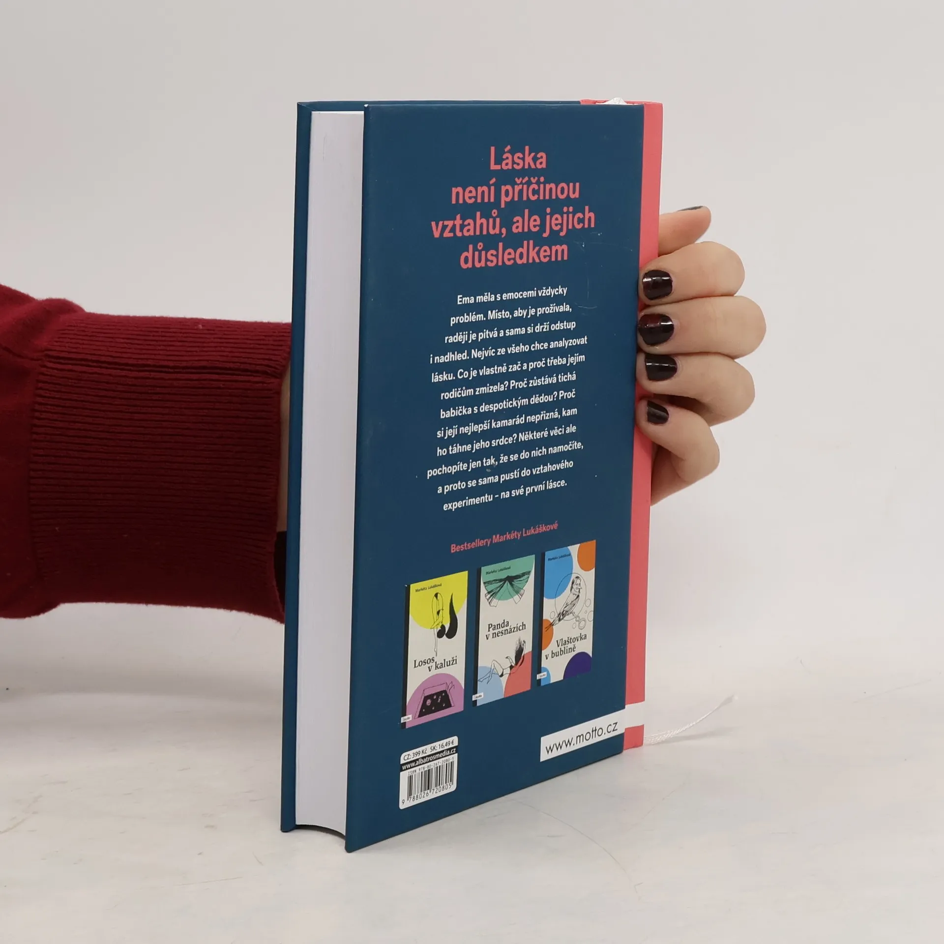 Láska není příčinou vztahů, ale jejich důsledkem Nový samostatný román Markéty Lukáškové. Se svou prvotinou Losos v kaluži objela republiku v rámci divadelního projektu Listování a napsala podle ní scénář, který nyní čeká na filmové zpracování. Po Lososovi následovaly knihy Panda v nesnázích, InTyMně a Vlaštovka v bublině. Skrze své tituly se Markéta snaží šířit osvětu o vnímání psychických problémů. Ema měla s emocemi vždycky problém. Místo, aby je prožívala, raději je pitvá a sama si drží odstup i nadhled. Nejvíc ze všeho chce analyzovat lásku. Co je vlastně zač a proč třeba jejím rodičům zmizela? Proč zůstává tichá babička s despotickým dědou? Proč si její nejlepší kamarád nepřizná, kam ho táhne jeho srdce? Některé věci ale pochopíte jen tak, že se do nich namočíte, a proto se sama pustí do vztahového experimentu – na své první lásce.