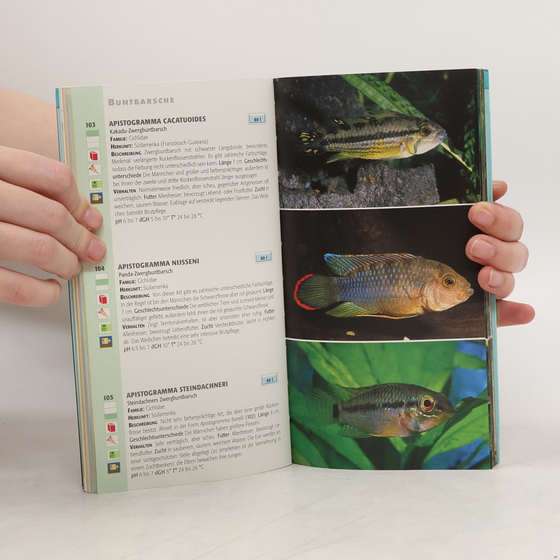 330 Aquarienfische auf einen Blick - Über 330 Arten von Aquarienfischen, jede mit brillantem Farbfoto - Alles Wissenswerte zu jeder Art: exakte Beschreibung, Familie, Herkunft, Größe, Verhalten, Ernährung und Fortpflanzungsweise - Infoleisten mit allen wichtigen Angaben zur Haltung und Pflege: Temperatur, pH-Wert, Wasserhärte und Beckengröße Übersichtlich, präzise, kompetent! Dieses handliche Naschlagebuch ist ideal zum Lernen, Erkennen und Bestimmen von über 330 Aquarienfischen. Erfahren Sie durch die zahlreichen Infoleisten alle wichtigen Angaben zur Haltung und Pflege. Eingehende Ausführungen zu Temperatur, pH-Wert, Wasserhärte und Beckengröße beantworten alle Ihre Fragen detailliert. Zudem versorgen Sie zusätzliche Informationen zur exakten Beschreibung, Familie, Herkunft, Größe, Verhalten, Ernährung und Fortpflanzungsweise mit allem Wissenswerten zu jeder Art. Durch seine hochwertige Ausstattung mit den praktischen Umschlagklappen haben Sie die kompetenten Antworten Ihrer Fragen schnell und einfach zur Hand. Der wertvolle Begleiter bei der Haltung von Aquarienfischen!