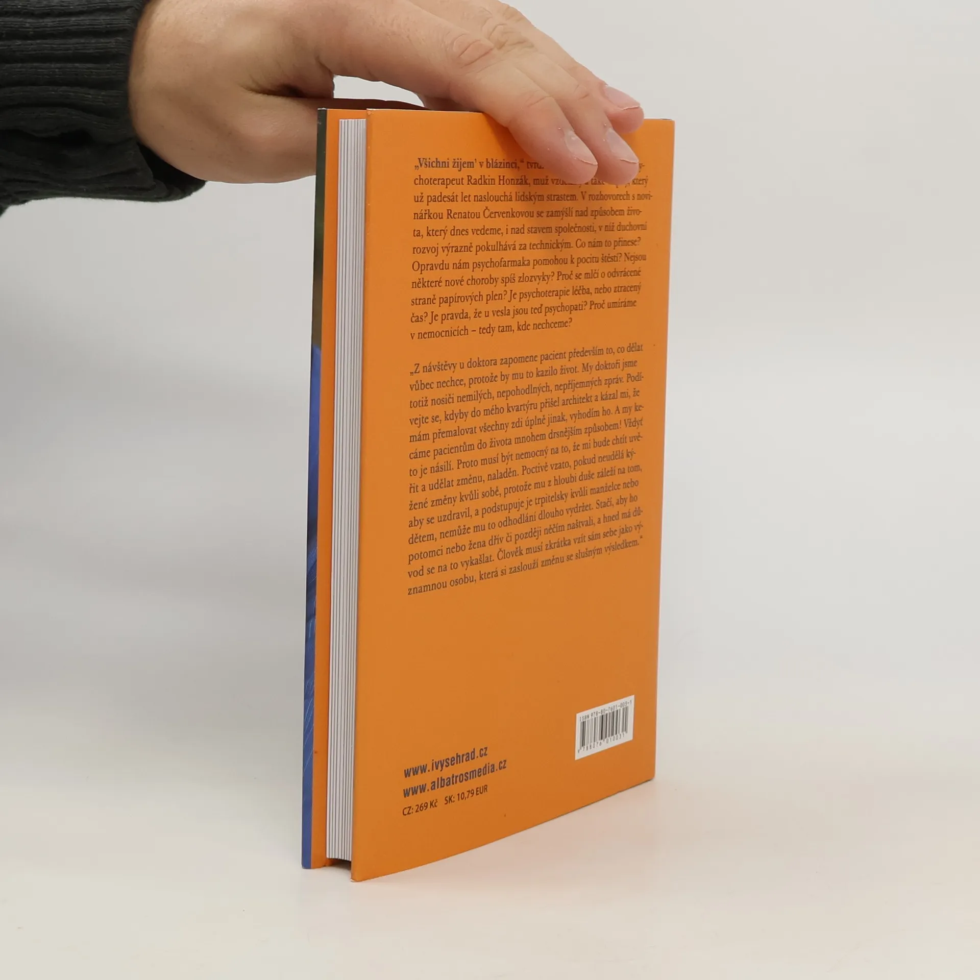 Renomovaný psychiatr a psychoterapeut Radkin Honzák, s padesátiletou praxí naslouchání lidským strastem, v rozhovorech s novinářkou Renatou Červenkovou zkoumá náš způsob života a stav společnosti, kde duchovní rozvoj zaostává za technickým pokrokem. Zajímá se o otázky jako: Jaké důsledky má náš životní styl? Opravdu psychofarmaka vedou k pocitu štěstí? Jsou některé nové choroby spíše zlozvyky? Proč se mlčí o negativních aspektech papírových plen? Je psychoterapie skutečnou léčbou, nebo ztraceným časem? A proč umíráme v nemocnicích, kde to nechceme? Tato témata nejsou příliš povzbudivá, ale Honzák je komentuje s nadhledem a ironií, upozorňující na fenomény dnešní doby, které se „příčí Matce přírodě“ a zajišťují psychiatrům dostatek pacientů do budoucna. Radkin Honzák (* 1939) absolvoval Fakultu všeobecného lékařství UK v Praze v roce 1962 a od té doby pracoval v různých psychiatrických institucích, včetně IKEM a PL Bohnice, kde se věnoval výzkumu a ambulantní psychiatrii. Dnes působí jako asistent na 1. Lékařské fakultě UK.