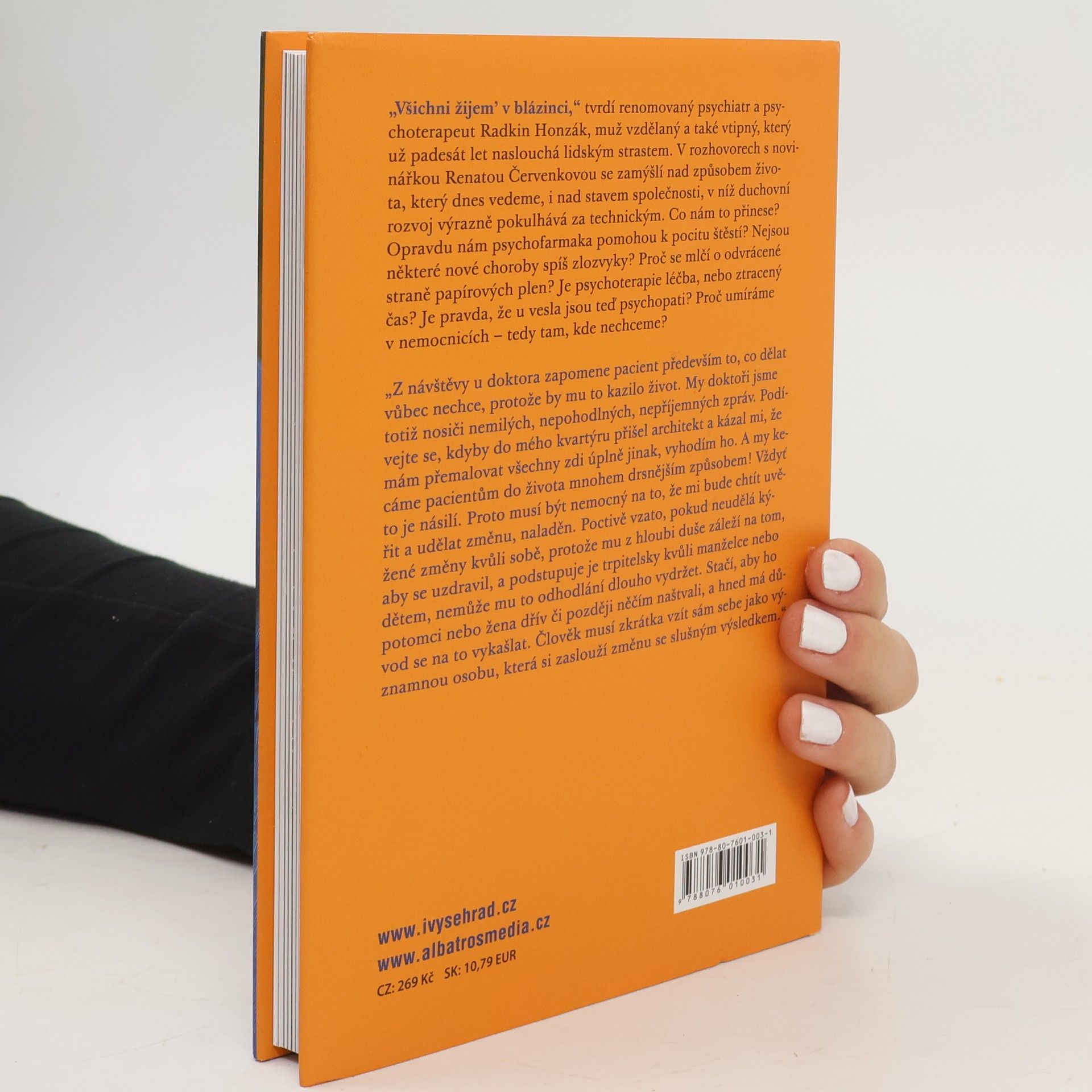 Renomovaný psychiatr a psychoterapeut Radkin Honzák, s padesátiletou praxí naslouchání lidským strastem, v rozhovorech s novinářkou Renatou Červenkovou zkoumá náš způsob života a stav společnosti, kde duchovní rozvoj zaostává za technickým pokrokem. Zajímá se o otázky jako: Jaké důsledky má náš životní styl? Opravdu psychofarmaka vedou k pocitu štěstí? Jsou některé nové choroby spíše zlozvyky? Proč se mlčí o negativních aspektech papírových plen? Je psychoterapie skutečnou léčbou, nebo ztraceným časem? A proč umíráme v nemocnicích, kde to nechceme? Tato témata nejsou příliš povzbudivá, ale Honzák je komentuje s nadhledem a ironií, upozorňující na fenomény dnešní doby, které se „příčí Matce přírodě“ a zajišťují psychiatrům dostatek pacientů do budoucna. Radkin Honzák (* 1939) absolvoval Fakultu všeobecného lékařství UK v Praze v roce 1962 a od té doby pracoval v různých psychiatrických institucích, včetně IKEM a PL Bohnice, kde se věnoval výzkumu a ambulantní psychiatrii. Dnes působí jako asistent na 1. Lékařské fakultě UK.