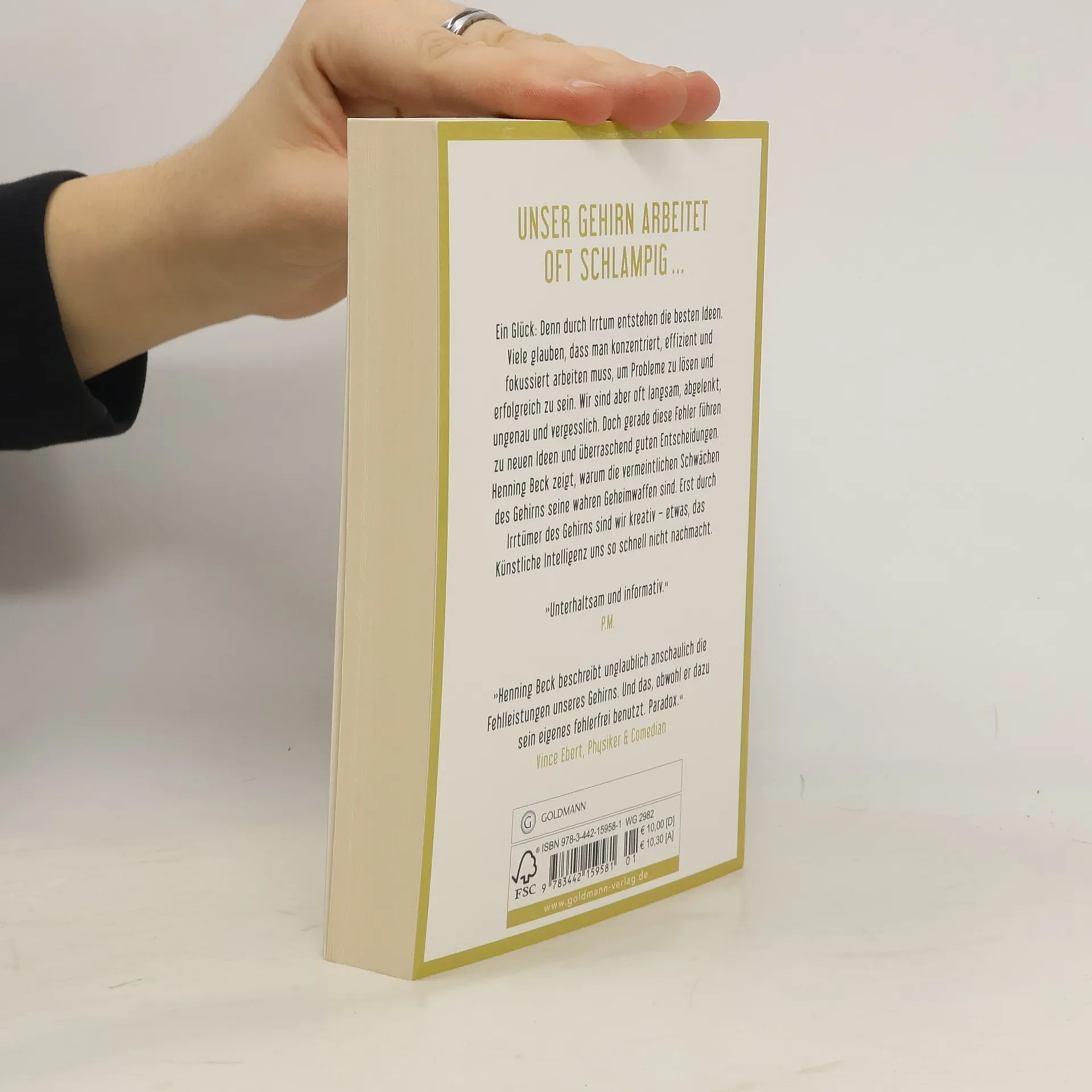 Das Gehirn hat für Ablenkung eine angeborene Schwäche. Und das ist gut so. Viele glauben, dass man konzentriert, effizient und fokussiert arbeiten muss, um Probleme zu lösen und erfolgreich zu sein. Wir sind aber oft langsam, abgelenkt, ungenau und vergesslich. Doch gerade diese Fehler führen zu neuen Ideen und überraschend guten Entscheidungen. Henning Beck zeigt, warum die vermeintlichen Schwächen des Gehirns seine wahren Geheimwaffen sind. Erst durch Irrtümer des Gehirns sind wir kreativ – etwas, das Künstliche Intelligenz uns so schnell nicht nachmacht. Dieses Buch ist ein neurobiologischer Mutmacher, der uns spielerisch leicht zu mehr Konzentration und Entscheidungsstärke und Kreativität verhilft.