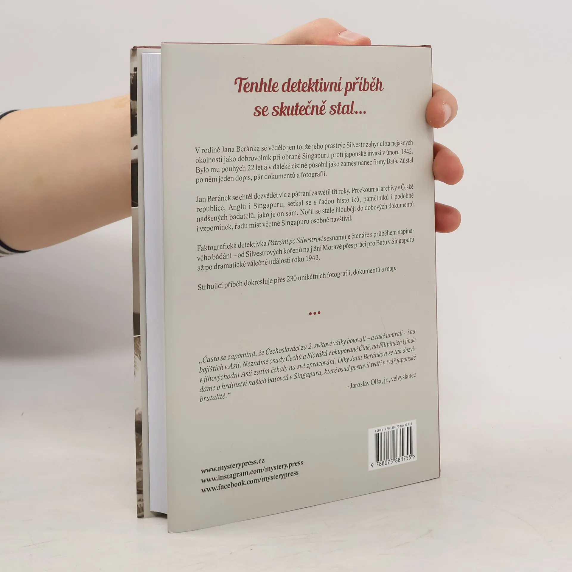 TENHLE DETEKTIVNÍ PŘÍBĚH SE SKUTEČNĚ STAL… Autorův prastrýc Silvestr Němec se narodil v jihomoravských Vémyslicích a v devatenácti letech odjel jako zaměstnanec firmy Baťa do Singapuru. Zde, tak daleko od domova, ho zastihly válečné události a Silvestr zahynul za nejasných okolností jako dobrovolník při obraně Singapuru proti japonské invazi v únoru 1942. Jan Beránek se chtěl dozvědět víc a tři roky zasvětil zkoumání Silvestrových osudů a okolností jeho smrti. Takřka detektivní pátrání ho přivedlo do archivů ve Zlíně, Znojmě a Praze, ale i v Londýně a Singapuru. S pomocí dalších historiků a pamětníků se mu podařilo shromáždit řadu unikátních fotografií a dosud nepublikovaných dokumentů, včetně deníků a vzpomínek několika singapurských baťovců. Kniha popisuje autorovo pátrání od prvních okamžiků, čtenář se postupně seznámí se Silvestrovým rodinným zázemím, s prací u Bati i podmínkami, za jakých stovky mladých pracovníků vyrážely do exotické ciziny. Největší pozornost je samozřejmě věnována Silvestrovu působení v Singapuru a dramatickým událostem, které vedly až k jeho předčasné smrti. O ní na základě dochovaných pramenů, hovorů s potomky pamětníků, spekulací i zkušeností z osobní návštěvy Singapuru Jan Beránek nakonec zjistil více, než zpočátku doufal…