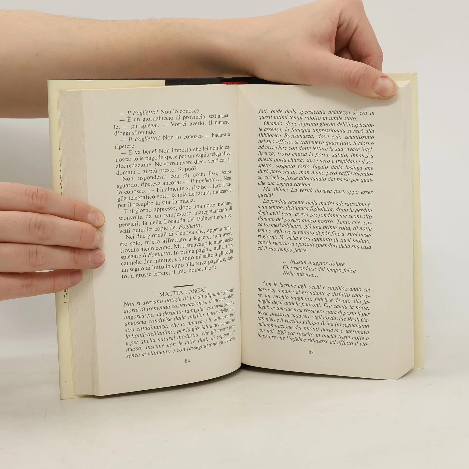 ‟Una delle poche cose, anzi forse la sola ch'io sapessi di certo era questa: che mi chiamavo Mattia Pascal.” È l'incipit del romanzo più noto di Luigi Pirandello: Il fu Mattia Pascal (1904). In esso è contenuta la cellula generativa dell'intero libro. Quando lo scrisse, lo scrittore siciliano ne sapeva quanto chi, scorse queste prime righe, si predispone alla lettura. Scelti nome e cognome, cominciano le peripezie del personaggio, il quale presto si trova in una situazione simile a quella dell'autore: deve lui stesso dare vita a ‟un uomo inventato”. Durante questa vera e propria avventura dei nomi, il libro assume la sua forma pienamente novecentesca, nella quale autobiografia e biografia immaginaria si confondono. Consanguineo di quelli che saranno i sei personaggi in cerca d'autore, Mattia Pascal sembra a tratti lanciare messaggi al lettore perché lo liberi dal vincolo cartaceo e dunque dalla sua muta solitudine. ‟La coscienza ironica e ascetica trova nella letteratura l'unico modo di operare che non entra in collisione con il mondo. La trasformazione della vita in letteratura, dopo la rottura ironica con quell'io che correva per il mondo in cerca della libertà e della felicità, conferma che soltanto la pacificazione con se stesso è il vero eden e l'unica utopia realizzabile.” (dal commento di Antonio Gagliardi)