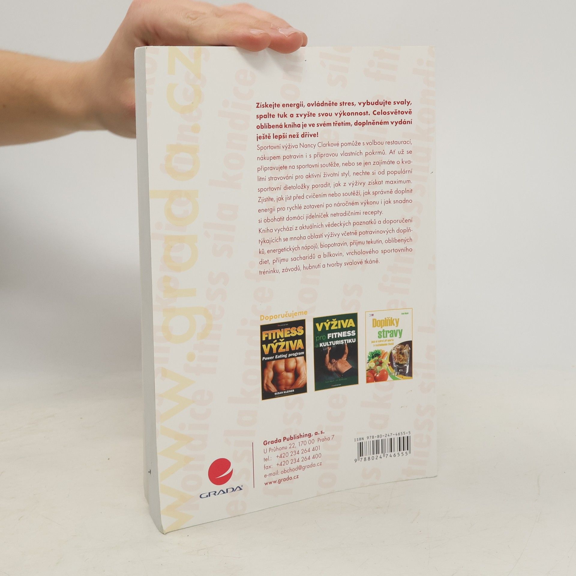Získejte energii, ovládněte stres, vybudujte svaly, spalte tuk a zvyšte svou výkonnost. Celosvětově oblíbená kniha je ve svém třetím, doplněném vydání ještě lepší než dříve! Sportovní výživa Nancy Clarkové pomůže s volbou restaurací, nákupem potravin i s přípravou vlastních pokrmů. Ať už se připravujete na sportovní soutěže, nebo se jen zajímáte o kvalitní stravování pro aktivní životní styl, nechte si od populární sportovní dietoložky poradit, jak z výživy získat maximum. Zjistíte, jak jíst před cvičením nebo soutěží, jak správně doplnit energii pro rychlé zotavení po náročném výkonu i jak snadno si obohatit domácí jídelníček netradičními recepty. Kniha vychází z aktuálních vědeckých poznatků a doporučení týkajících se mnoha oblastí výživy včetně potravinových doplňků, energetických nápojů, biopotravin, příjmu tekutin, oblíbených diet, příjmu sacharidů a bílkovin, vrcholového sportovního tréninku, závodů, hubnutí a tvorby svalové tkáně. Potřebujete-li více energie pro kondiční cvičení nebo na podporu zdraví, či chcete-li dosahovat maximálním sportovních výkonů, třetí, doplněné vydání knížky Sportovní výživa vám poskytne důvěryhodné odpovědi na všechny vaše otázky.