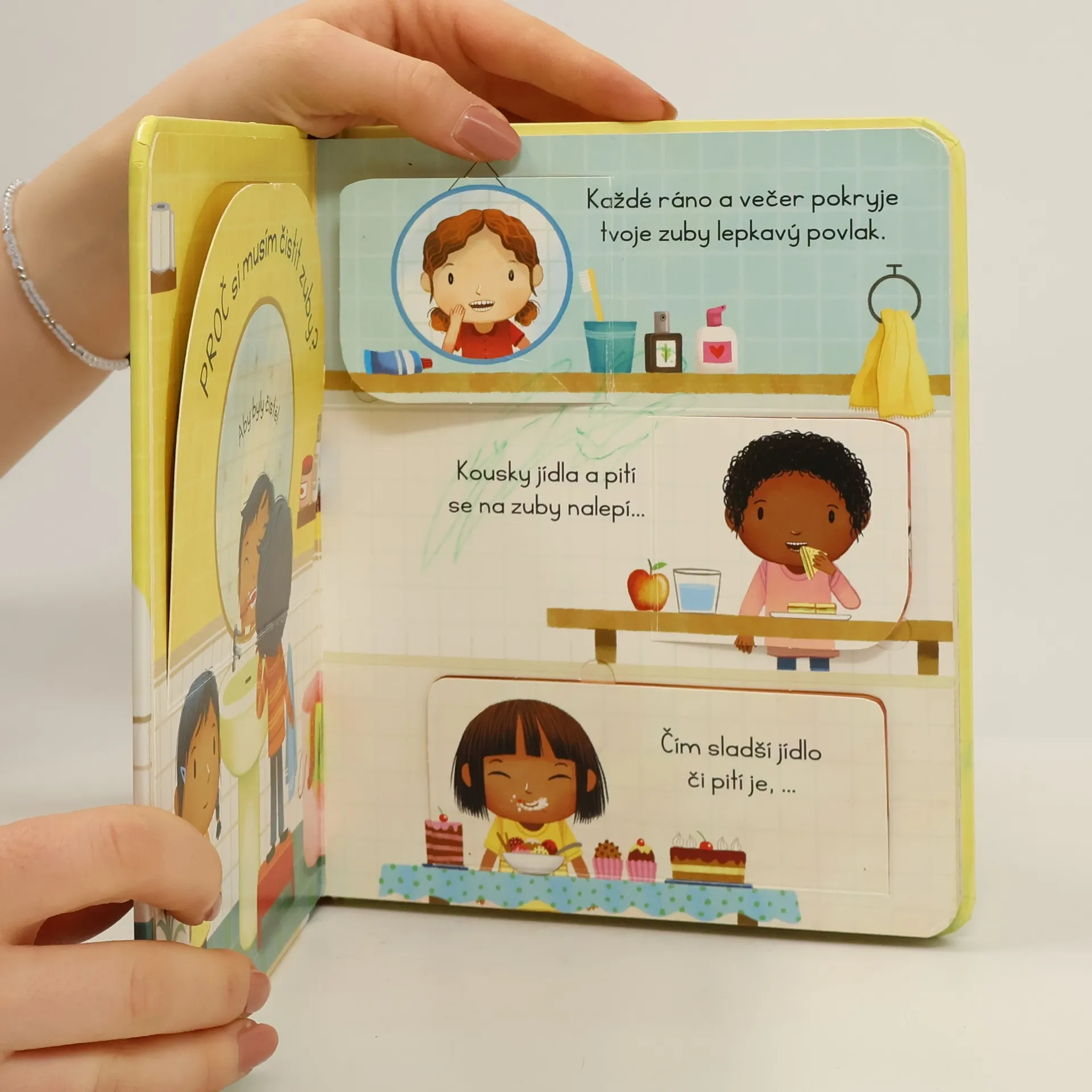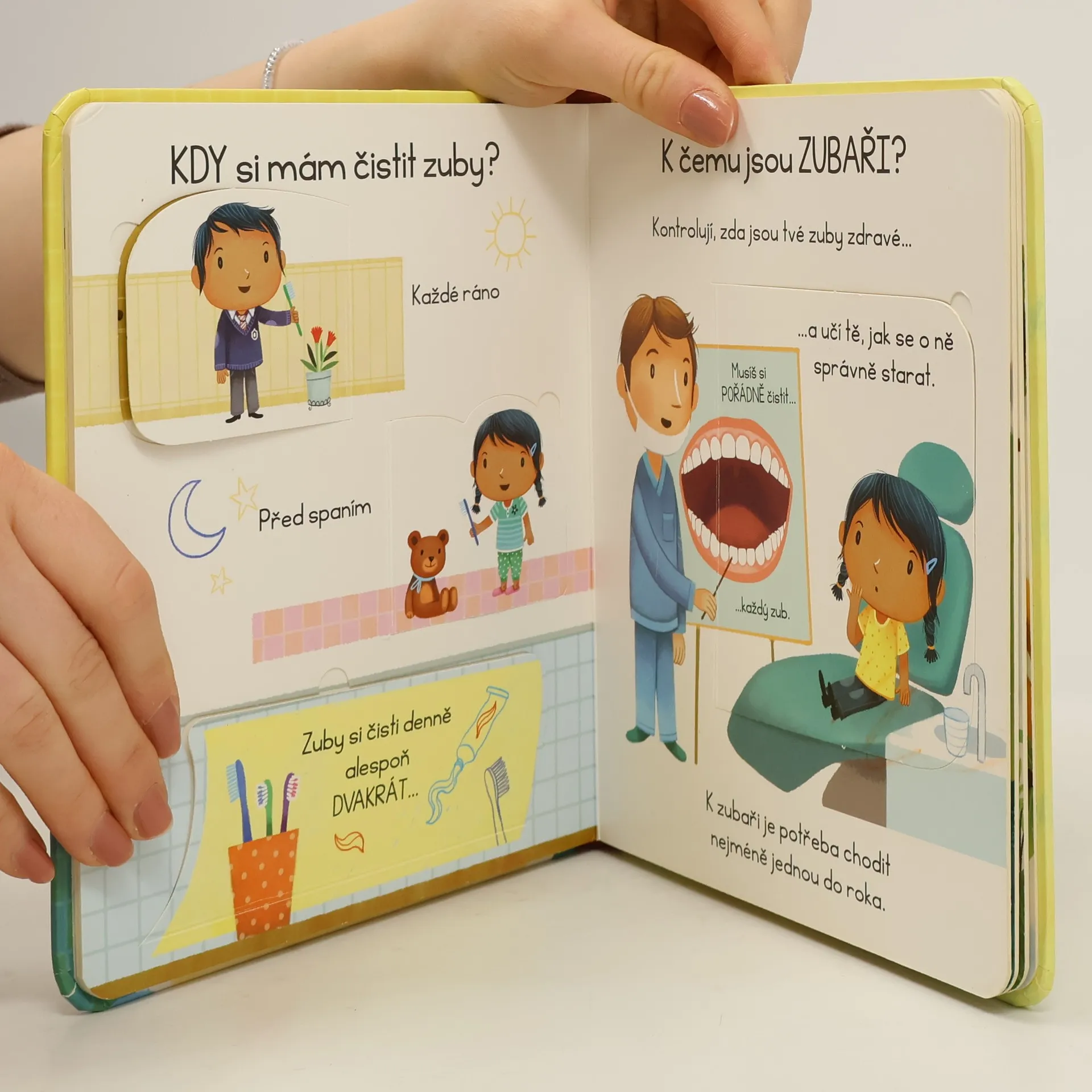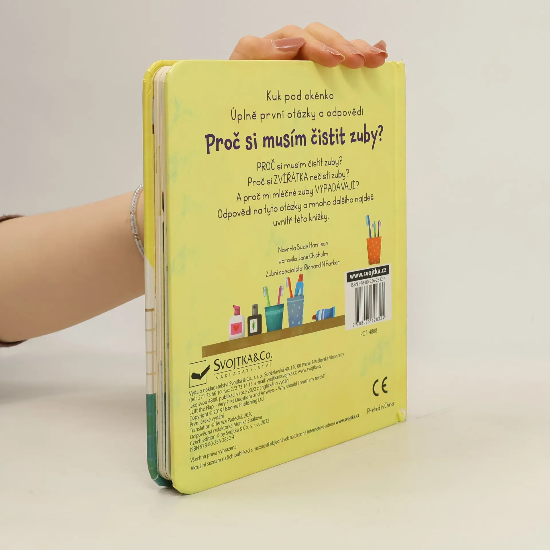 Nechce si vaše dítě čistit zuby? Bojí se zubařů? A co když vytáhne ten nejtěžší kalibr: "Zvířátka si taky nemusí čistit zuby!" Tato ilustrovaná knížka s odklápěcími okénky obsahuje odpovědi na nejčastější otázky dětí o zubech. Vysvětluje, k čemu jsou zuby dobré, proč dětem vypadávají, proč je důležité se o ně správně starat a chodit pravidelně k zubaři. A vysvětluje i to, že se zvířátka také o svůj chrup starají, i když nemají žádný kartáček. Díky tomuto krásně ilustrovanému leporelu už bude ranní a večerní hygiena jedna velká zábava!