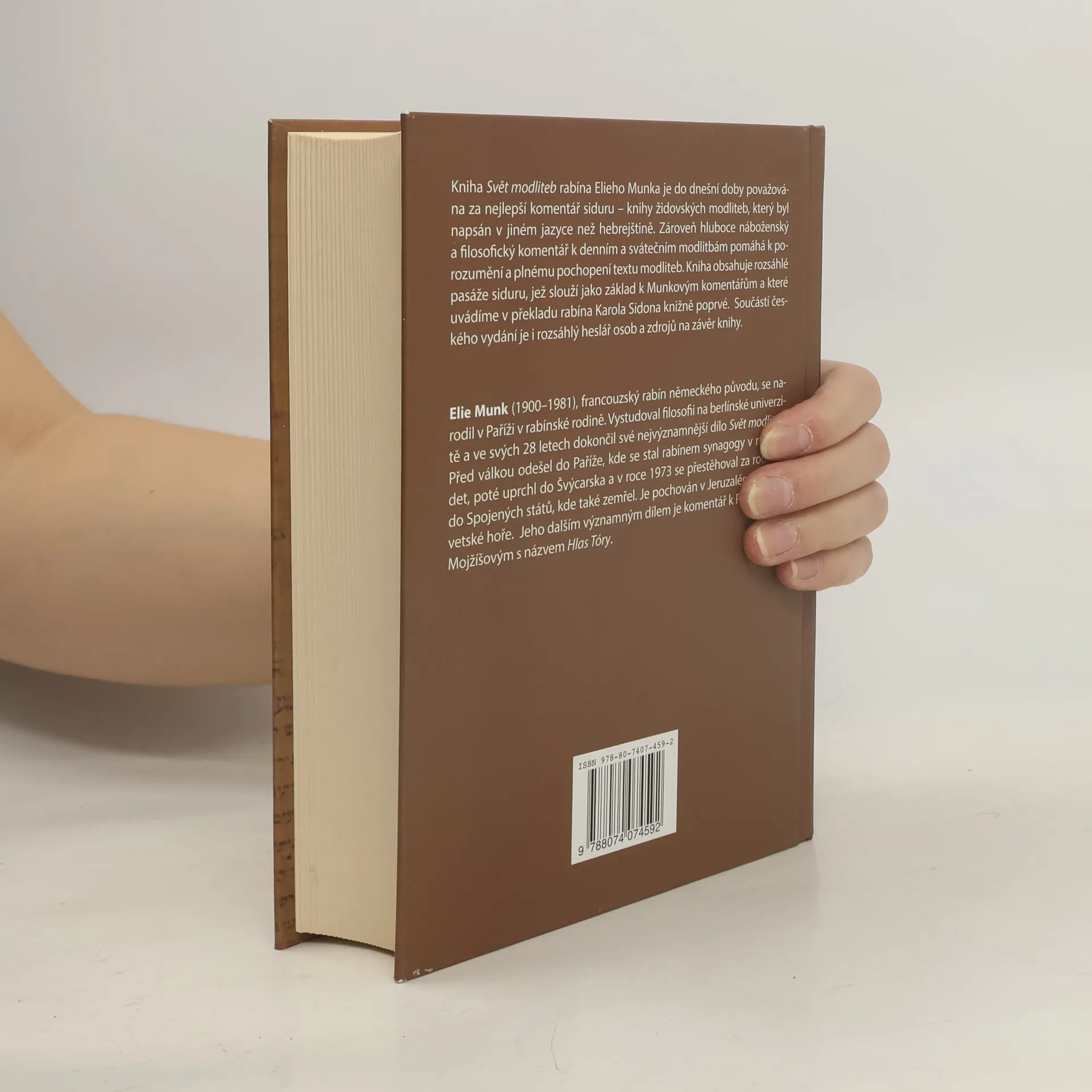 Kniha Svět modliteb rabína Elieho Munka je do dnešní doby považována za nejlepší komentář k židovským modlitbám, který byl napsán v jiném jazyce než hebrejštině. Zároveň hluboce náboženský a filosofický komentář k denním i svátečním modlitbám pomáhá k porozumění a plnému pochopení textu modliteb. Součástí knihy a Munkových komentářů jsou i části modlitební knihy-siduru, které uvádíme poprvé knižně v překladu rabína Karola Sidona. Kniha je rozdělena do dvou částí, na Denní a Sváteční modlitby, a obsahuje kromě velkých částí samotného siduru i komentáře k jednotlivým výrazům v modlitbách a obsáhlý, v českém prostředí ojedinělý, heslář ke zdrojům, z nichž Elie Munk čerpal. Elie Munk (1900–1981), francouzský ortodoxní rabín německého původu, se narodil v Paříži v rodině rabínů. Vystudoval filosofii na berlínské univerzitě a ve svých 28 letech dokončil své nejvýznamnější dílo Svět modliteb. Před válkou odešel do Paříže, kde se stal rabínem synagogy v rue Cadet. Poté uprchl do Švýcarska, ale po válce se vrátil zpět do synagogy v rue Cadet. V roce 1973 se přestěhoval za svojí rodinou do Spojených států, kde také zemřel. Je pochován v Jeruzalémě na Olivetské hoře. Jeho dalším významným dílem je komentář k Pěti knihám Mojžíšovým s názvem Hlas Tóry.