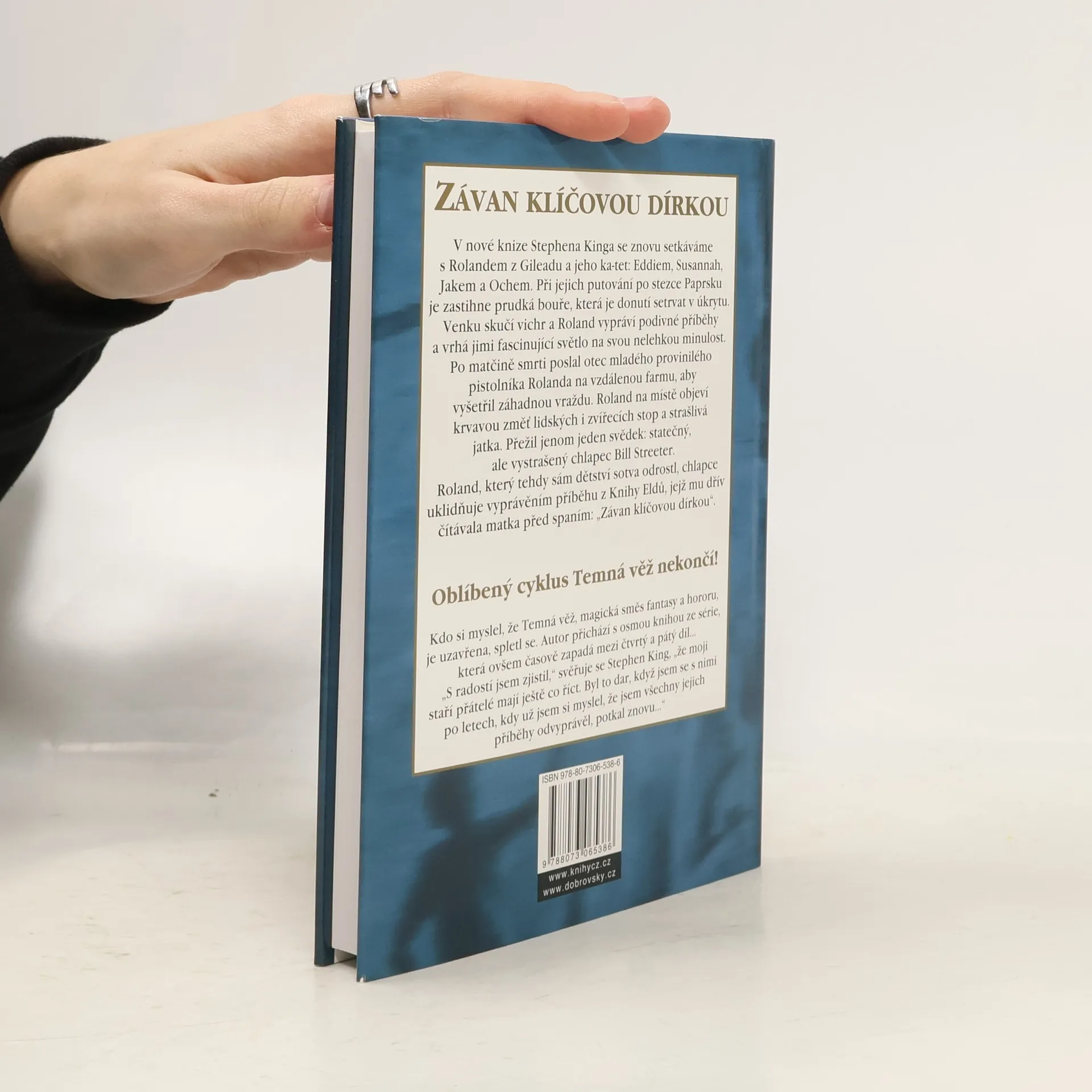 Čtenáři cyklu Temná věž se zde znovu setkají s Rolandem z Gileadu a jeho ka-tet: Eddiem, Susannah, Jakem a Ochem. Při jejich putování po stezce Paprsku je zastihne prudká bouře, která je donutí nějakou dobu setrvat v úkrytu. Venku skučí vichr a praskají stromy, a Roland zatím vypráví ne jeden podivný příběh, ale dva, a vrhá jimi fascinující světlo na svou těžkou minulost. Po smrti matky poslal otec mladého provinilého pistolníka Rolanda na vzdálenou farmu, aby vyšetřil záhadnou vraždu. Roland na místě objeví krvavou změť lidských i zvířecích stop a strašlivá jatka. Přežil jenom jeden svědek: statečný, ale vystrašený chlapec Bill Streeter. Roland, který tehdy sám dětství sotva odrostl, chlapce uklidňuje vyprávěním příběhu z Knihy Eldů, jejž mu dřív čítávala matka před spaním: Závan klíčovou dírkou. „Člověk není nikdy příliš starý na příběhy," říká Roland Billovi. „Muž i chlapec, dívka i žena, všichni žijí jen pro ně." Román Závan klíčovou dírkou se chronologicky řadí mezi čtvrtý a pátý díl cyklu Temná věž, tedy mezi knihy Čaroděj a sklo a Vlci z Cally. První vydání.
