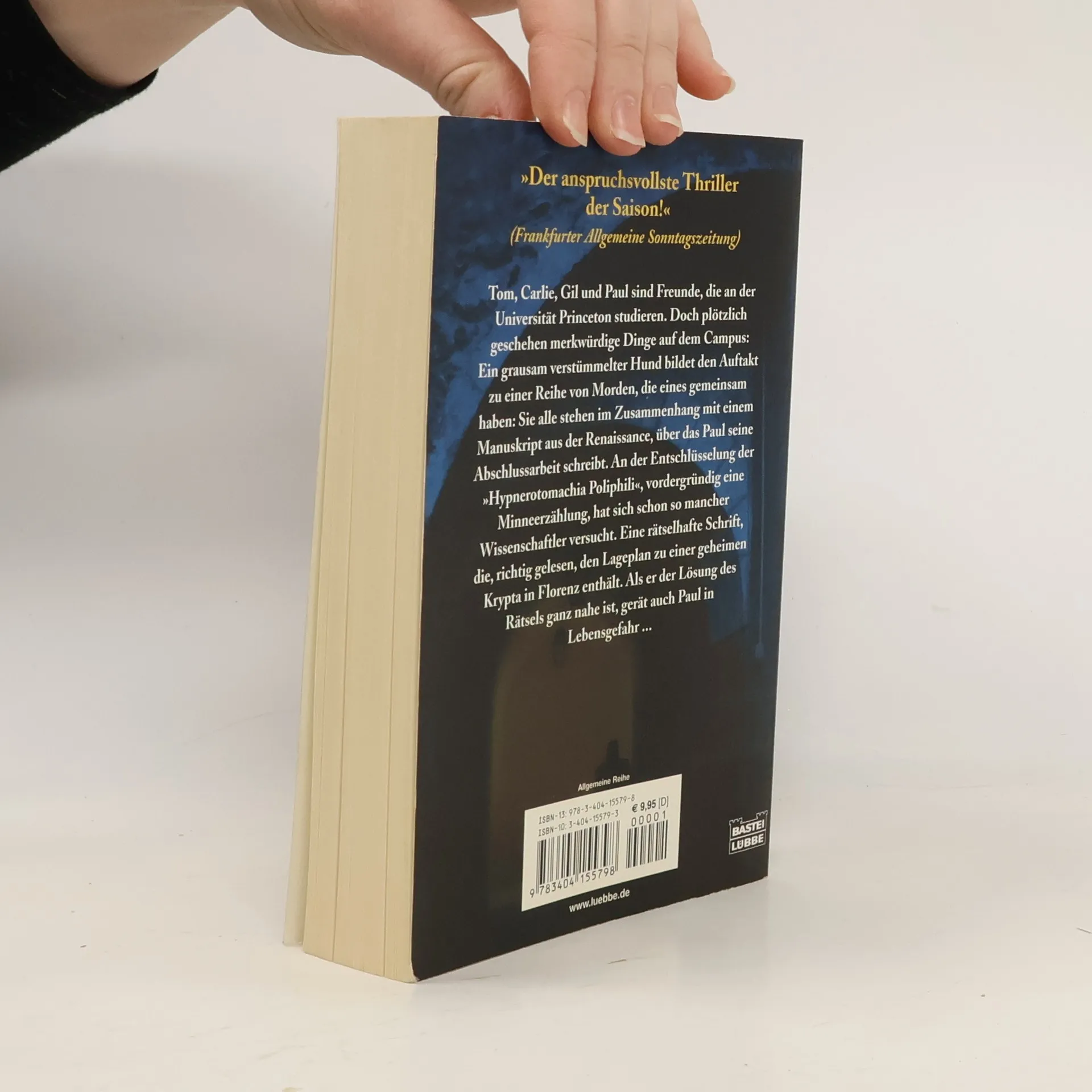 Tom, Carlie, Gil und Paul sind Freunde, die an der Universität Princeton studieren. Doch plötzlich geschehen merkwürdige Dinge auf dem Campus: Ein grausam verstümmelter Hund bildet den Auftakt zu einer Reihe von Morden, die eines gemeinsam haben: Sie alle stehen im Zusammenhang mit einem Manuskript aus der Renaissance, über das Paul seine Abschlussarbeit schreibt. An der Entschlüsselung der „Hypnerotomania Poliphili“, vordergründig eine Minneerzählung, hat sich schon so mancher Wissenschaftler versucht. Eine rätselhafte Schrift, die, richtig gelesen, den Lageplan zu einer geheimen Krypta in Florenz enthält. Als er der Lösung des Rätsels ganz nahe ist, gerät auch Paul in Lebensgefahr ...