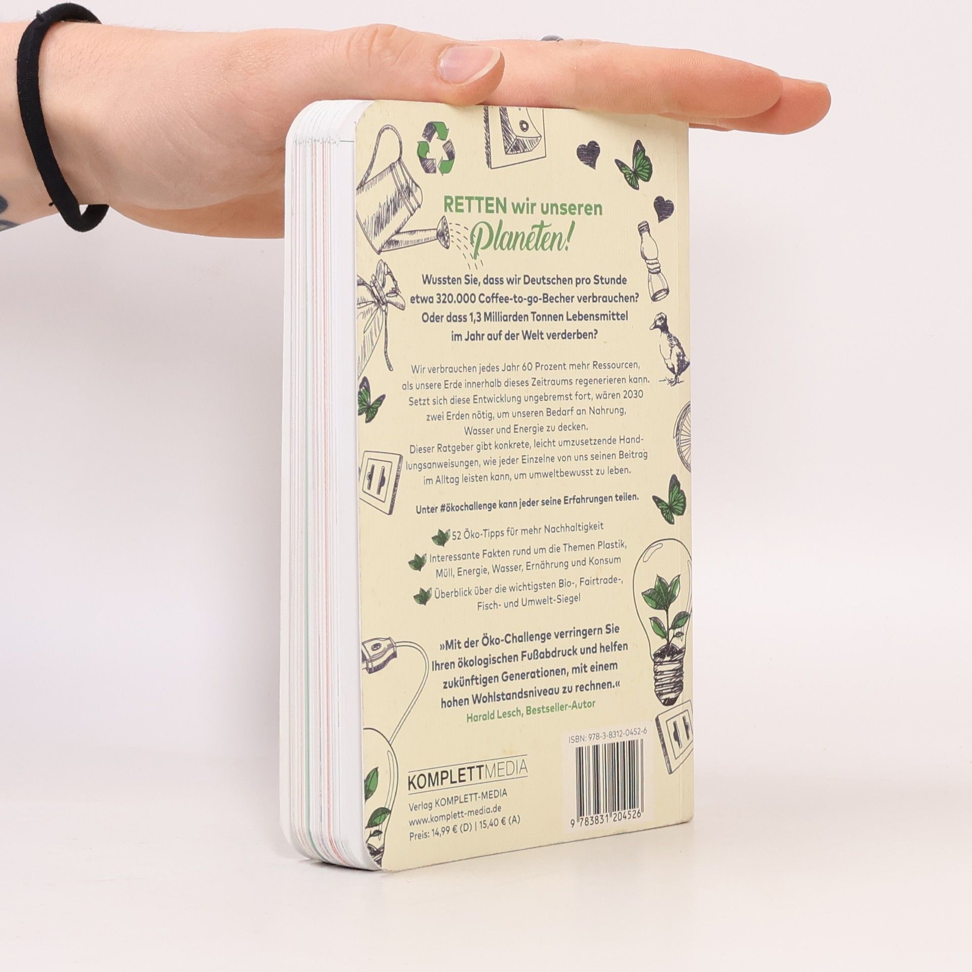 Wussten Sie, dass wir Deutschen pro Stunde etwa 320.000 Coffee-to-go-Becher verbrauchen? Oder dass 1,3 Milliarden Tonnen Lebensmittel im Jahr auf der Welt verderben?Wir verbrauchen jedes Jahr 60 Prozent mehr Ressourcen, als unsere Erde innerhalb dieses Zeitraums regenerieren kann. Setzt sich diese Entwicklung ungebremst fort, wären 2030 zwei Erden nötig, um unseren Bedarf an Nahrung, Wasser und Energie zu decken.Jeder einzelne von uns kann seinen Beitrag im Alltag leisten, um diese Entwicklung aufzuhalten, denn wir sind Teil des globalen Handelns durch unseren Konsum und Verbrauch.Dieser Ratgeber gibt konkrete, leicht umzusetzende Handlungsanweisungen, wie Sie umweltbewusst leben können. Unter #ökochallenge kann jeder seine Erfahrungen teilen.- 52 Öko-Tipps für mehr Nachhaltigkeit- Interessante Fakten rund um die Themen Plastik, Müll, Energie, Wasser, Ernährung und Konsum- Überblick über die wichtigsten Bio-, Fairtrade-, Fisch- und Umweltsiegel