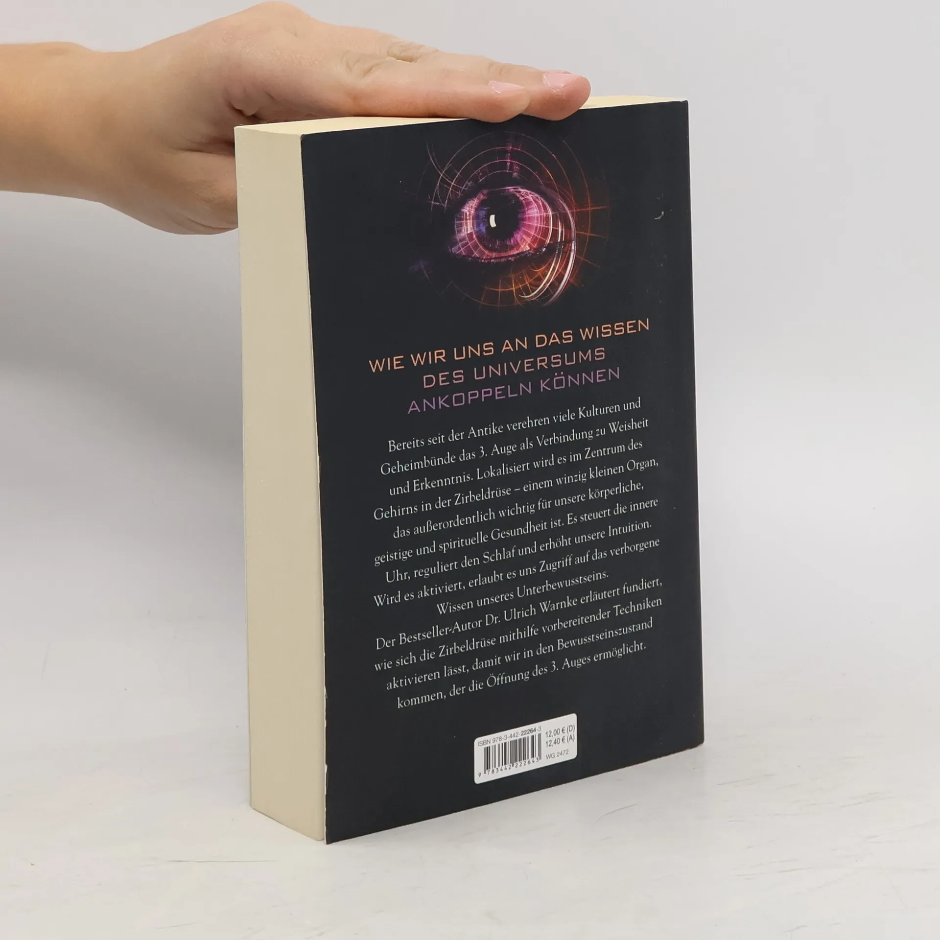 Wie wir uns an das Wissen des Universums ankoppeln können Bereits seit der Antike verehren viele Kulturen und Geheimbünde das dritte Auge als Verbindung zu Weisheit und Erkenntnis. Lokalisiert wird es im Zentrum des Gehirns in der Zirbeldrüse – einem winzig kleinen Organ, das außerordentlich wichtig für unsere körperliche, geistige und spirituelle Gesundheit ist. Es steuert die innere Uhr, reguliert den Schlaf und erhöht unsere Intuition. Wird es aktiviert, erlaubt es uns Zugriff auf verborgenes Wissen unseres Unterbewusstseins. Dr. Ulrich Warnke erläutert fundiert, wie sich die Zirbeldrüse mithilfe vorbereitender Techniken aktivieren und wie sich der Bewusstseinszustand herbeiführen lässt, der die Öffnung des dritten Auges ermöglicht.
