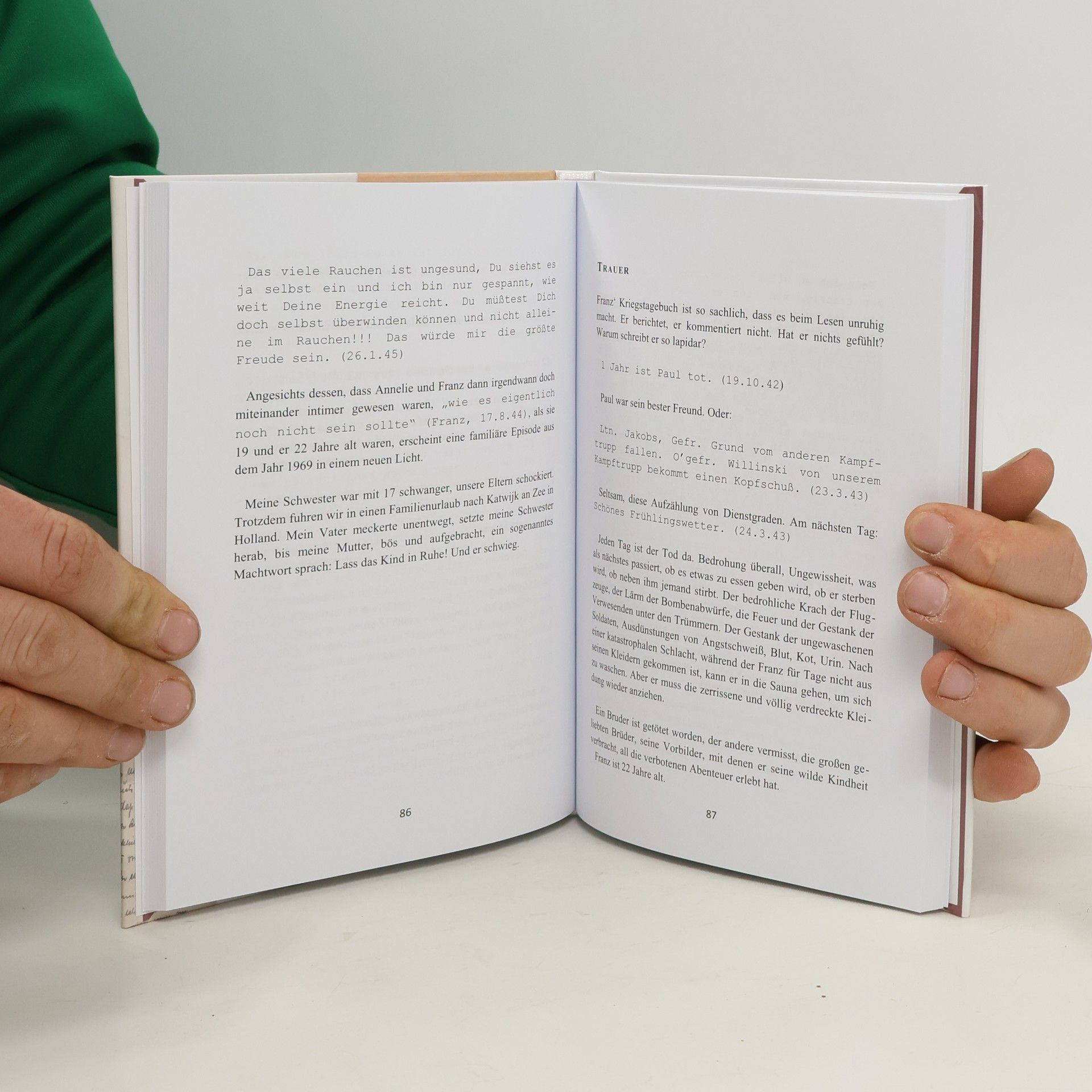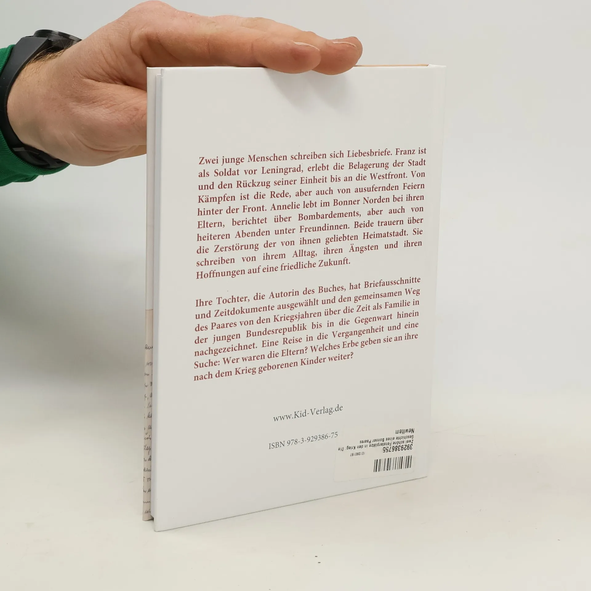 Zwei junge Menschen schreiben sich Liebesbriefe. Franz ist als Soldat vor Leningrad, erlebt die Belagerung der Stadt und den Rückzug seiner Einheit bis an die Westfront. Von Kämpfen ist die Rede, aber auch von ausufernden Feiern hinter der Front. Annelie lebt im Bonner Norden bei ihren Eltern, berichtet über Bombardements, aber auch von heiteren Abenden unter Freundinnen. Beide trauern über die Zerstörung der von ihnen geliebten Heimatstadt. Sie schreiben von ihrem Alltag, ihren Ängsten und ihren Hoffnungen auf eine friedliche Zukunft. Ihre Tochter, die Autorin des Buches, hat Briefausschnitte und Zeitdokumente ausgewählt und den gemeinsamen Weg des Paares von den Kriegsjahren über die Zeit als Familie in der jungen Bundesrepublik bis in die Gegenwart hinein nachgezeichnet. Eine Reise in die Vergangenheit und eine Suche: Wer waren die Eltern? Welches Erbe geben sie an ihre nach dem Krieg geborenen Kinder weiter?