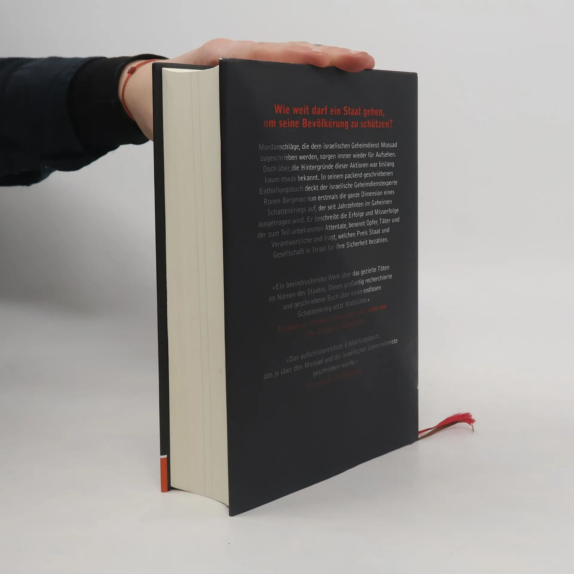 "Ronen Bergmans Buch erzahlt jetzt auf uber 800 hochspannenden Seiten die Geschichte des israelischen Geheimdienstes. ER hat acht Jahre an dem Buch gearbeitet, tausende Dokumente gesichtet und Interviews mit Angehorigen des Mossad gefuhrt. EIne beachtliche Leistung. ES gelingt ihm sogar, hinter die Fassaden des Mossad zu blicken. HErausgekommen ist das Portrat eines der umstrittensten und geheimsten Geheimdienste der Welt." ARD "titel, thesen, temperamente"