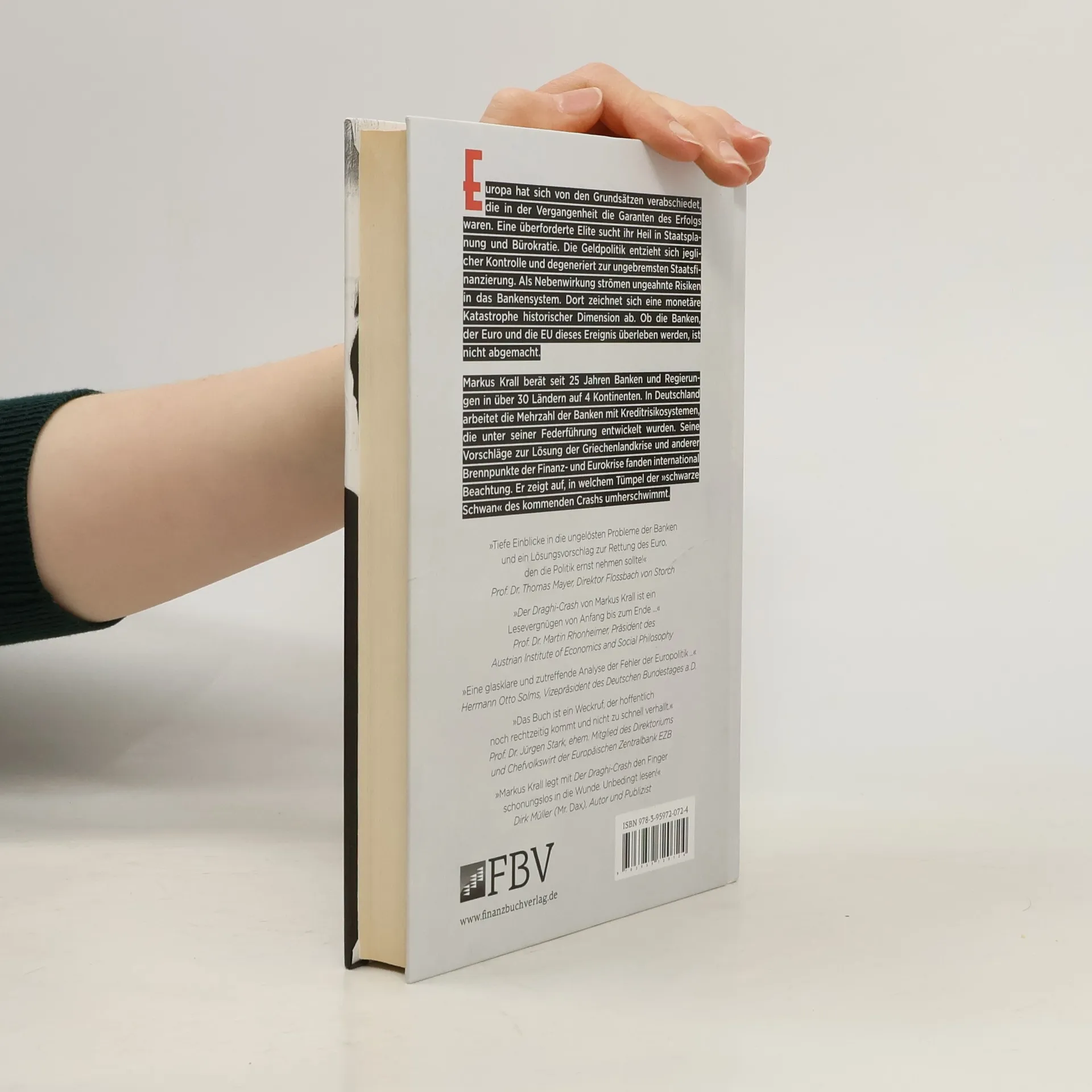 Politik und Geldpolitik in Europa haben sich von den früheren Erfolgsgrundsätzen entfernt. Die Finanzkrise und ihre anhaltenden Folgen führen dazu, dass eine verunsicherte Elite in Staatsplanung, Intervention und Bürokratie flüchtet. Die Geldpolitik von Mario Draghi als Chef der Europäischen Zentralbank entzieht sich jeglicher Kontrolle und hat sich zur ungebremsten Staatsfinanzierung entwickelt. Dies wird voraussichtlich in einer historischen monetären Krise enden. Die Politik des billigen Geldes hat eine massive Umverteilung von Nord nach Süd ausgelöst, die Bankenerträge erodiert und zu einer schleichenden Anhäufung von Risiken in den Kreditinstituten geführt. Diese Risiken werden sich irgendwann entladen, und es ist ungewiss, ob die Banken Europas und das gegenwärtige Europa diese Herausforderung überstehen werden. Markus Krall berät seit über 25 Jahren Banken, Versicherungen, Regierungen und multinationale Unternehmen in über 30 Ländern zu Strategie, Risikomanagement und Regulierung. In Deutschland nutzen viele Banken Kreditrisikosysteme, die unter seiner Leitung entwickelt wurden. Seine Lösungsansätze zur Griechenlandkrise und anderen finanziellen Brennpunkten fanden internationale Beachtung. Er führt kompetent durch die Materie und zeigt auf, wo der „schwarze Schwan“ des Crashs lauert.