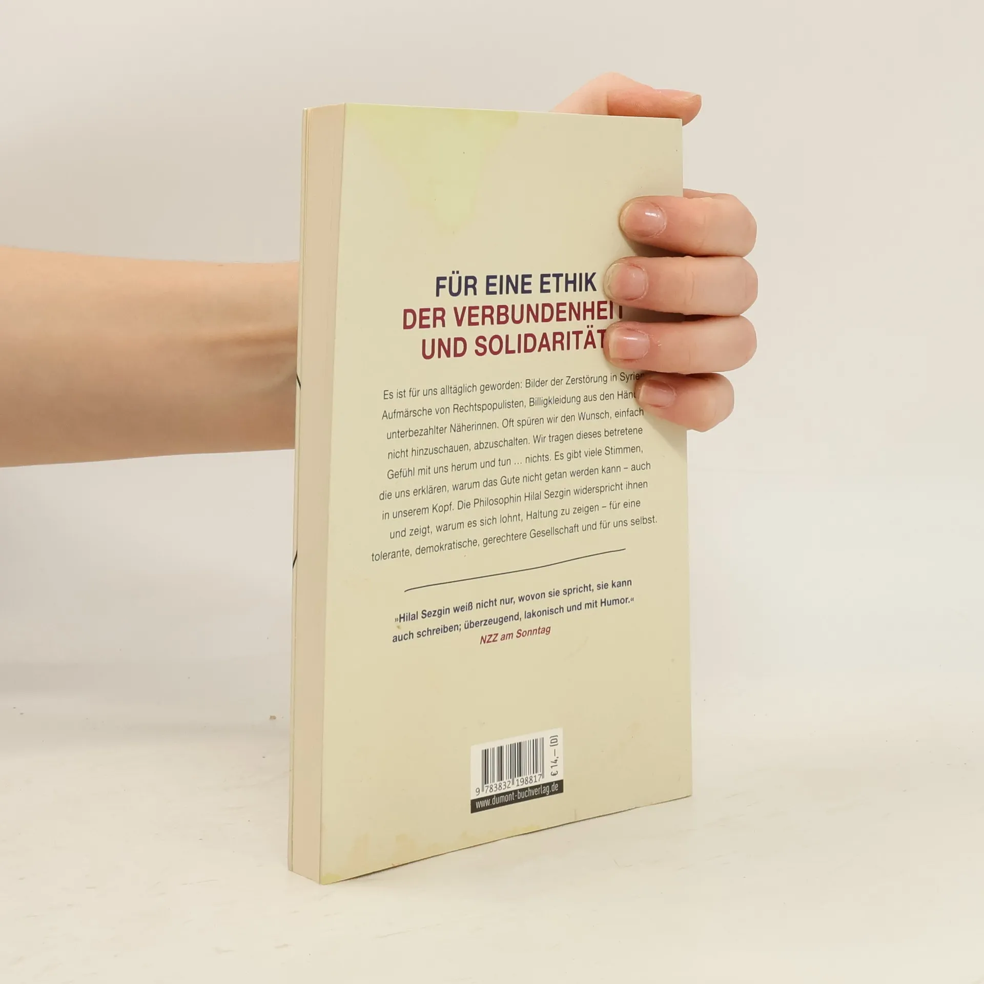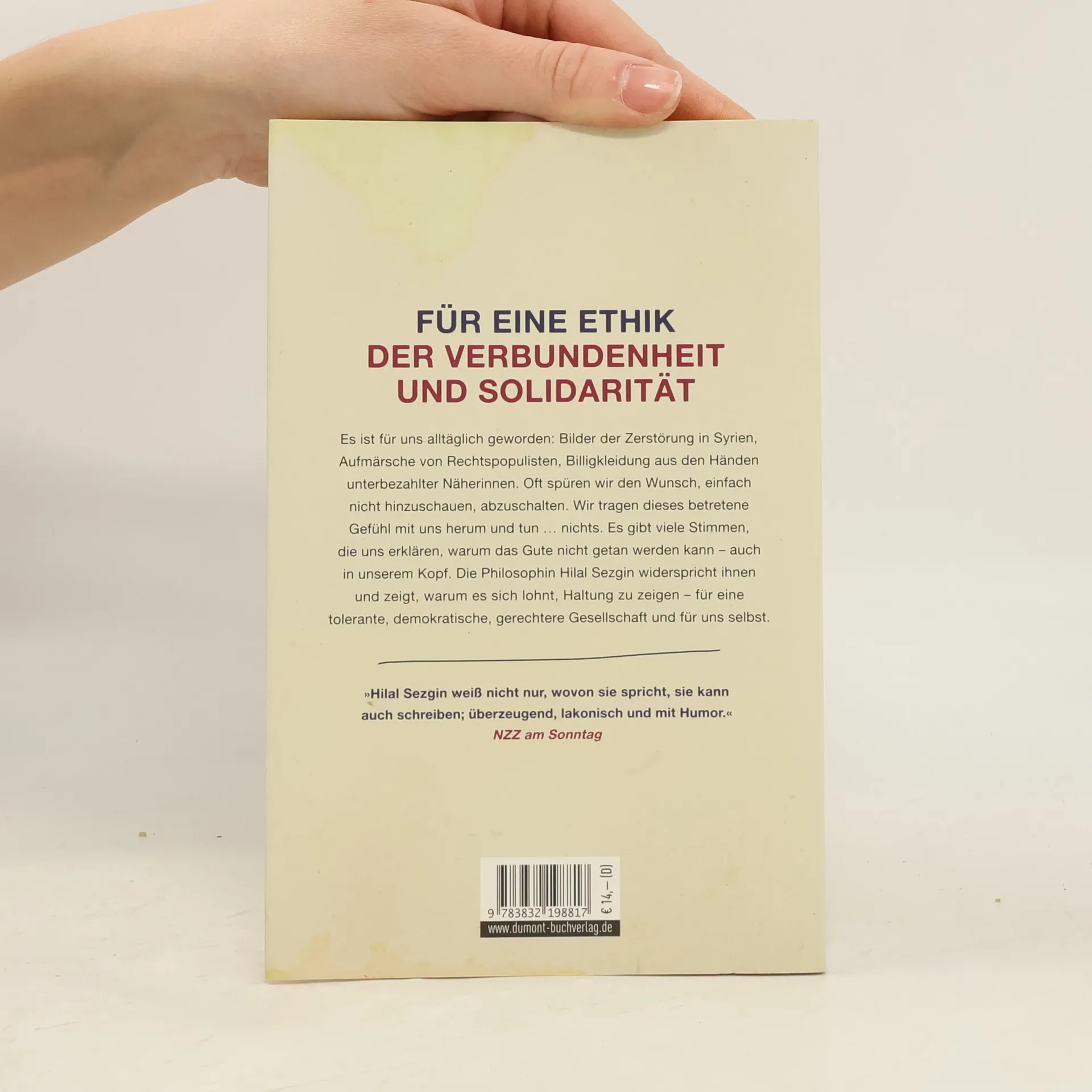 Es ist für uns alltäglich geworden: Bilder von in Syrien ermordeten oder im Mittelmeer ertrunkenen Kindern, Aufmärsche von Rechtspopulisten, Billigkleidung aus den Händen unterbezahlter Näherinnen. Oft spüren wir den Wunsch, einfach nicht hinzuschauen, abzuschalten. Wir tragen dieses betretene Gefühl mit uns herum, und tun oft … nichts. Weil wir glauben, die Diskussionen lohnen doch nicht. Aber auch weil wir wissen, dass wir anecken und als Weltverbesserer verunglimpft werden. Wer kritisiert und sich engagiert, gilt schnell als naiv. Es gibt viele Stimmen, die uns erklären, warum das Gute nicht getan werden kann – auch in unserem Kopf. Die Philosophin Hilal Sezgin widerspricht ihnen und zeigt, warum es sich lohnt, Haltung zu zeigen – für eine tolerante, demokratische, gerechtere Gesellschaft und für uns selbst. Sie plädiert für eine Ethik, in der nicht Rechthaben, Konkurrenz und Verzicht im Vordergrund stehen, sondern gemeinsames Handeln für eine bessere Welt. Kurz: Sie macht dem Leser Mut zur eigenen Courage.