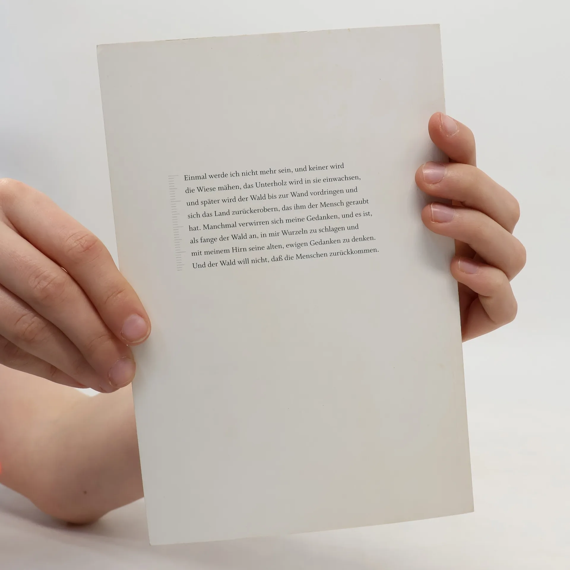 'Verdutzt streckte ich die Hand aus und berührte etwas Glattes und Kühles: einen glatten, kühlen Widerstand an einer Stelle, an der doch gar nichts sein konnte als Luft. Zögernd versuchte ich es noch einmal, und wieder ruhte meine Hand wie auf der Scheibe eines Fensters. Dann hörte ich lautes Pochen und sah um mich, ehe ich begriff, daß es mein eigener Herzschlag war, der mir in den Ohren dröhnte. Mein Herz hatte sich schon gefürchtet, ehe ich es wußte.'