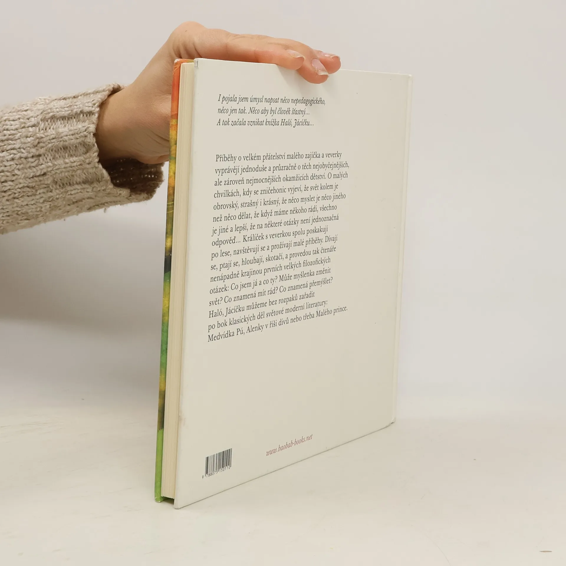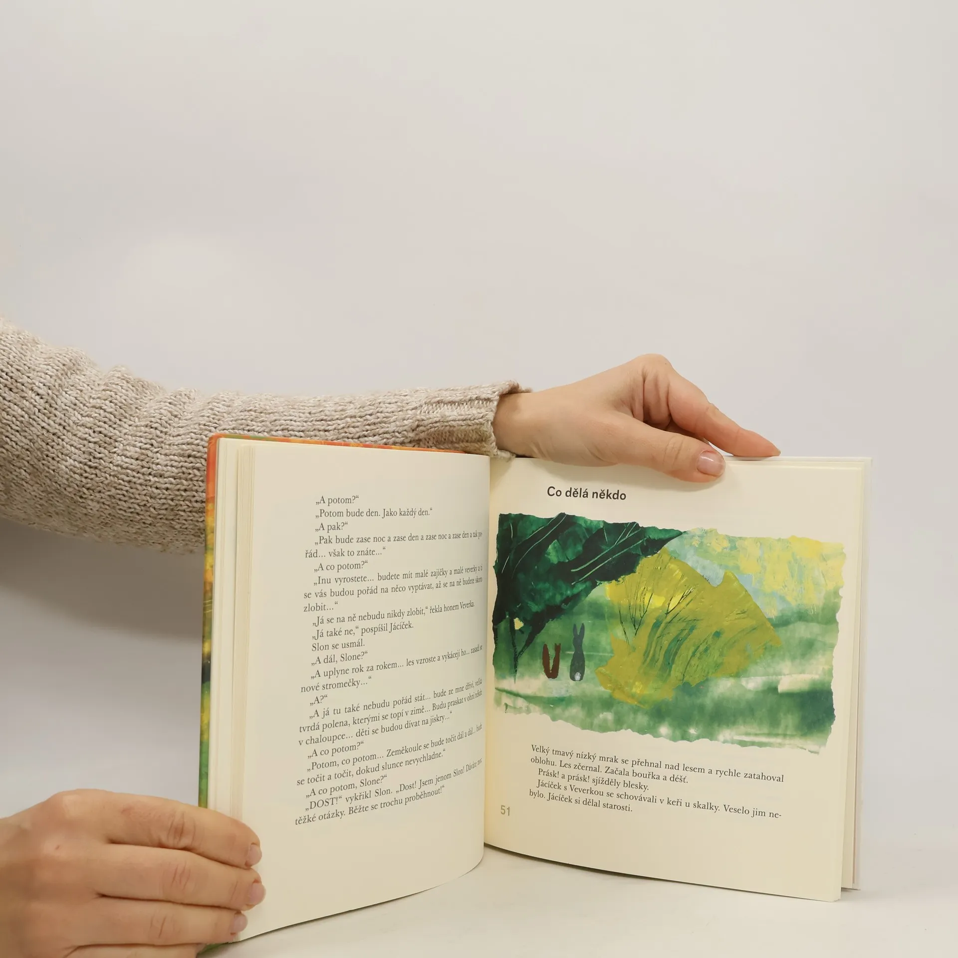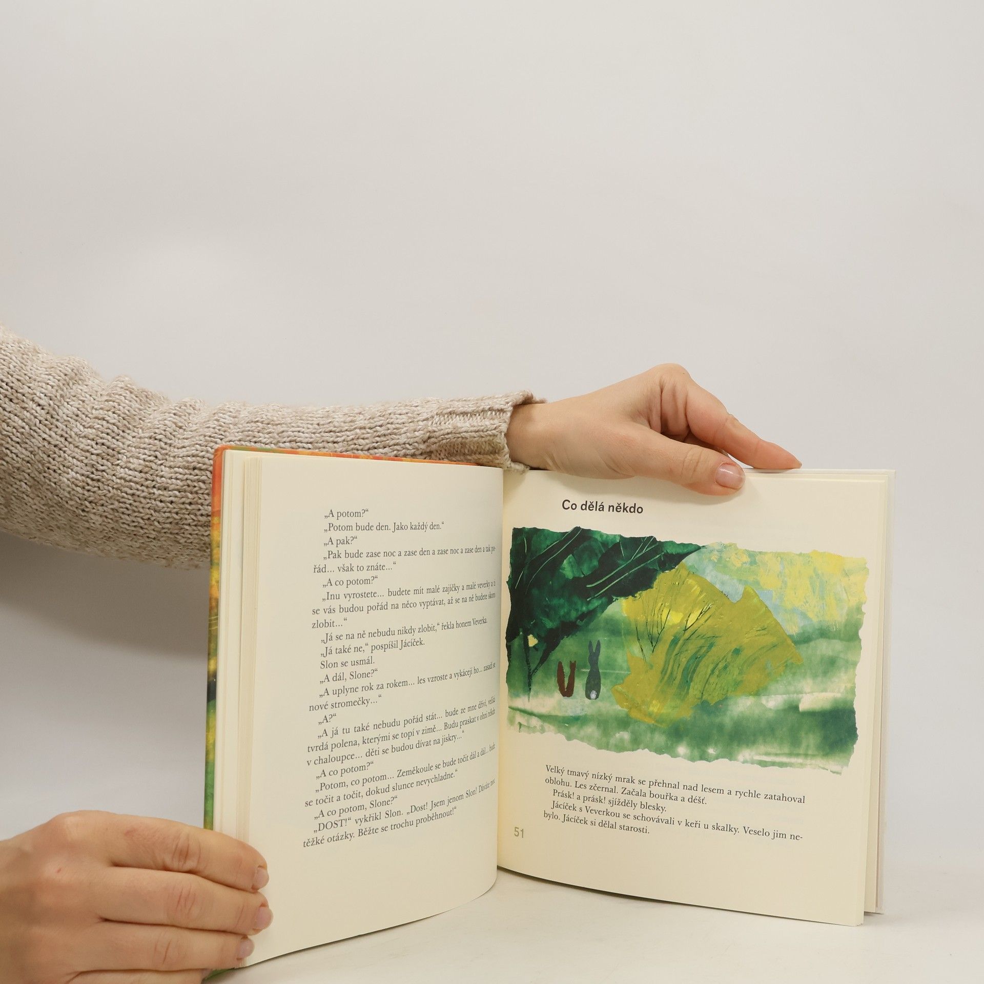 Příběhy o velkém přátelství malého zajíčka a veverky vyprávějí jednoduše a průzračně o těch nejobyčejnějších, ale zároveň nejmocnějších okamžicích dětství. O malých chvilkách, kdy se zničehonic vyjeví, že svět kolem je obrovský, strašný i krásný, že něco myslet je něco jiného než něco dělat, že když máme někoho rádi, všechno je jiné a lepší, že na některé otázky není jednoznačná odpověď.