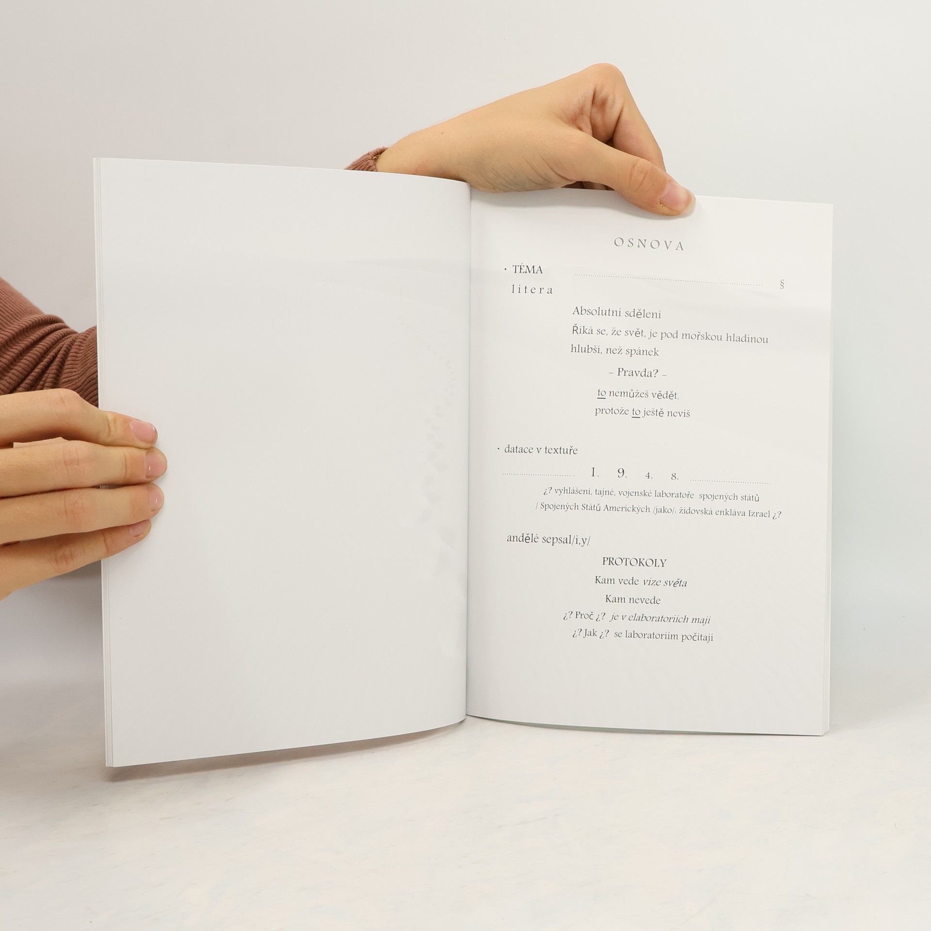 Další z řady autorčiných próz s mysticko-filozofickými ambicemi, komponovaná jako sled útržkovitých, těkavých úvah.