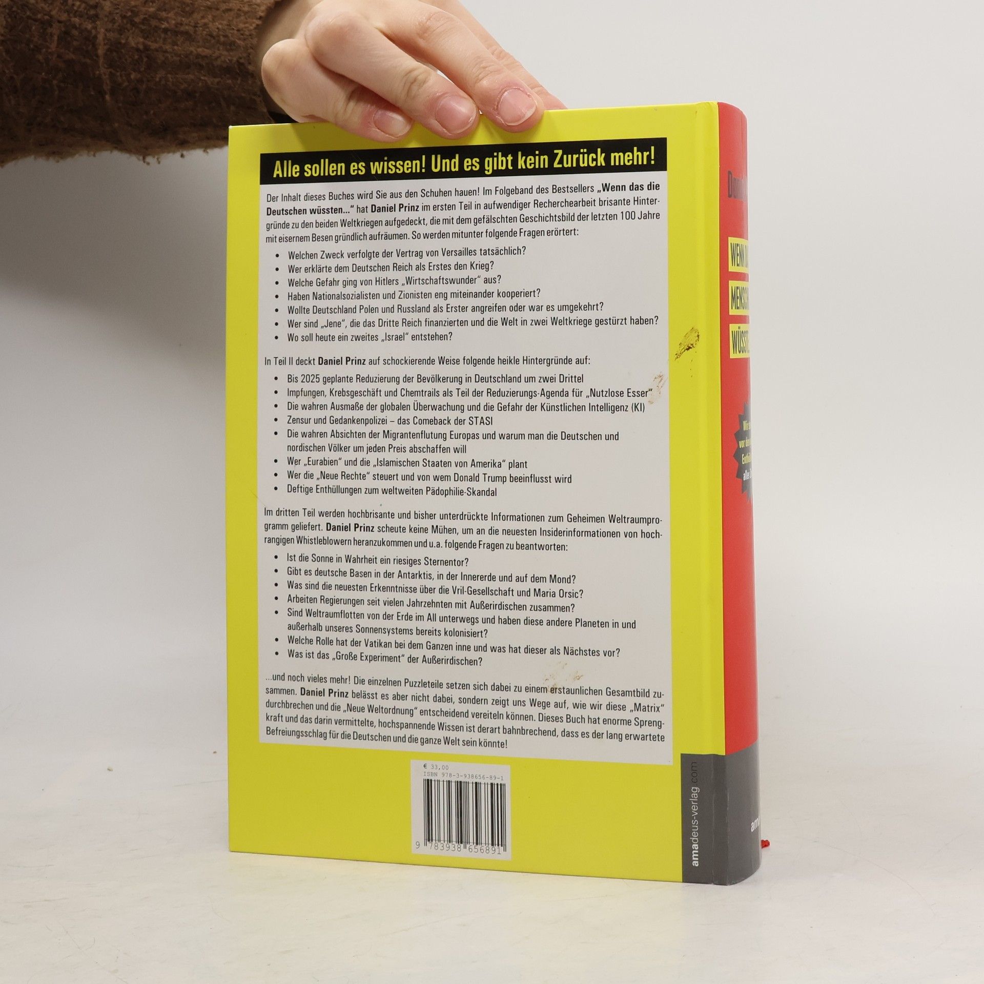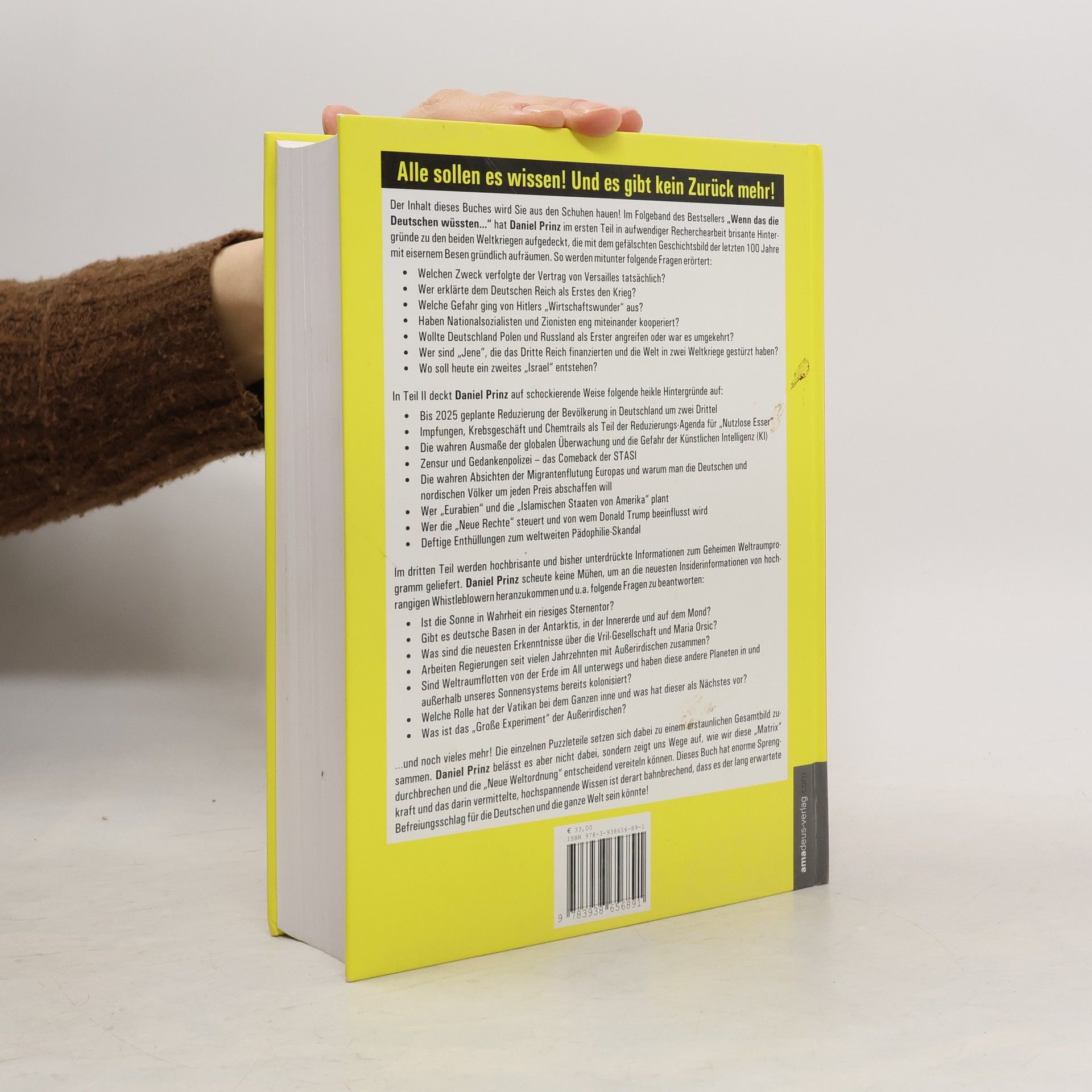 Der neue Blockbuster von Daniel Prinz vereint drei Bände in einem und bietet brisante Einblicke in die Geschichte der beiden Weltkriege sowie aktuelle gesellschaftliche Themen. Im ersten Teil werden durch intensive Recherche zentrale Fragen behandelt, wie die wahren Absichten hinter dem Vertrag von Versailles, die Rolle der Nationalsozialisten und die Verstrickungen zwischen verschiedenen politischen Akteuren. Es wird untersucht, wer das Dritte Reich finanzierte und welche geopolitischen Pläne heute verfolgt werden. Im zweiten Teil werden alarmierende Informationen zur geplanten Bevölkerungskontrolle in Deutschland bis 2025, die Rolle von Impfungen und Chemtrails, sowie die Gefahren globaler Überwachung und Künstlicher Intelligenz präsentiert. Die Themen Zensur, Migration und die Hintergründe der „Neuen Rechten“ werden ebenfalls beleuchtet. Der dritte Teil widmet sich dem geheimen Weltraumprogramm und liefert Informationen über mögliche deutsche Basen auf anderen Himmelskörpern, die Zusammenarbeit mit Außerirdischen und die Rolle des Vatikans. Prinz stellt die Frage, wie wir die „Matrix“ durchbrechen und die drohende „Neue Weltordnung“ aufhalten können. Dieses Buch verspricht, das bestehende Wissen zu revolutionieren und könnte einen entscheidenden Befreiungsschlag für die Menschheit darstellen.