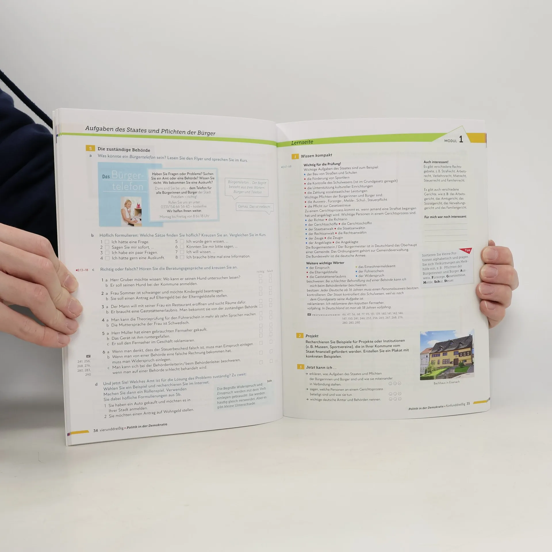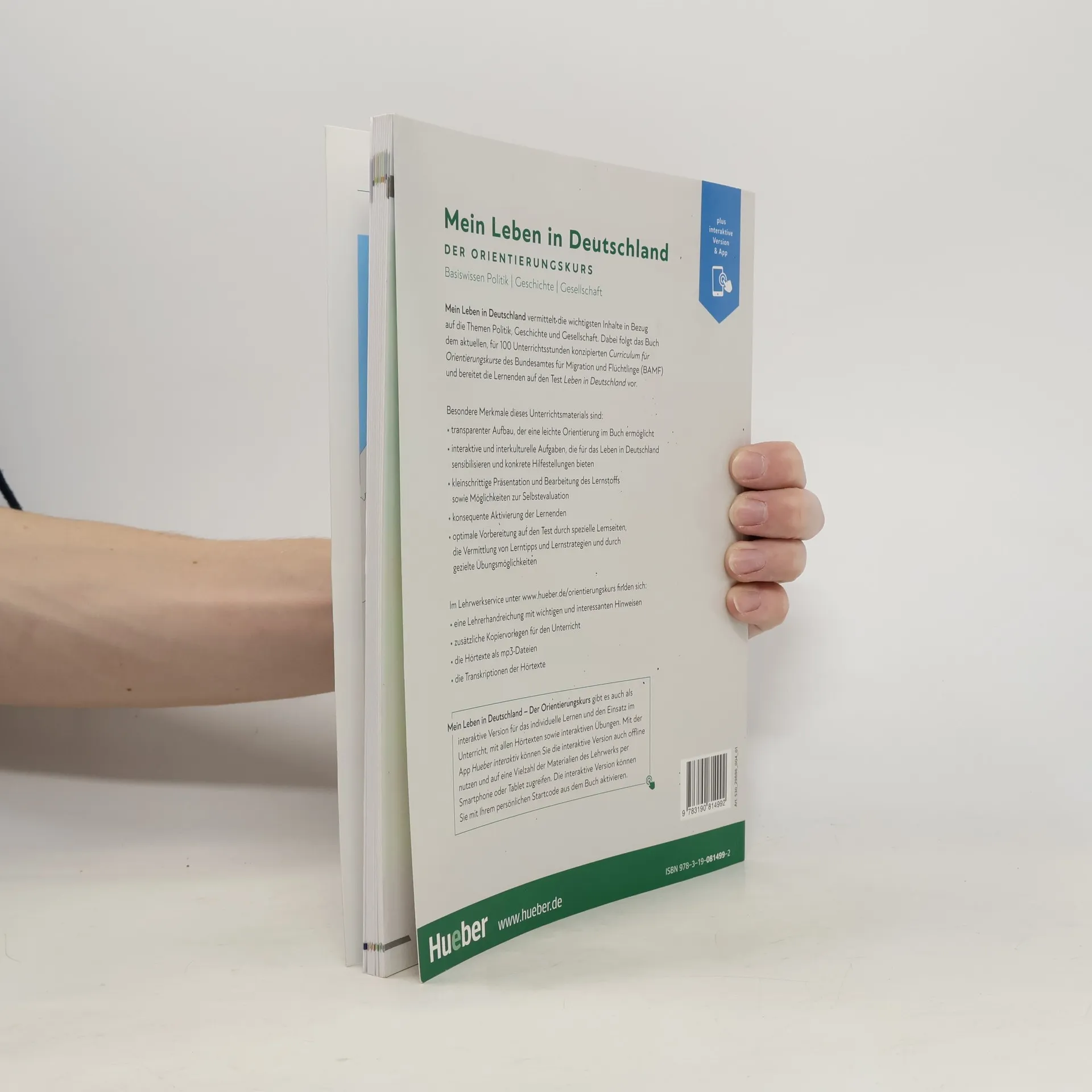 Das Kursbuch enthält interaktive Aufgaben und deren Lösungen. Es dient der Vorbereitung auf die Prüfung "Leben in Deutschland" und folgt dem Curriculum für einen bundesweiten Orientierungskurs, das vom Bundesamt für Migration und Flüchtlinge konzipiert wurde.