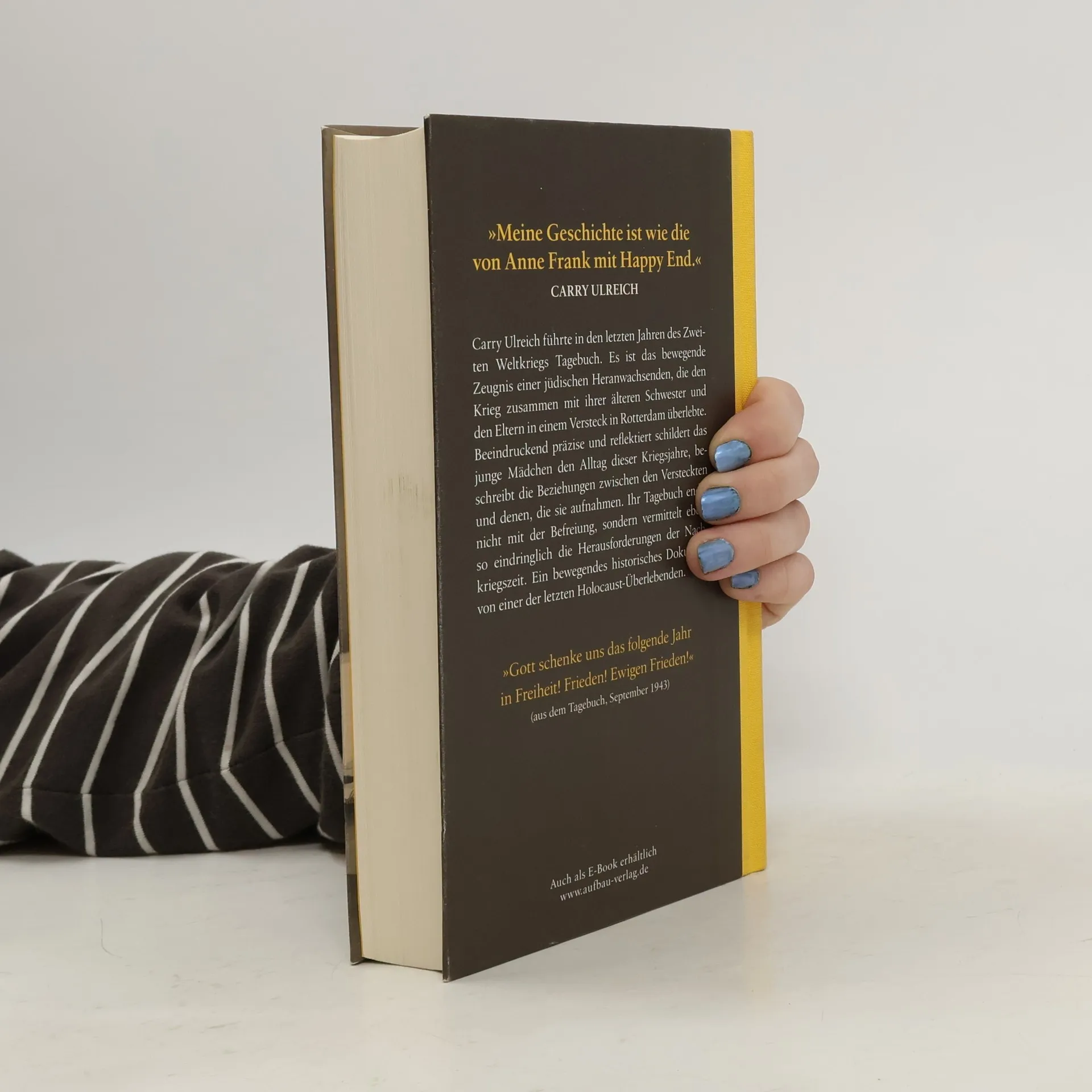 „Meine Geschichte ist wie die von Anne Frank mit Happy End.“ Carry Ulreich Carry Ulreich führte in den letzten Jahren des Zweiten Weltkriegs Tagebuch. Es ist das bewegende Zeugnis einer jüdischen Heranwachsenden, die den Krieg zusammen mit ihrer älteren Schwester und den Eltern in einem Versteck in Rotterdam überlebte. Eine befreundete katholische Familie nahm die Ulreichs aus Nächstenliebe auf. Beeindruckend präzise und reflektiert schildert das junge Mädchen den Alltag dieser Kriegsjahre, beschreibt die Beziehungen zwischen den Versteckten und denen, die sie aufnahmen. Ihr Tagebuch endet nicht mit der Befreiung, sondern vermittelt ebenso eindringlich die Herausforderungen der Nachkriegszeit. Ein bewegendes, historisches Dokument von einer der letzten Holocaust-Überlebenden. „Gott schenke uns das folgende Jahr in Freiheit! Frieden! Ewigen Frieden! Nicht wieder nach ein paar Jahren diesen schrecklichen Krieg mit einem anderen Hitler. Nein, Frieden! Und dass ich klüger werde, mich mehr durchsetze!“ (aus dem Tagebuch, September 1943)