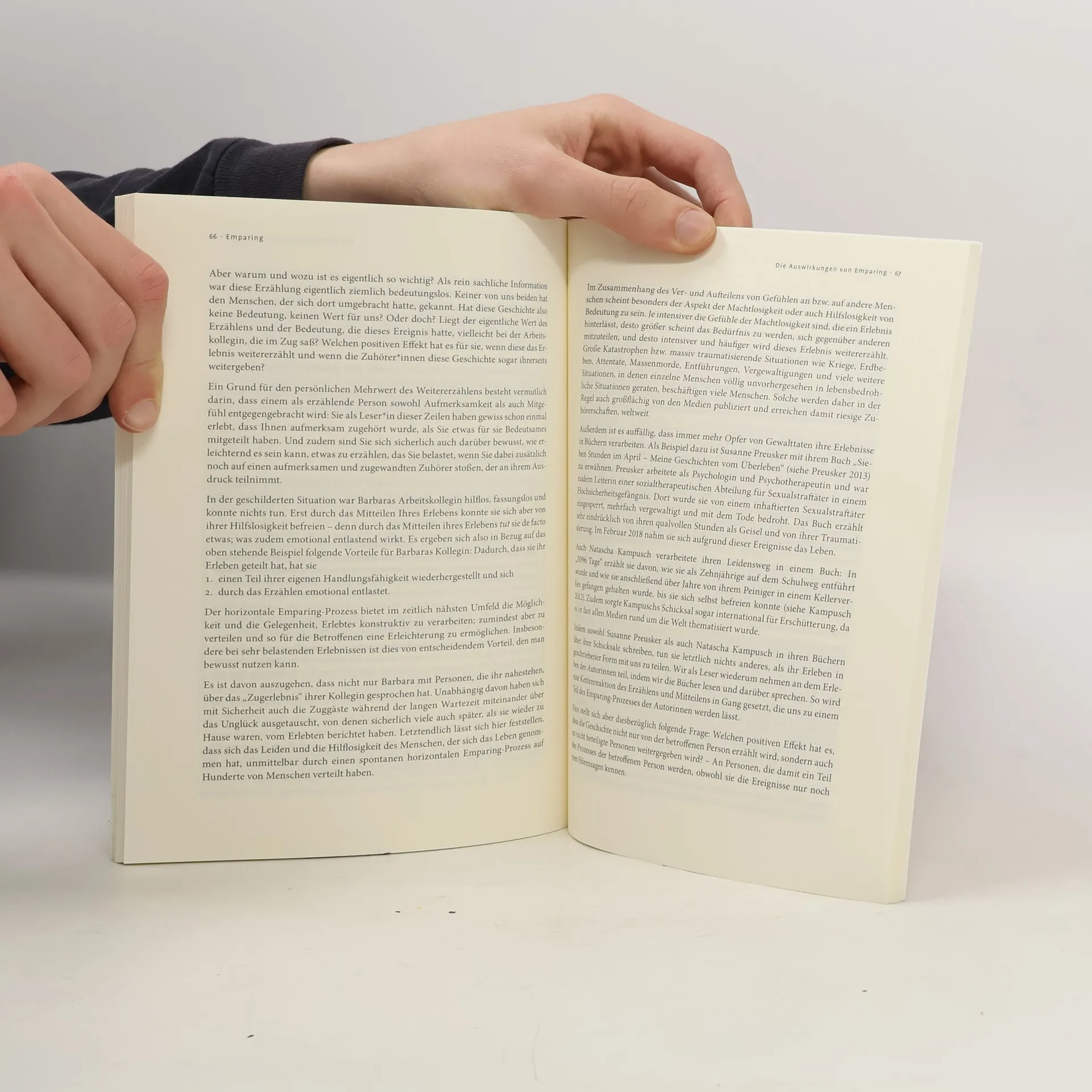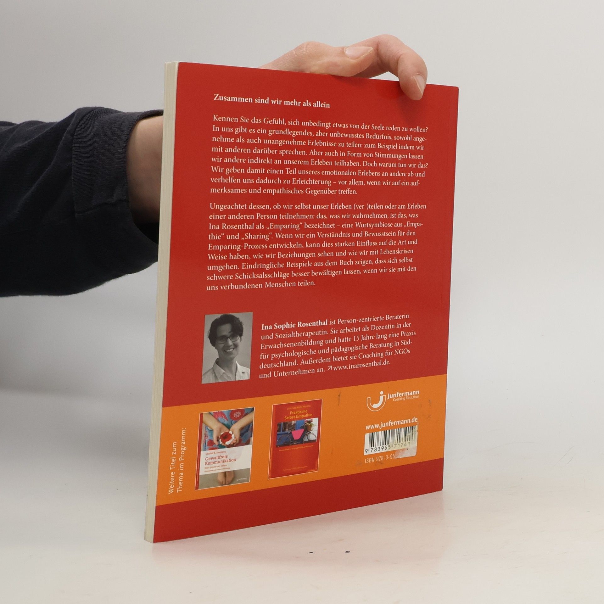 Zusammen sind wir mehr als allein Kennen Sie das Gefühl, sich unbedingt etwas von der Seele reden zu wollen? In uns gibt es ein grundlegendes, aber unbewusstes Bedürfnis, sowohl angenehme als auch unangenehme Erlebnisse zu teilen: zum Beispiel indem wir mit anderen darüber sprechen. Aber auch in Form von Stimmungen lassen wir andere indirekt an unserem Erleben teilhaben. Doch warum tun wir das? Wir geben damit einen Teil unseres emotionalen Erlebens an andere ab und verhelfen uns dadurch zu Erleichterung – vor allem, wenn wir auf ein aufmerksames und empathisches Gegenüber treffen. Ungeachtet dessen, ob wir selbst unser Erleben (ver-)teilen oder am Erleben einer anderen Person teilnehmen: das, was wir wahrnehmen, ist das, was Ina Rosenthal als „Emparing“ bezeichnet – eine Wortsymbiose aus „Empathie“ und „Sharing“. Wenn wir ein Verständnis und Bewusstsein für den Emparing-Prozess entwickeln, kann dies starken Einfluss auf die Art und Weise haben, wie wir Beziehungen sehen und wie wir mit Lebenskrisen umgehen. Eindringliche Beispiele aus dem Buch zeigen, dass sich selbst schwere Schicksalsschläge besser bewältigen lassen, wenn wir sie mit den uns verbundenen Menschen teilen.
