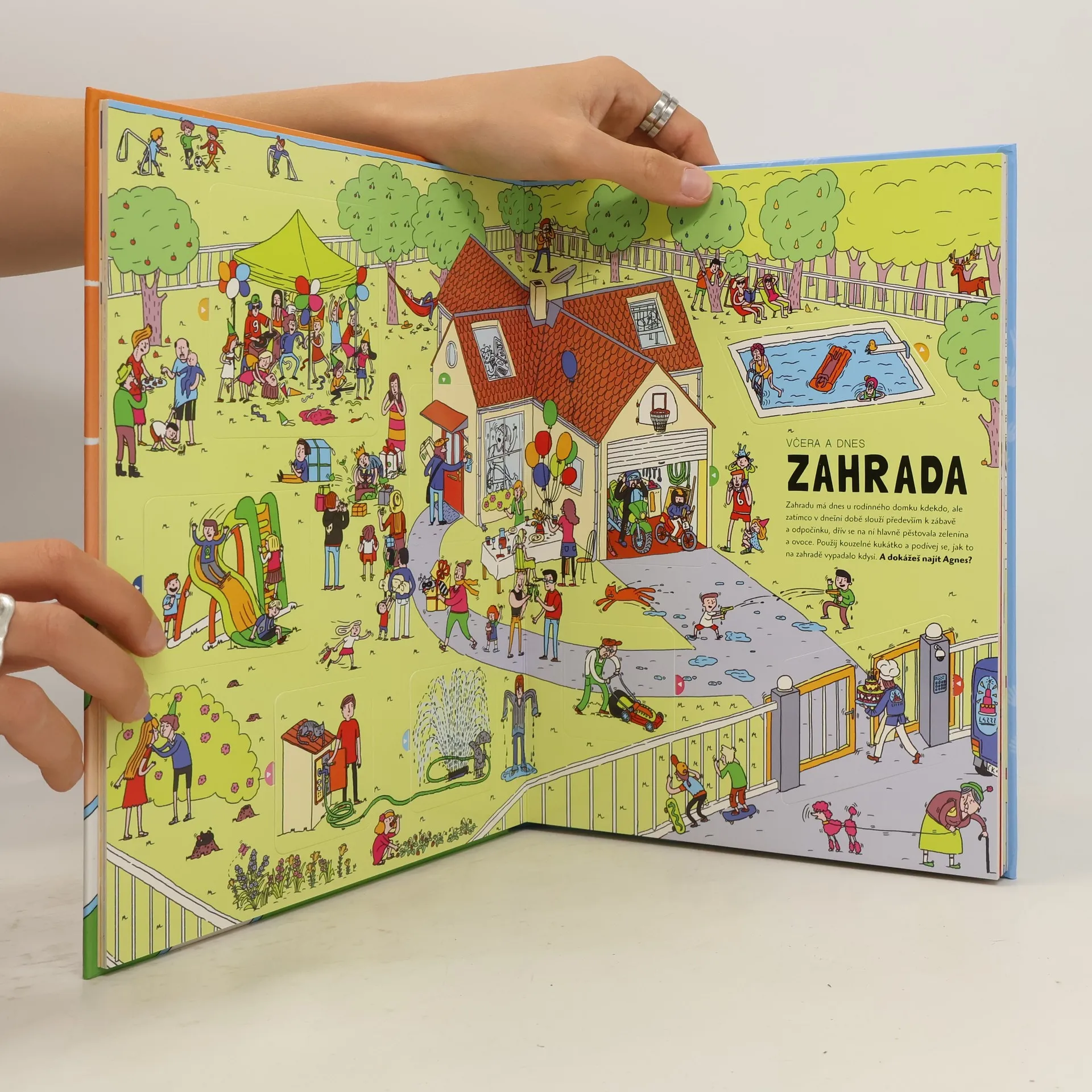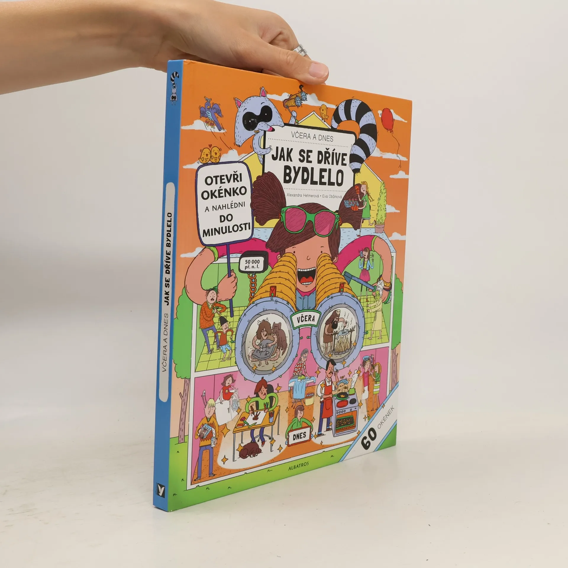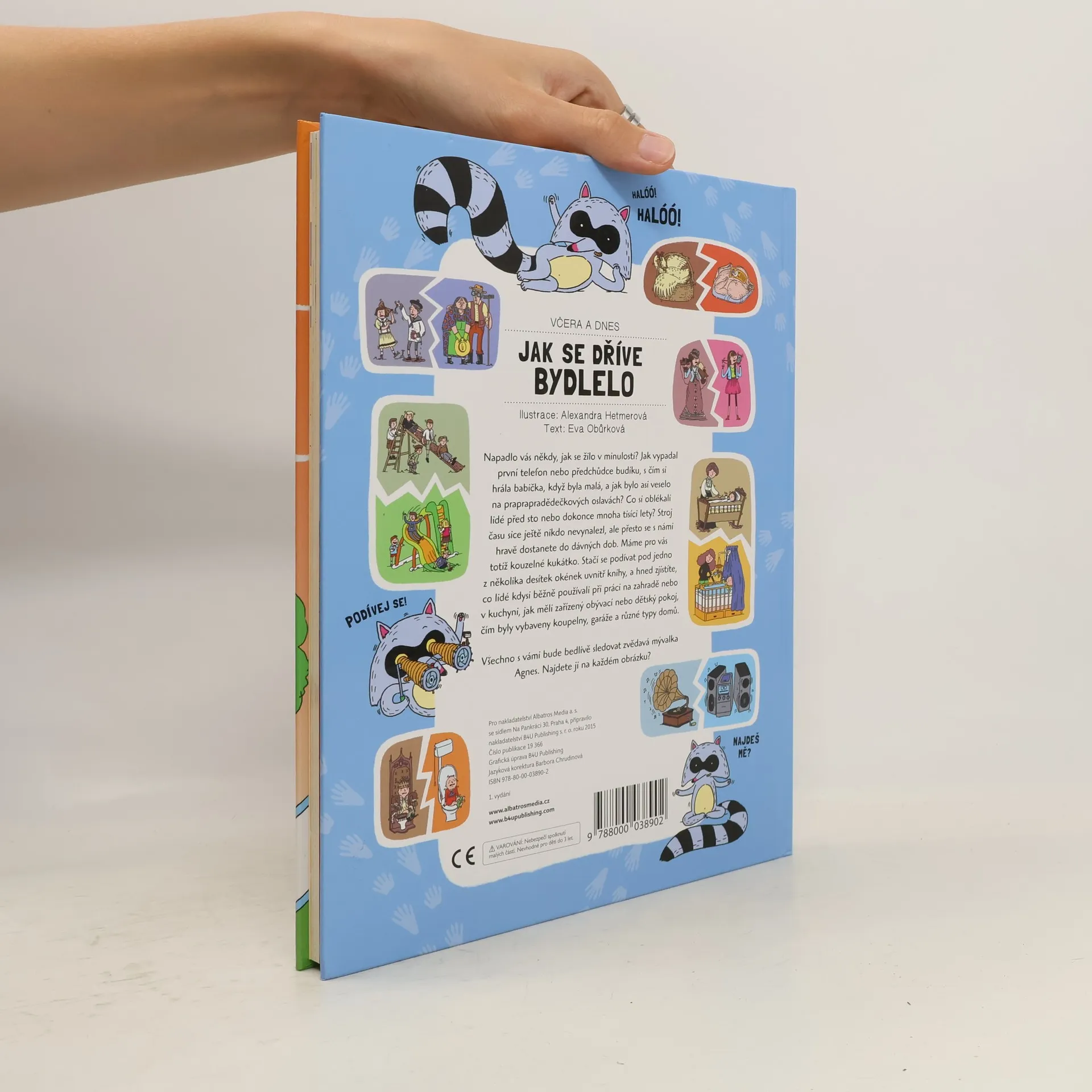 Napadlo vás někdy, jak se žilo v minulosti? Jak vypadal první telefon nebo předchůdce budíku, s čím si hrála babička, když byla malá, a jak bylo asi veselo na praprapradědečkových oslavách? Co si oblékali lidé před sto nebo dokonce mnoha tisíci lety? Stroj času sice ještě nikdo nevynalezl, ale přesto se s námi hravě dostanete do dávných dob. Máme pro vás totiž kouzelné kukátko. Stačí se podívat pod jedno z několika desítek okének uvnitř knihy, a hned zjistíte, co lidé kdysi běžně používali při práci na zahradě nebo v kuchyni, jak měli zařízený obývací nebo dětský pokoj, čím byly vybaveny koupelny, garáže a různé typy domů. Všechno s vámi bude bedlivě sledovat zvědavá mývalka Agnes. Najdete ji na každém obrázku?