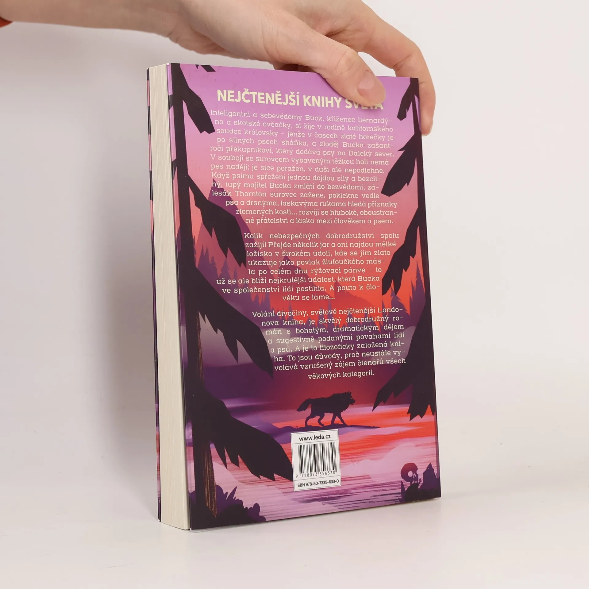 Inteligentní a sebevědomý Buck, kříženec bernardýna a skotské ovčačky, si žije v rodině kalifornského soudce královsky – jenže v časech zlaté horečky je po silných psech sháňka, a zloděj Bucka zašantročí překupníkovi, který dodává psy na Daleký sever. V souboji se surovcem vybaveným těžkou holí nemá pes naději: je sice poražen, v duši ale nepodlehne. Když psímu spřežení jednou dojdou síly a bezcitný, tupý majitel Bucka zmlátí do bezvědomí, zálesák Thornton surovce zažene, poklekne vedle psa a drsnýma, laskavýma rukama hledá příznaky zlomených kostí… rozvíjí se hluboké, oboustranné přátelství a láska mezi člověkem a psem. Kolik nebezpečných dobrodružství spolu zažijí! Přejde několik jar a oni najdou mělké ložisko v širokém údolí, kde se jim zlato ukazuje jako povlak žluťoučkého másla po celém dnu rýžovací pánve – to už se ale blíží nejkrutější událost, která Bucka ve společenství lidí postihla. A pouto k člověku se láme… Volání divočiny, světově nejčtenější Londonova kniha, je skvělý dobrodružný román s bohatým, dramatickým dějem a sugestivně podanými povahami lidí a psů. A je to filozoficky založená kniha. To jsou důvody, proč neustále vyvolává vzrušený zájem čtenářů všech věkových kategorií.
