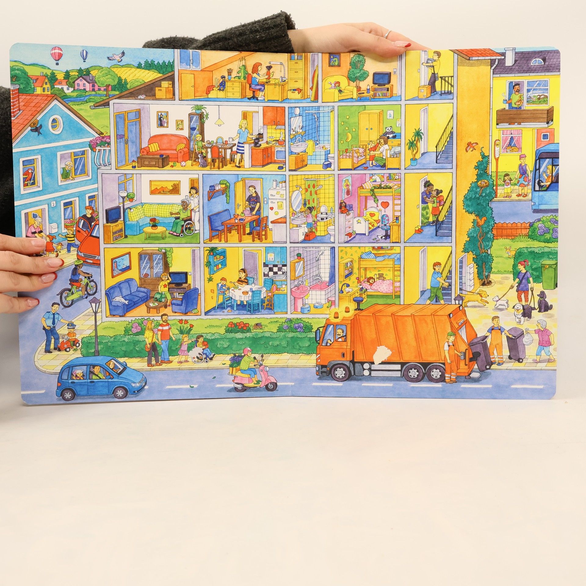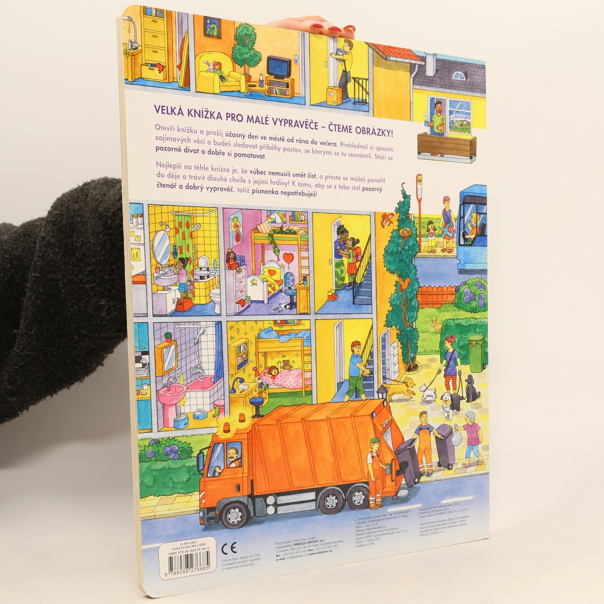 Velká knížka pro malé vypravěče - čteme obrázky! Otevři knížku a prožij úžasný den ve městě od rána do večera. Prohlédneš si spoustu zajímavých věcí a budeš sledovat příběhy postav, se kterými se tu seznámíš. Stačí se pozorně dívat a dobře si pamatovat. Nejlepší na téhle knížce je, že vůbec nemusíš umět číst, a přesto se můžeš ponořit do děje a trávit dlouhé chvíle s jejími hrdiny! K tomu, aby se z tebe stal pozorný čtenář a dobrý vypravěč, totiž písmenka nepotřebuješ!