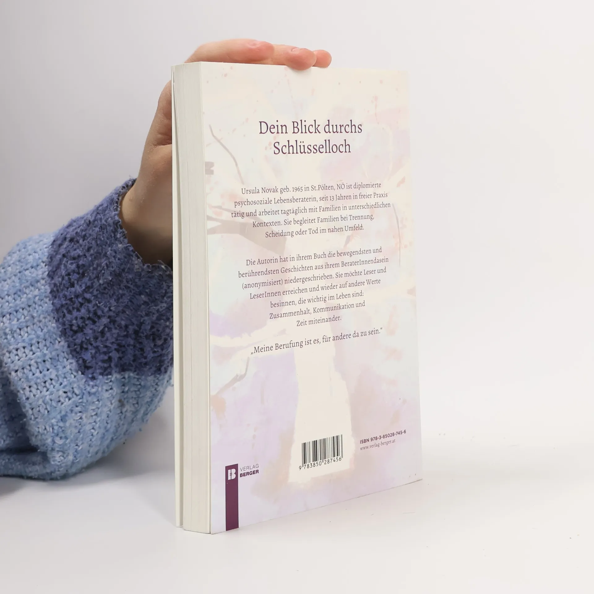 Ursula Novak geb. 1965 in St. Pölten, NÖ ist diplomierte psychosoziale Lebensberaterin, seit 13 Jahren in freier Praxis tätig und arbeitet tagtäglich mit Familien in unterschiedlichen Kontexten. Sie begleitet Familien bei Trennung, Scheidung oder Tod im nahen Umfeld. Die Autorin hat in ihrem Buch die bewegendsten und berührendsten Geschichten aus ihrem BeraterInnendasein (anonymisiert) niedergeschrieben. Sie möchte Leser und LeserInnen erreichen und wieder auf andere Werte besinnen, die wichtig sind im Leben: Zusammenhalt, Kommunikation und Zeit miteinander. „Meine Berufung ist es, für andere da zu sein.“