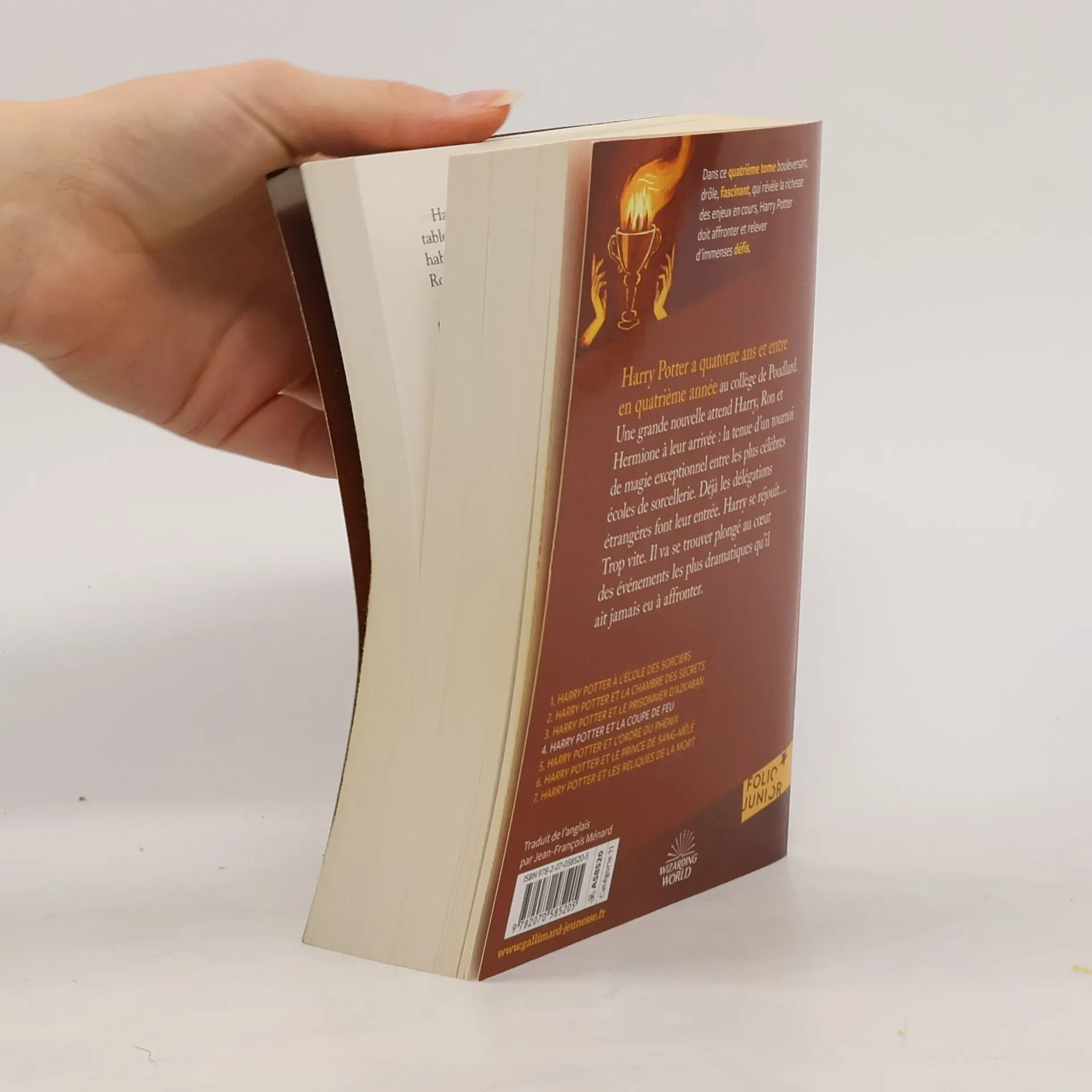 Réédition. Quatrième volet de cette saga à succès mondial qui captive un large lectorat. À quatorze ans, Harry est hanté par des cauchemars où il semble se connecter à Voldemort, laissant craindre son retour. Cette inquiétude se renforce lorsque des Mangemorts perturbent la finale de la Coupe du monde de Quidditch en faisant apparaître la marque du Seigneur des Ténèbres. Malgré la panique, Harry, Hermione et Ron commencent leur quatrième année à Poudlard, qui s'annonce chargée avec de nouveaux cours, dont la divination avec l'excentrique Trelawney, et de nouveaux professeurs, comme l'inquiétant Maugrey Fol Oeil pour la défense contre les forces du Mal. Poudlard accueille également le Tournoi des Trois Sorciers, une compétition légendaire dont les participants sont choisis par la mythique Coupe de Feu. Étrangement, Harry, bien qu'il n'ait pas l'âge requis de 17 ans, est sélectionné. Ron, le croyant coupable de tricherie, s'éloigne de lui, tandis qu'Hermione se consacre à la défense des droits des elfes. Harry doit se préparer à affronter de terribles épreuves... [SDM]